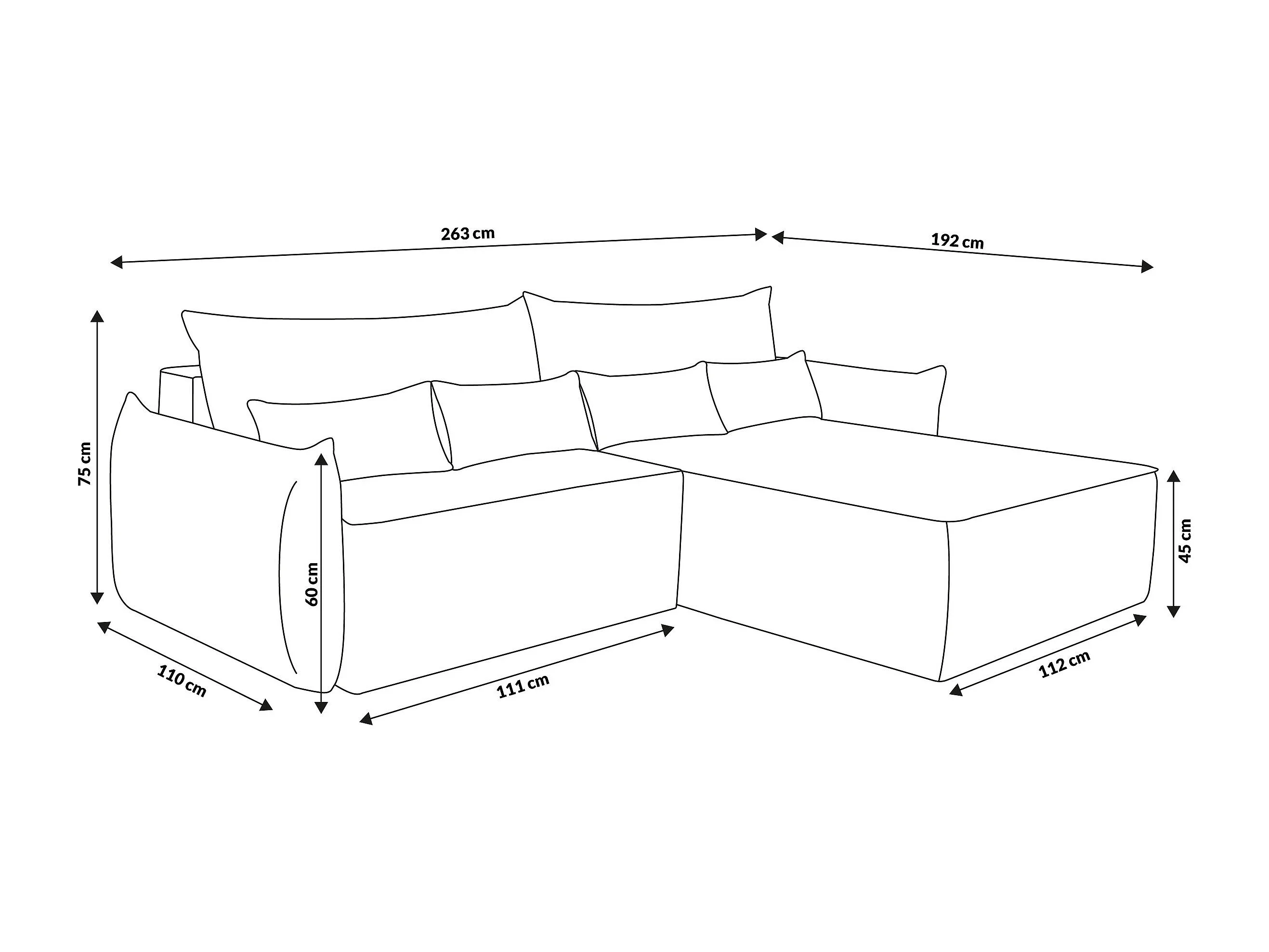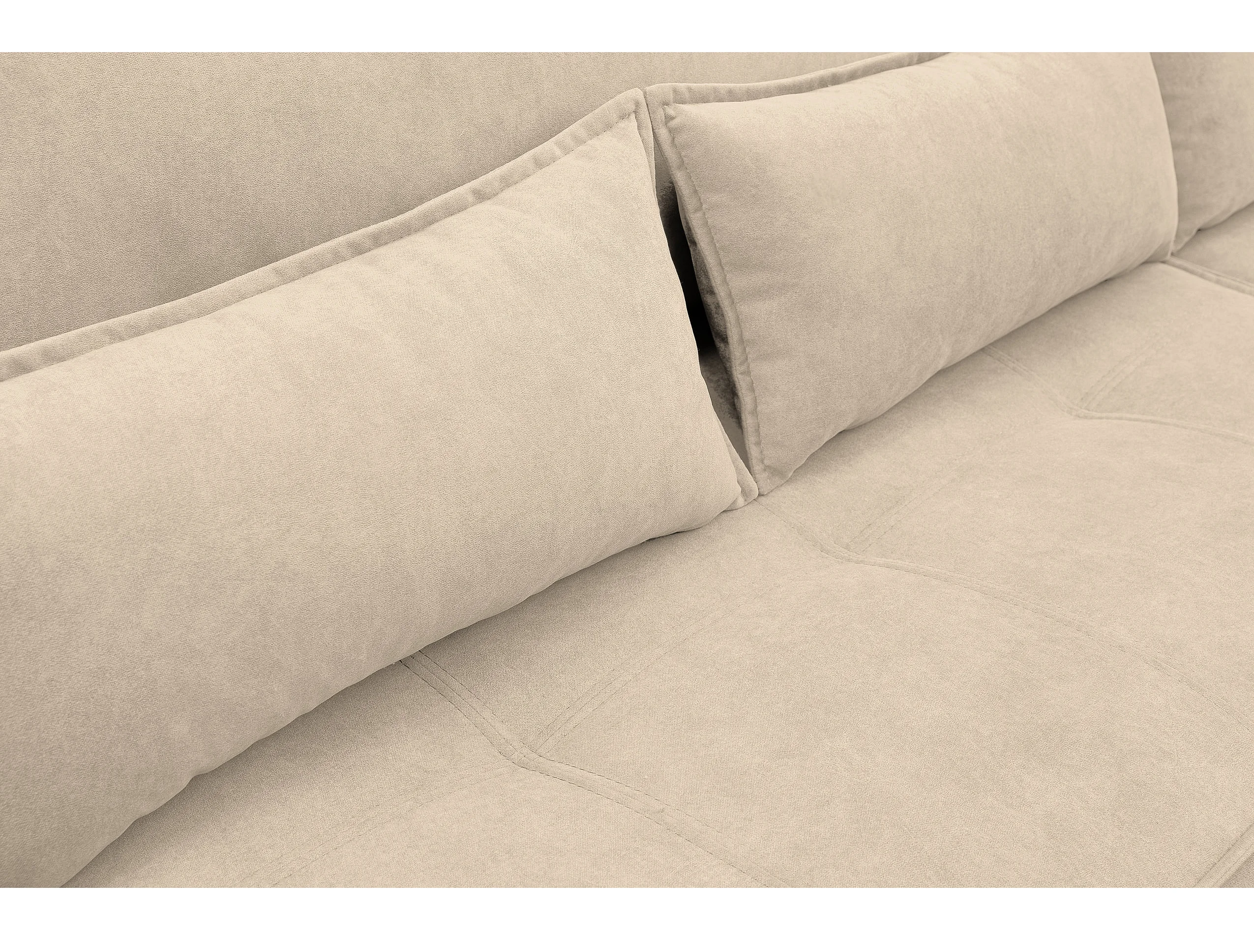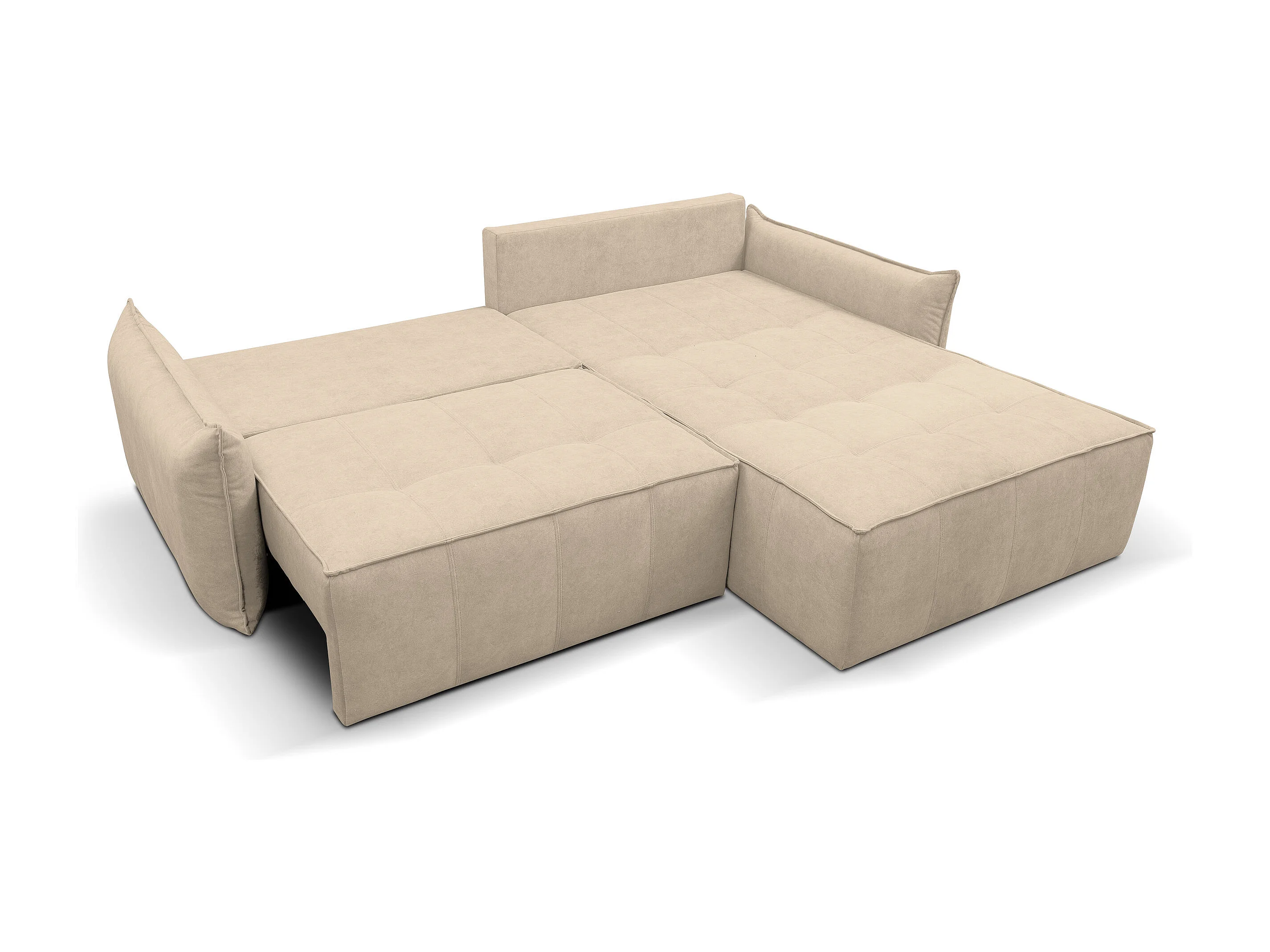 Canapé d'angle Empoli avec fonction couchage et coffre de rangement, couleur : beige, tissu velours, pouf à droite