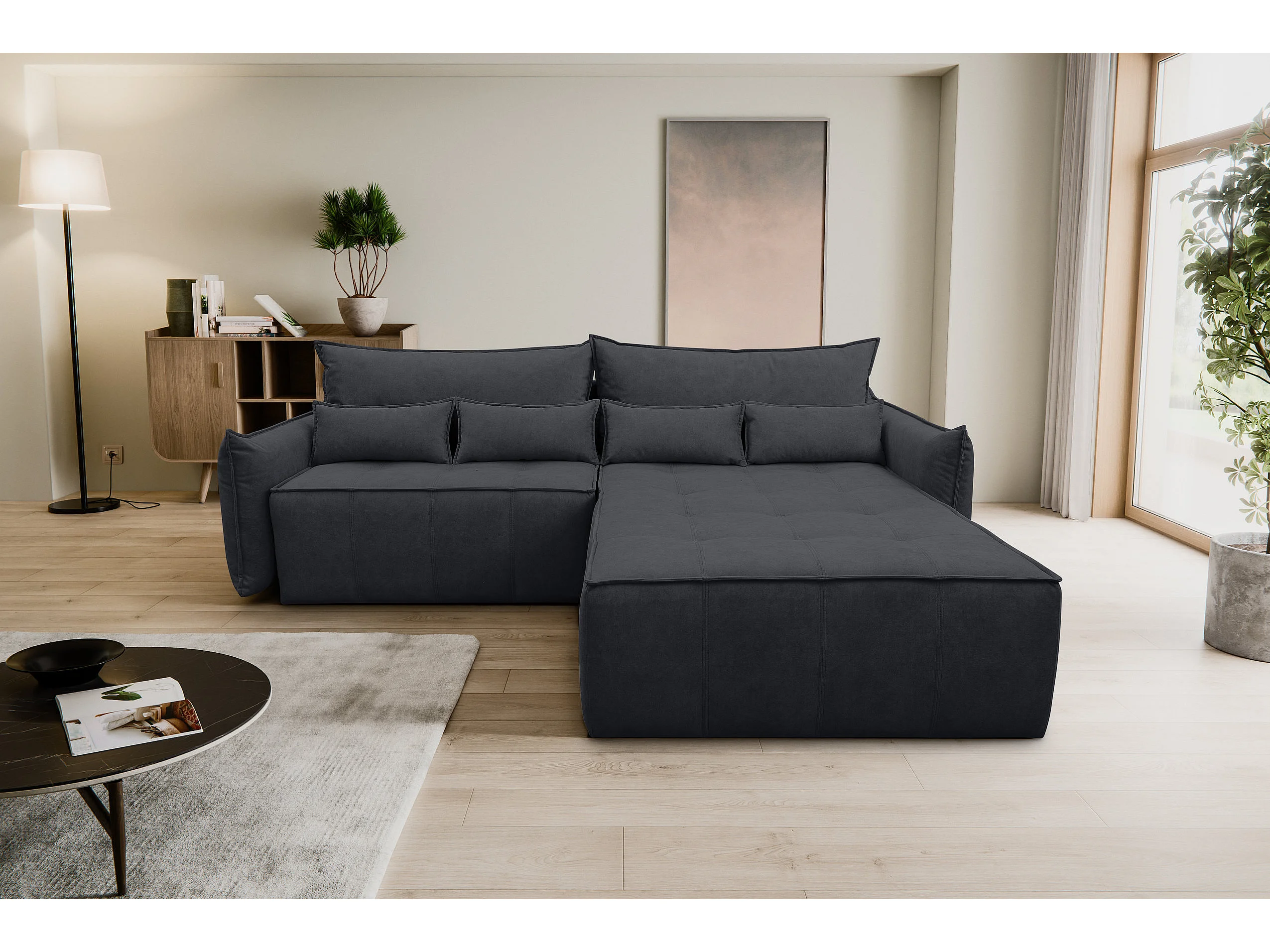 Canapé d'angle Empoli avec fonction couchage et coffre de rangement, couleur : gris foncé, tissu velours, pouf à droite