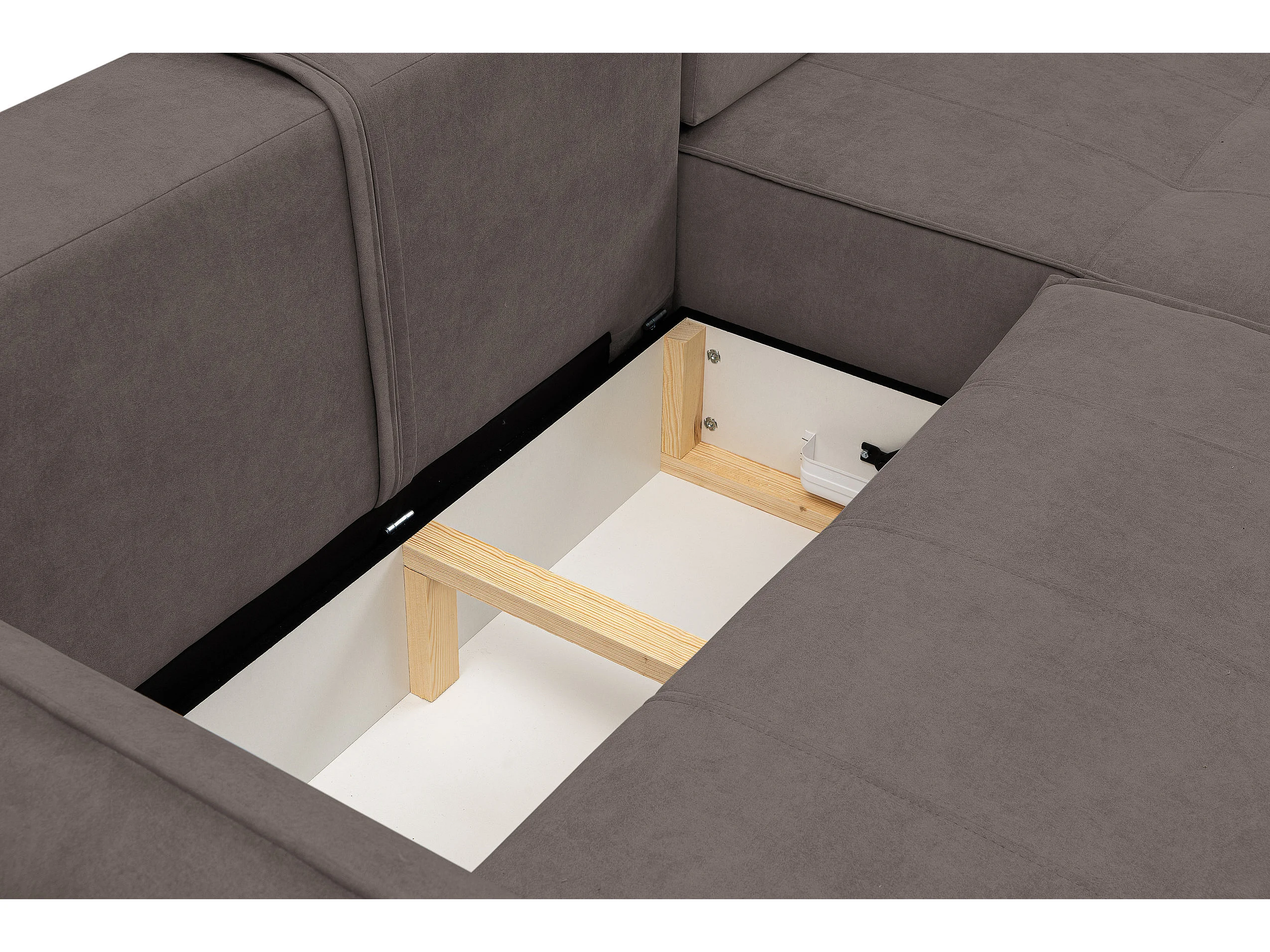 Canapé d'angle Empoli avec fonction couchage et coffre de rangement, couleur : marron, tissu velours, pouf à droite