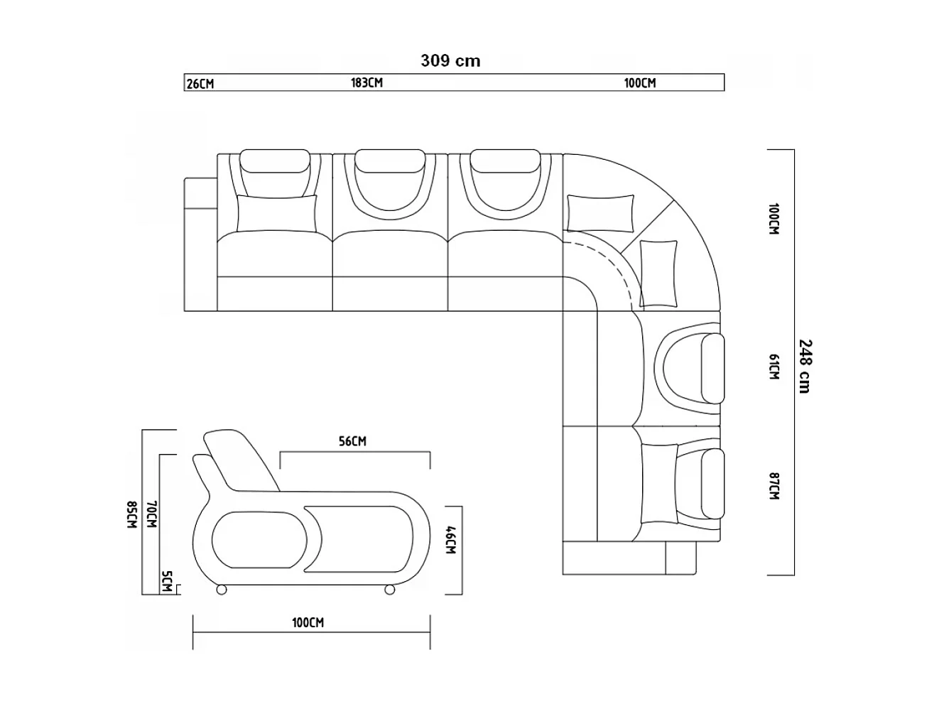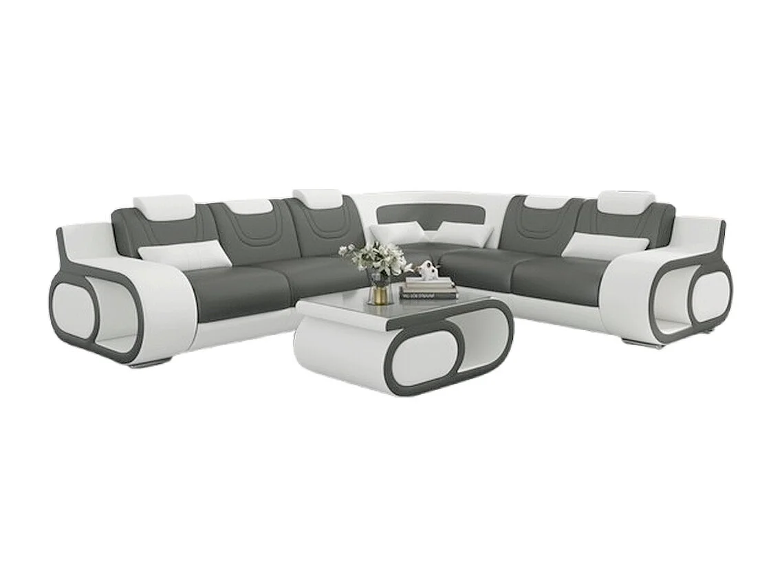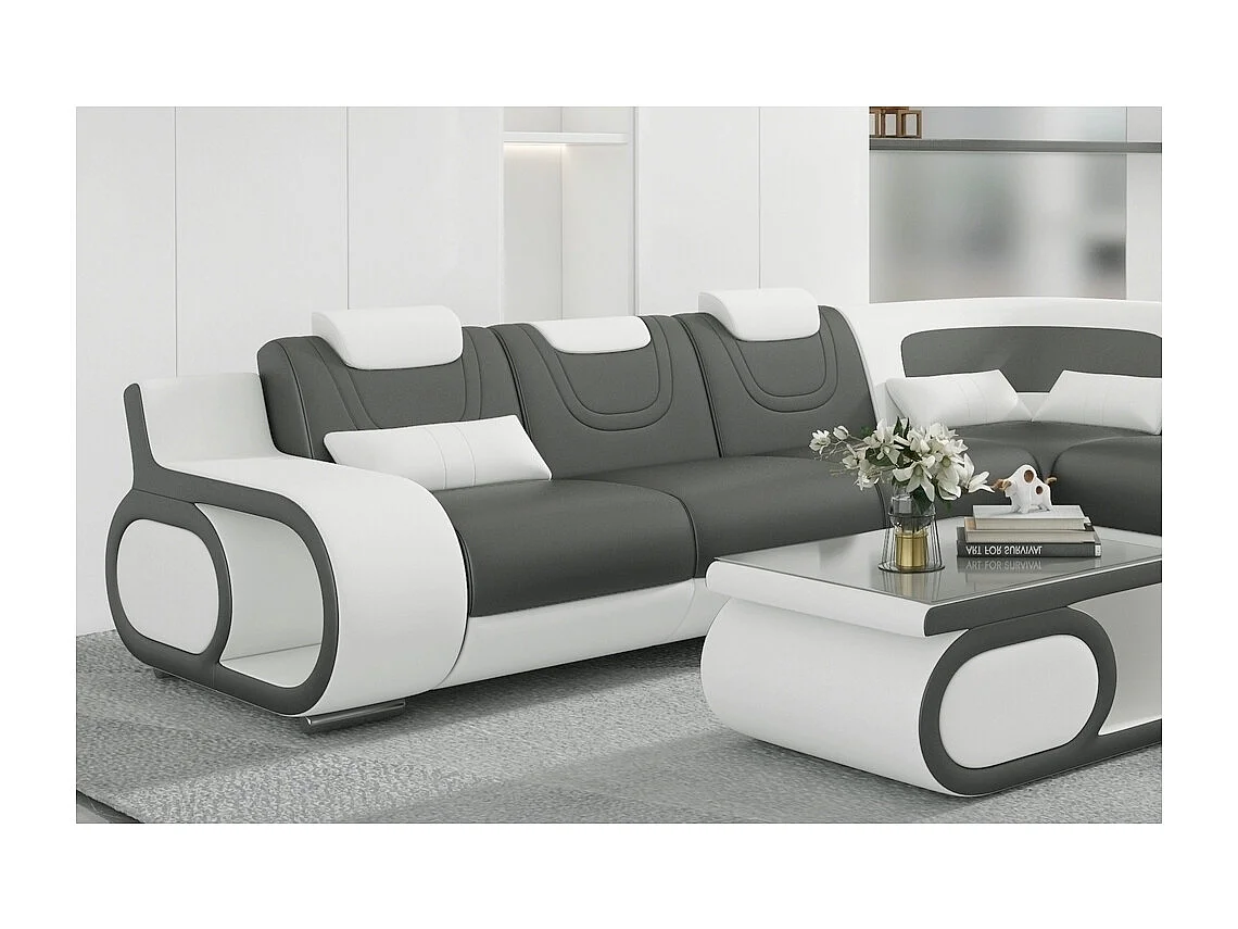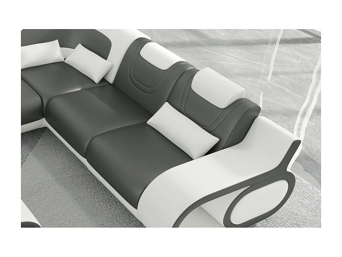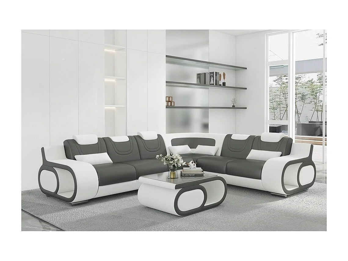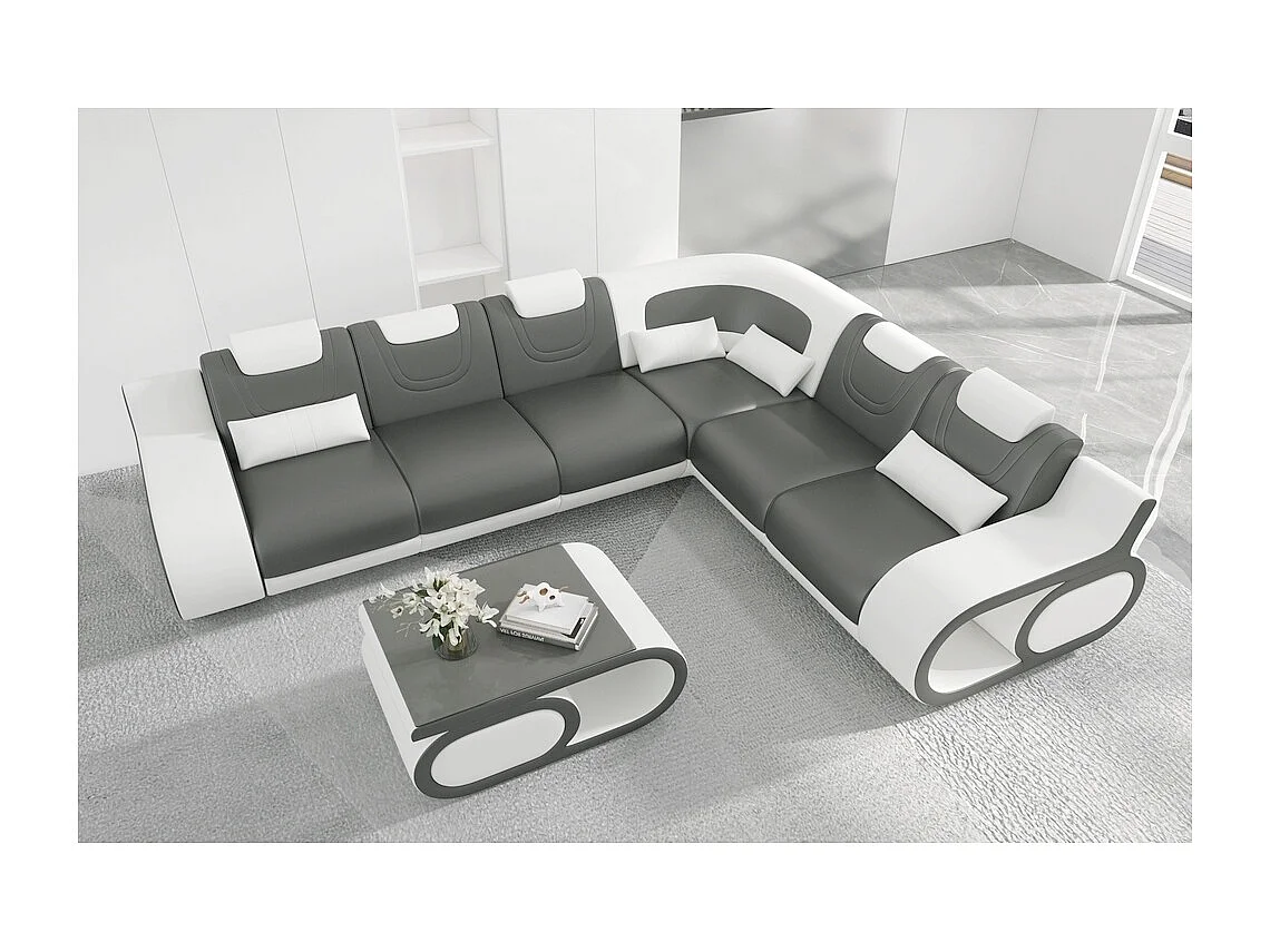 Canapé d'angle en cuir italien 7 places LUXEMBOURG, gris foncé et blanc, angle droit + table