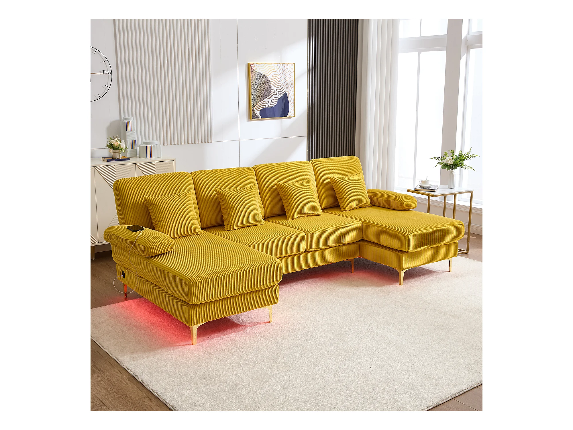Canapé d'angle en velours - Canapé d'angle avec éclairage LED et 4 coussins - port USB et accoudoirs - jaune
