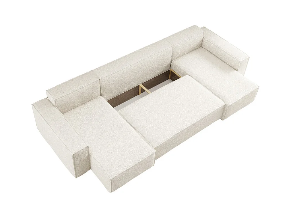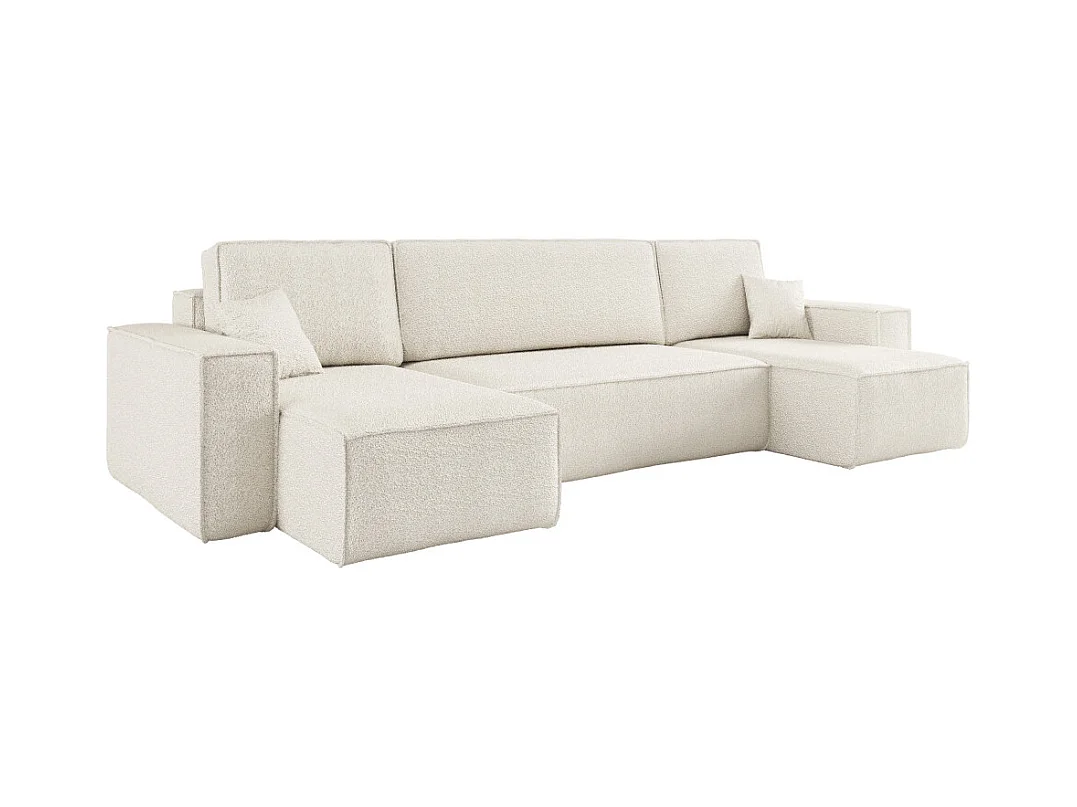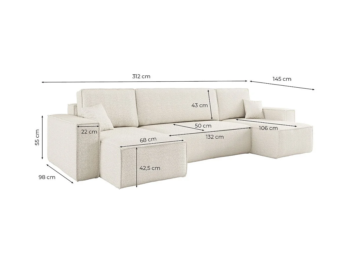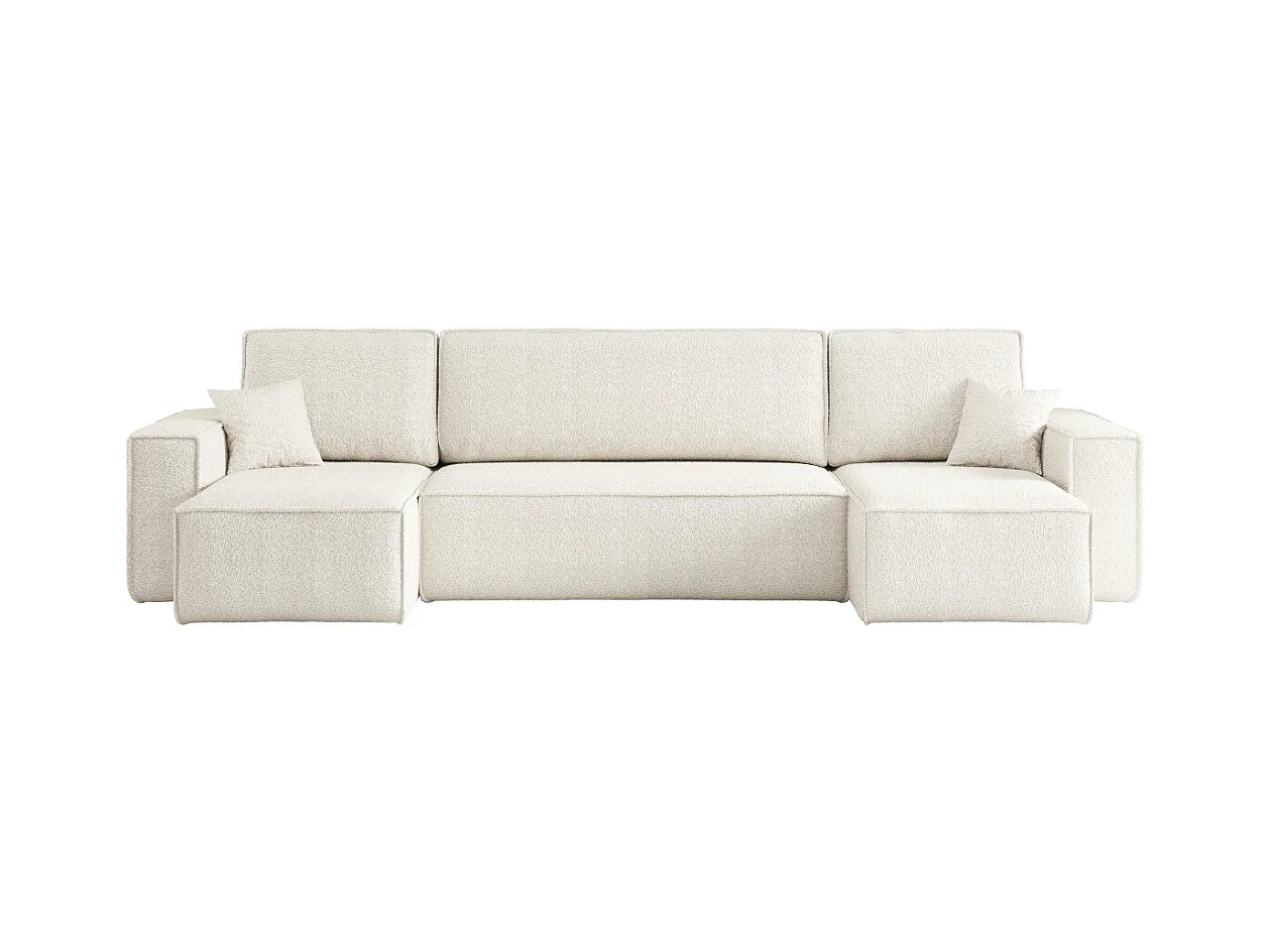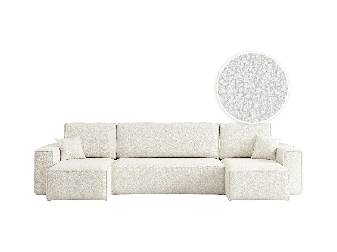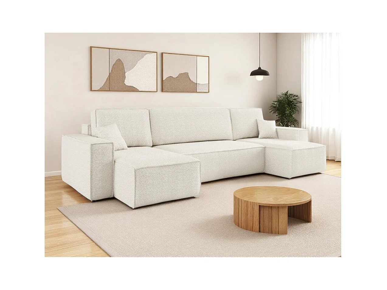 Canapé d'angle FARAH panoramique convertible 6 places en tissu bouclette - Blanc