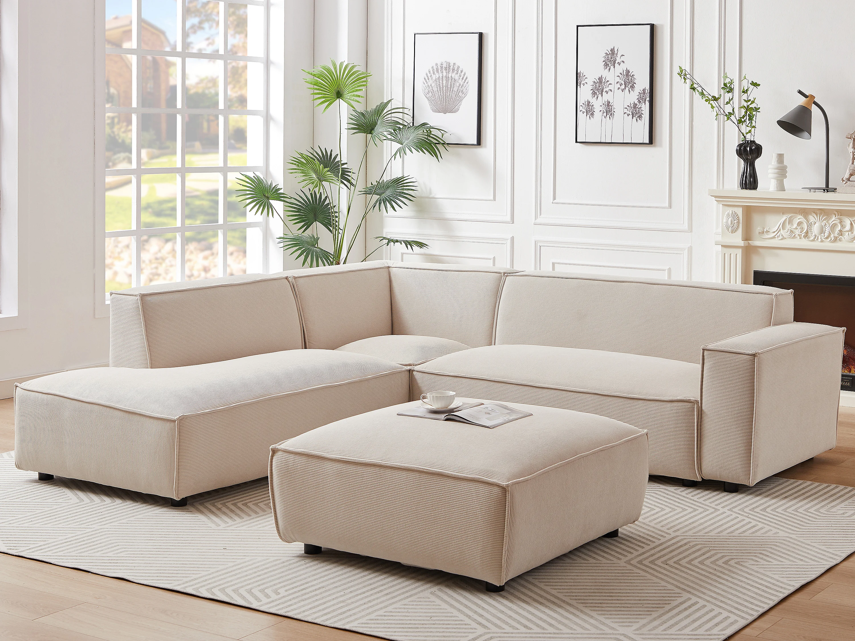 Grand canapé d'angle gauche et pouf en velours côtelé beige BORORE de Pascal Morabito
