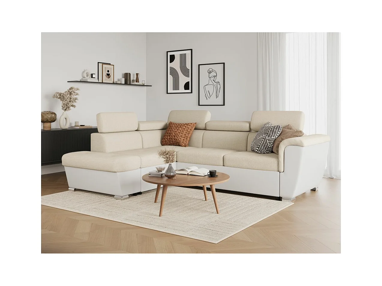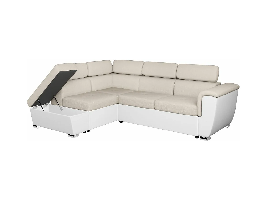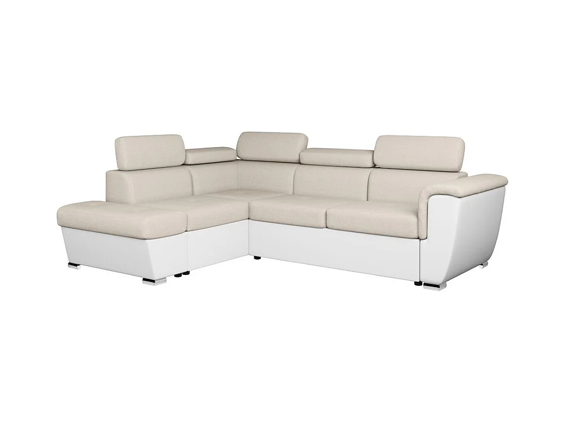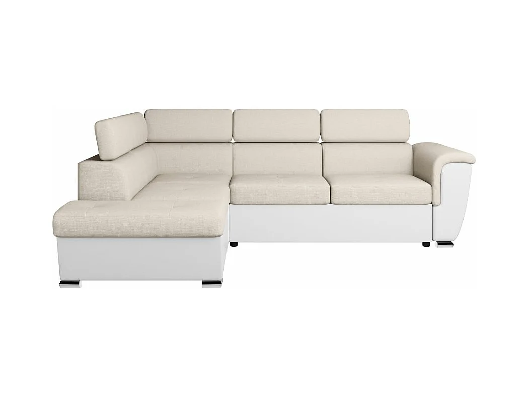 Canapé d'angle gauche PAOLA convertible 4 places tissu Easy Clean antitache et simili - Beige/Blanc
