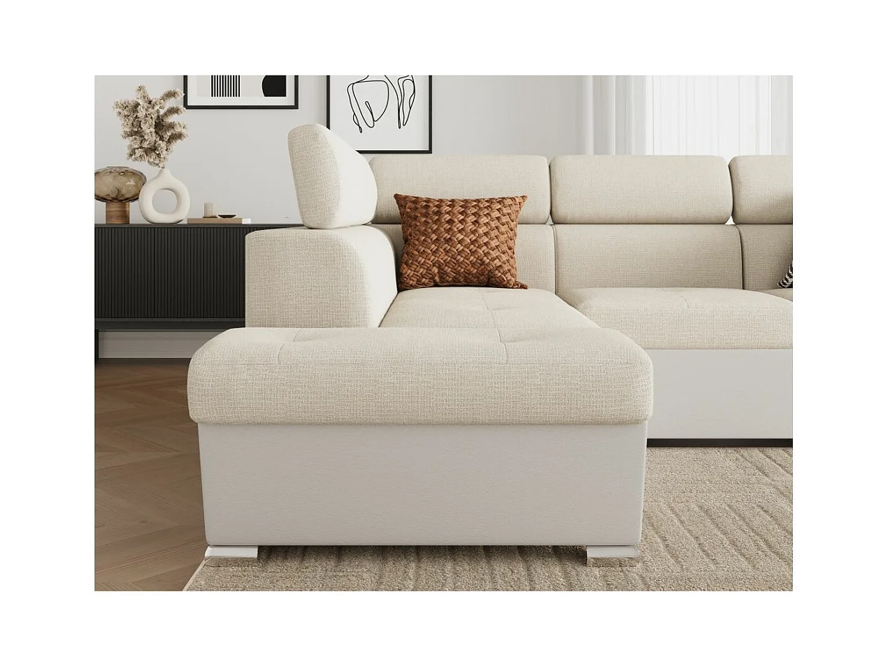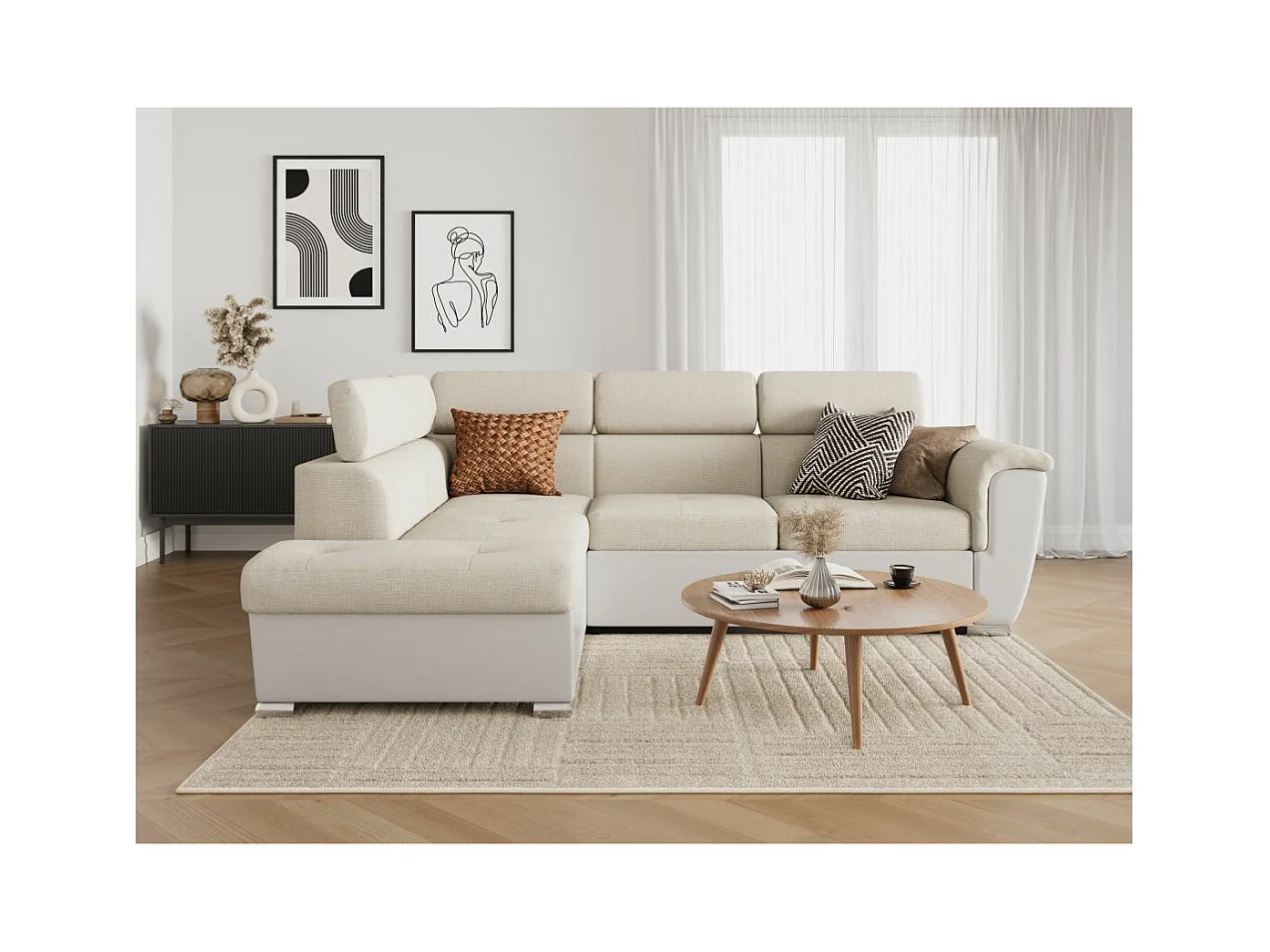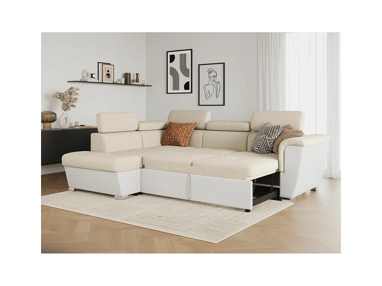 Canapé d'angle gauche PAOLA convertible 4 places tissu Easy Clean antitache et simili - Beige/Blanc