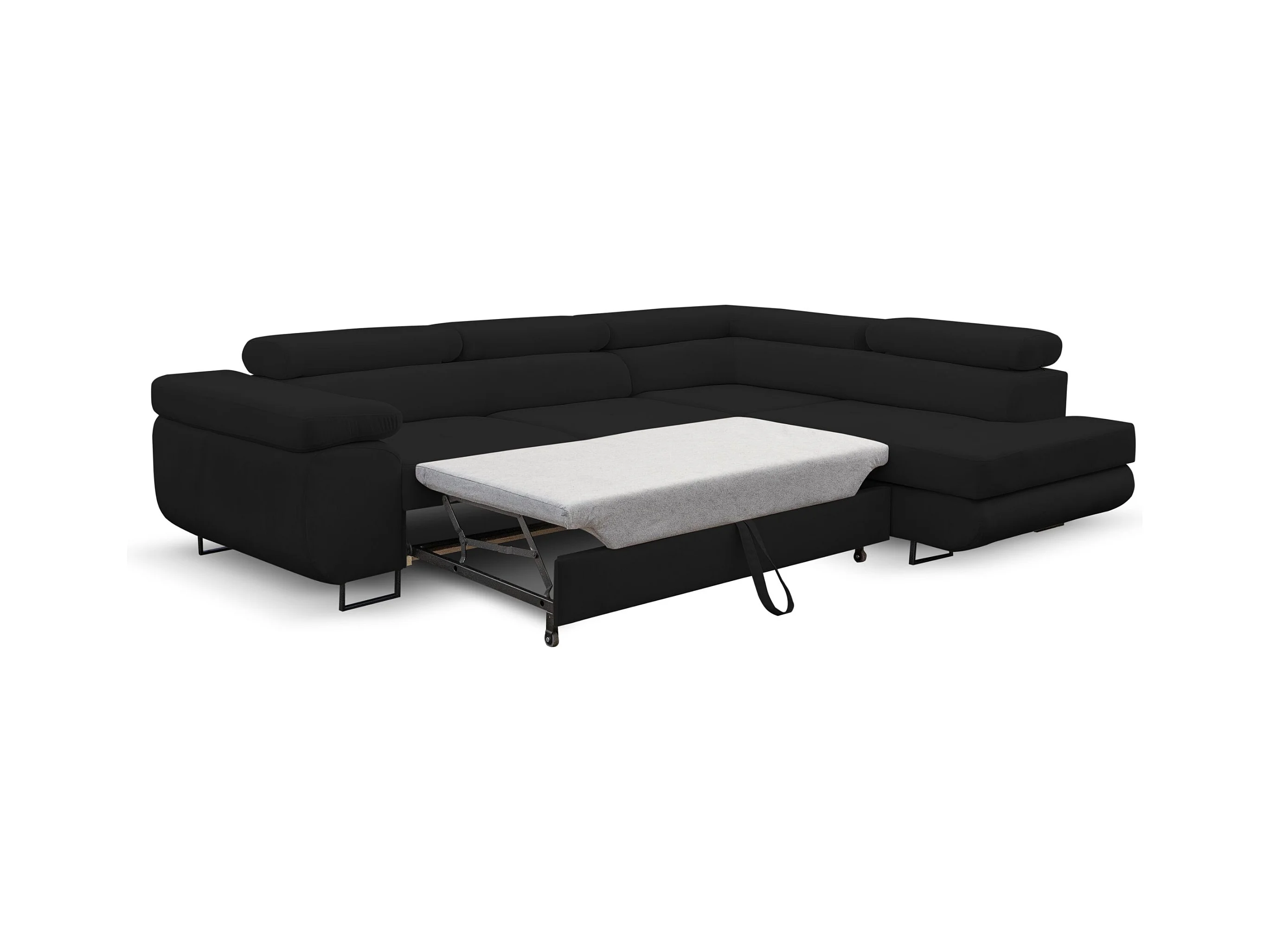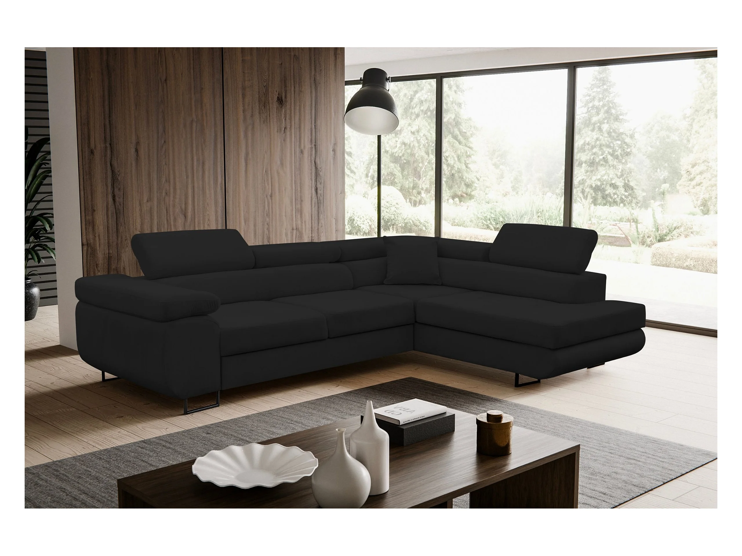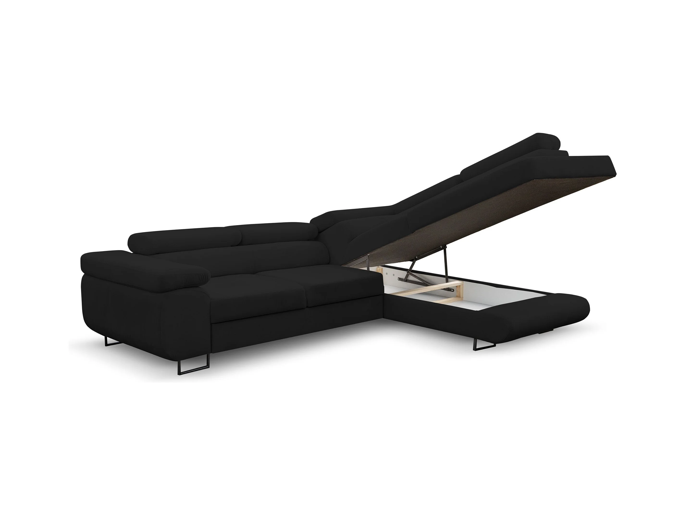Canapé d'angle Jerry avec fonction couchage et coffre de rangement, couleur : noir, tissu velours, pouf à droite