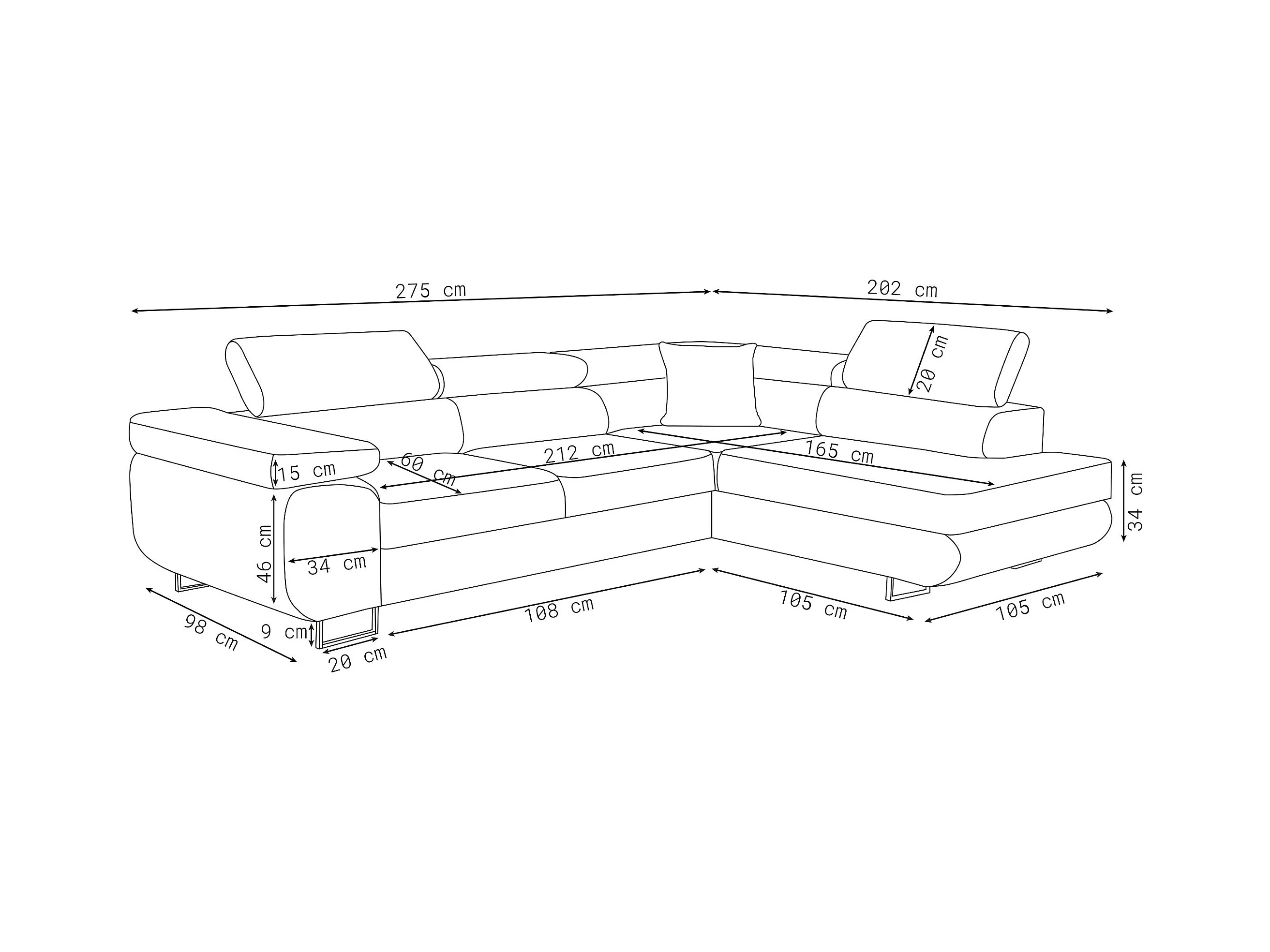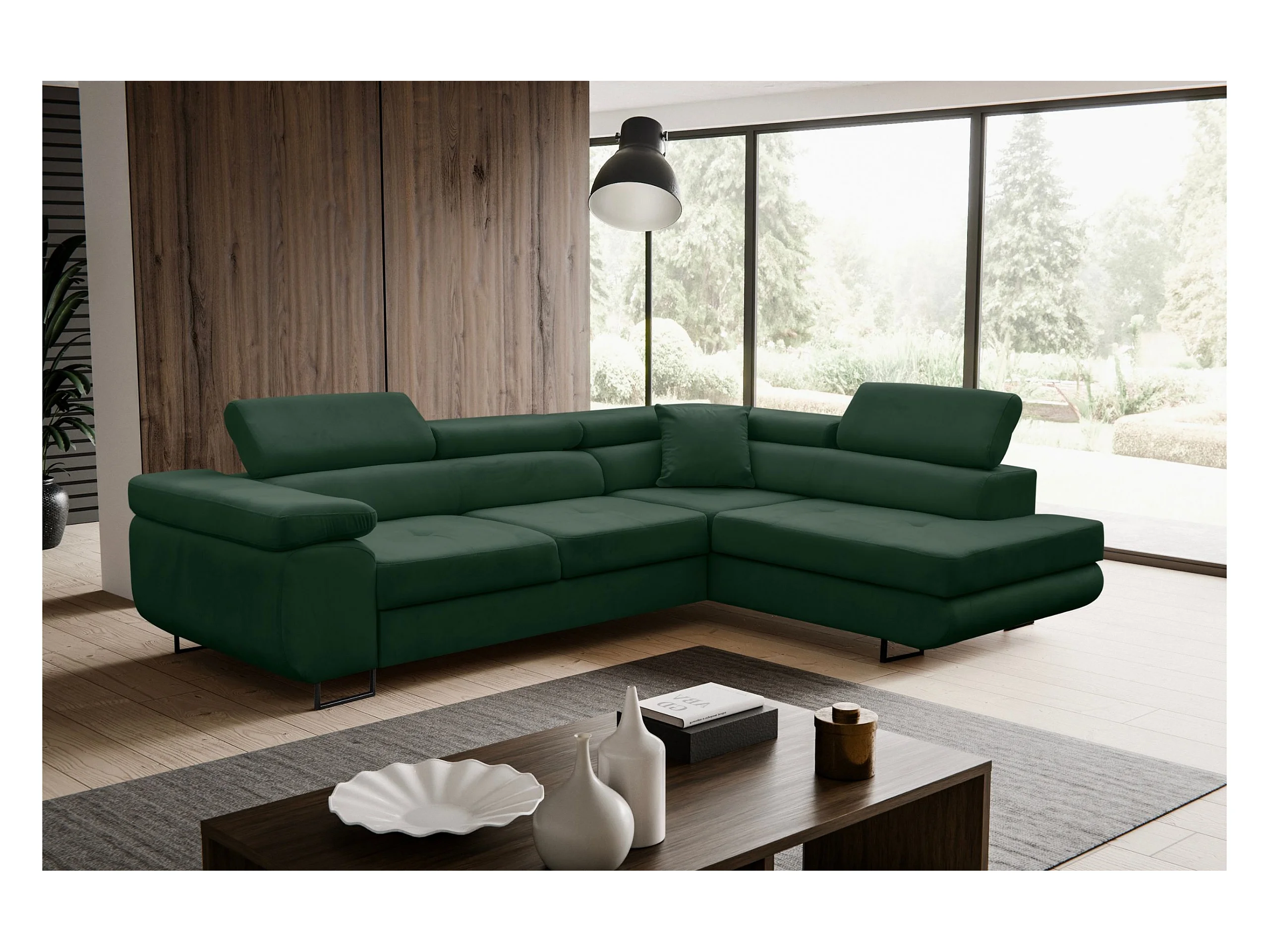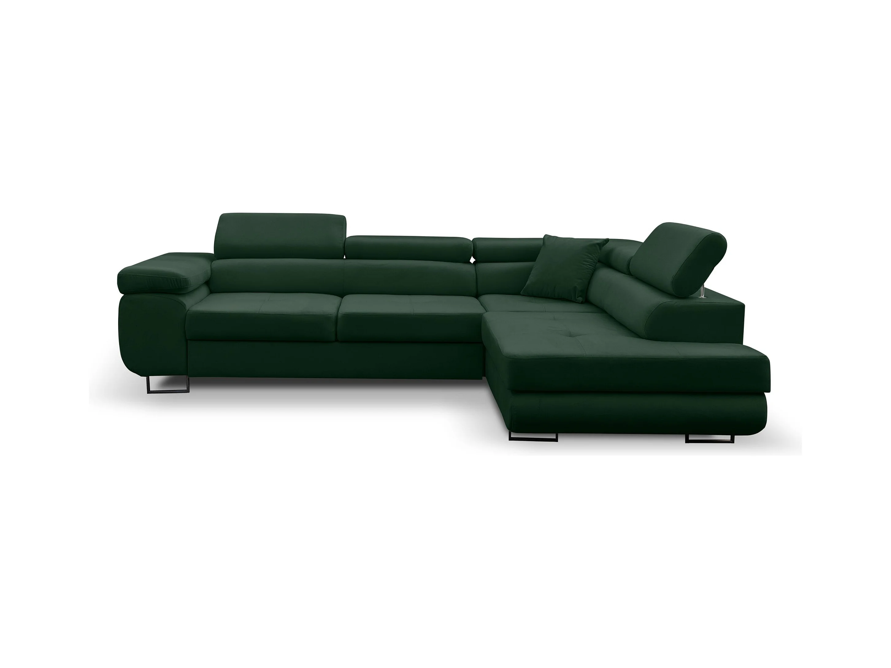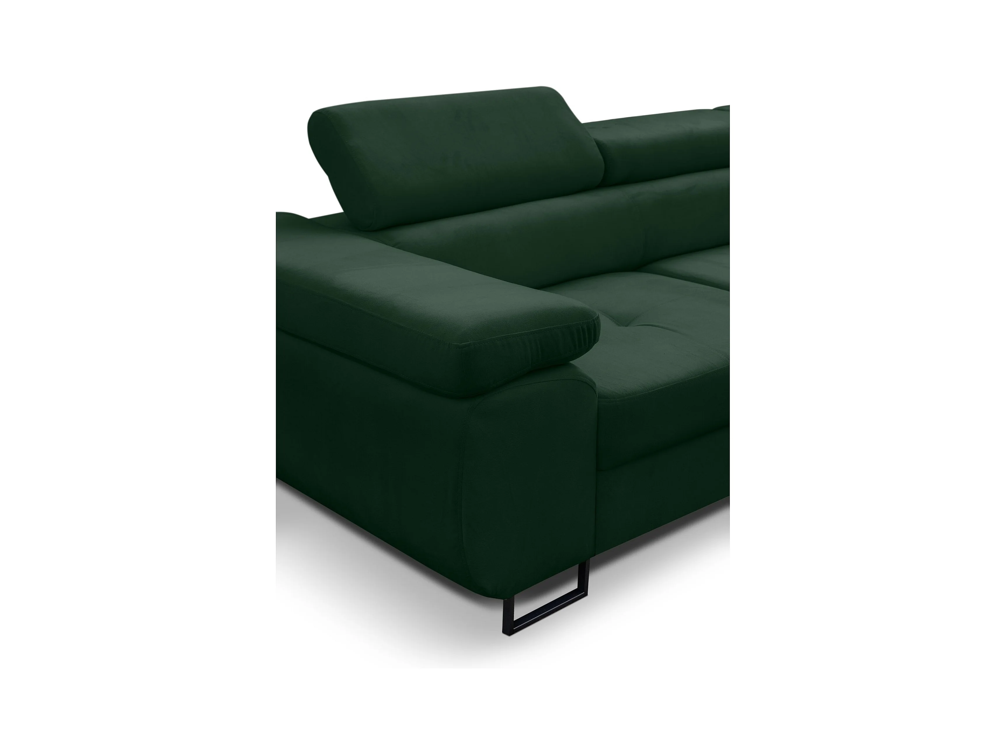 Canapé d'angle Jerry avec fonction couchage et coffre de rangement, couleur : vert, tissu velours, pouf à droite