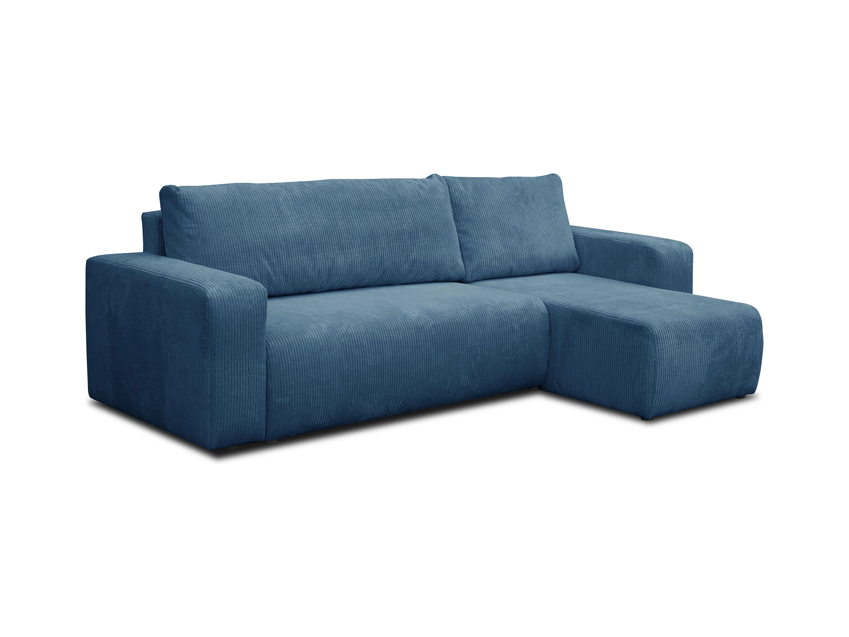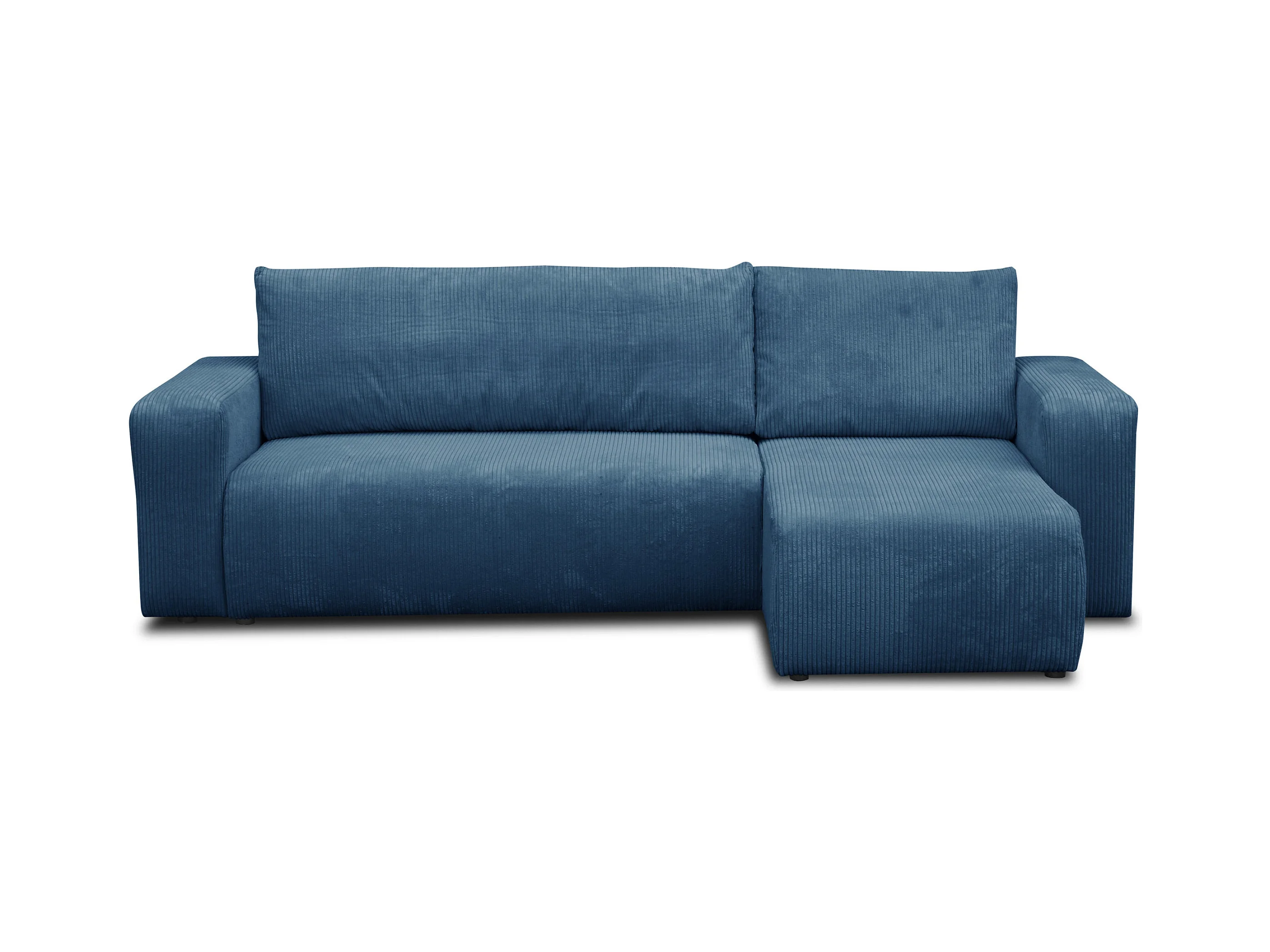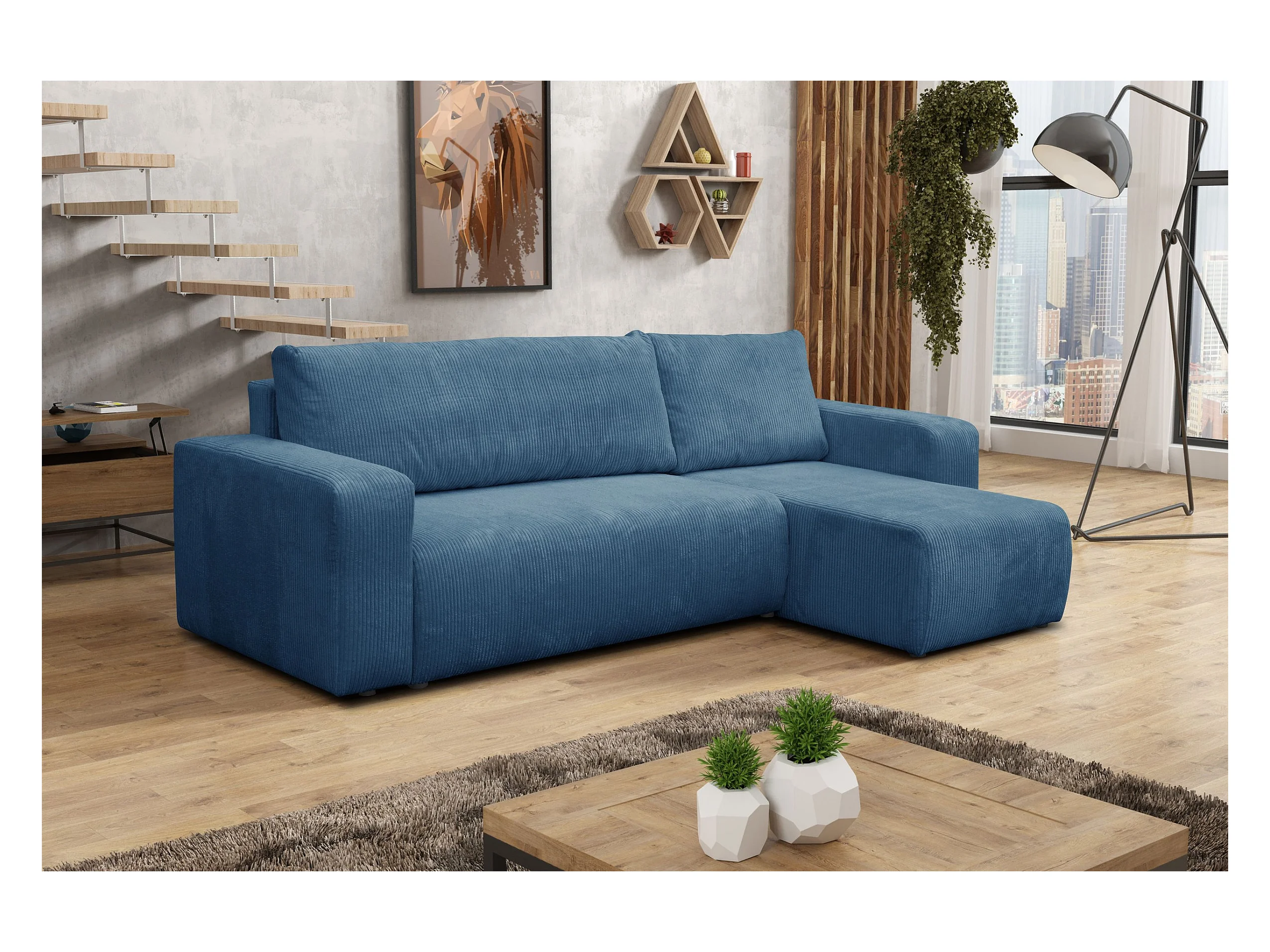 Canapé d'angle Luna L avec fonction couchage et coffre de rangement, couleur : bleu, tissu cordé, pouf universel