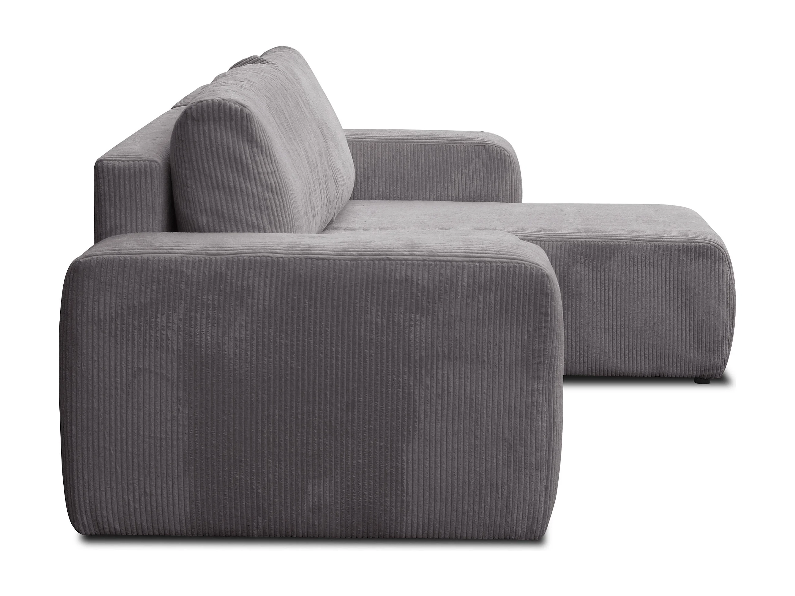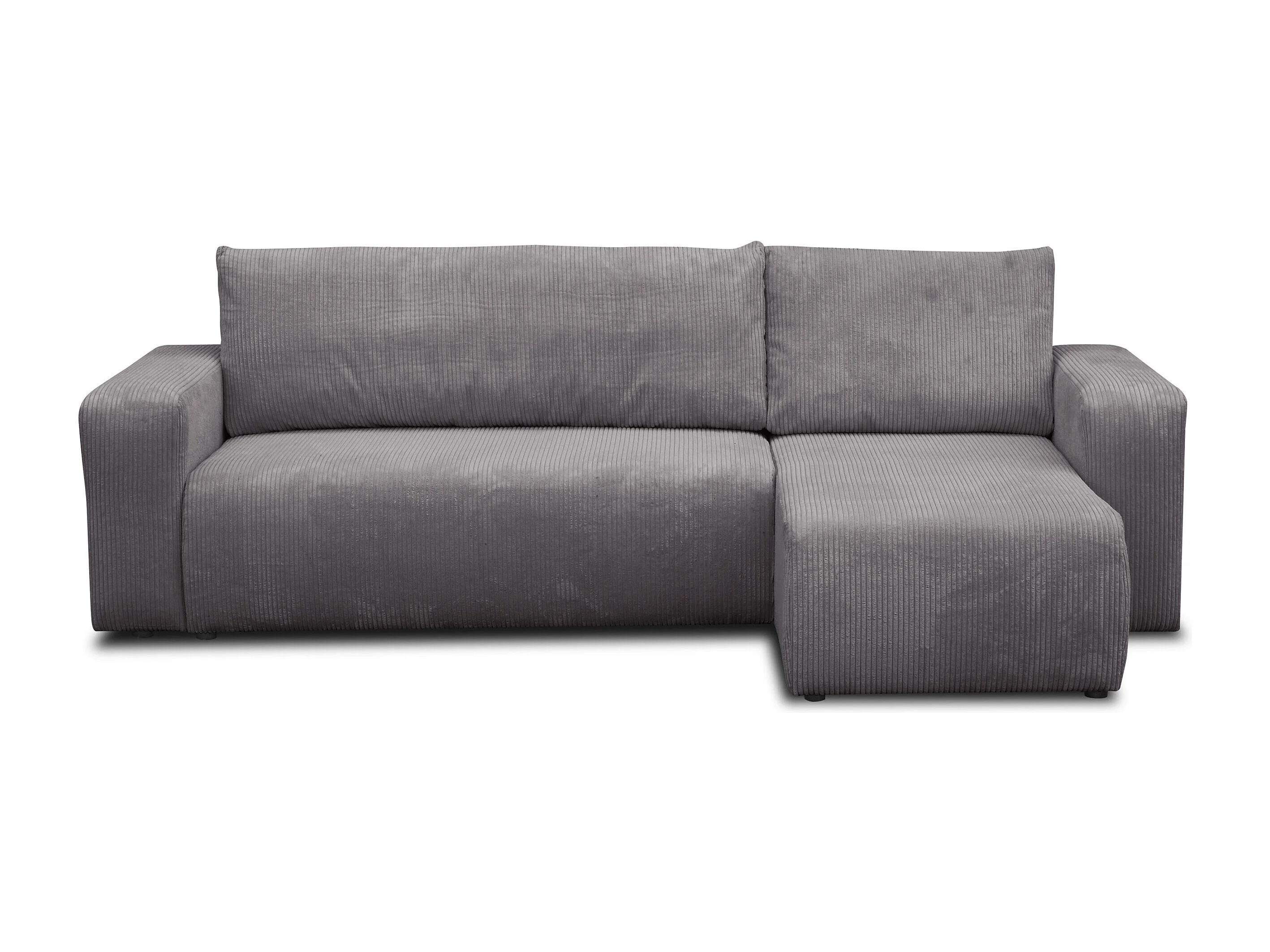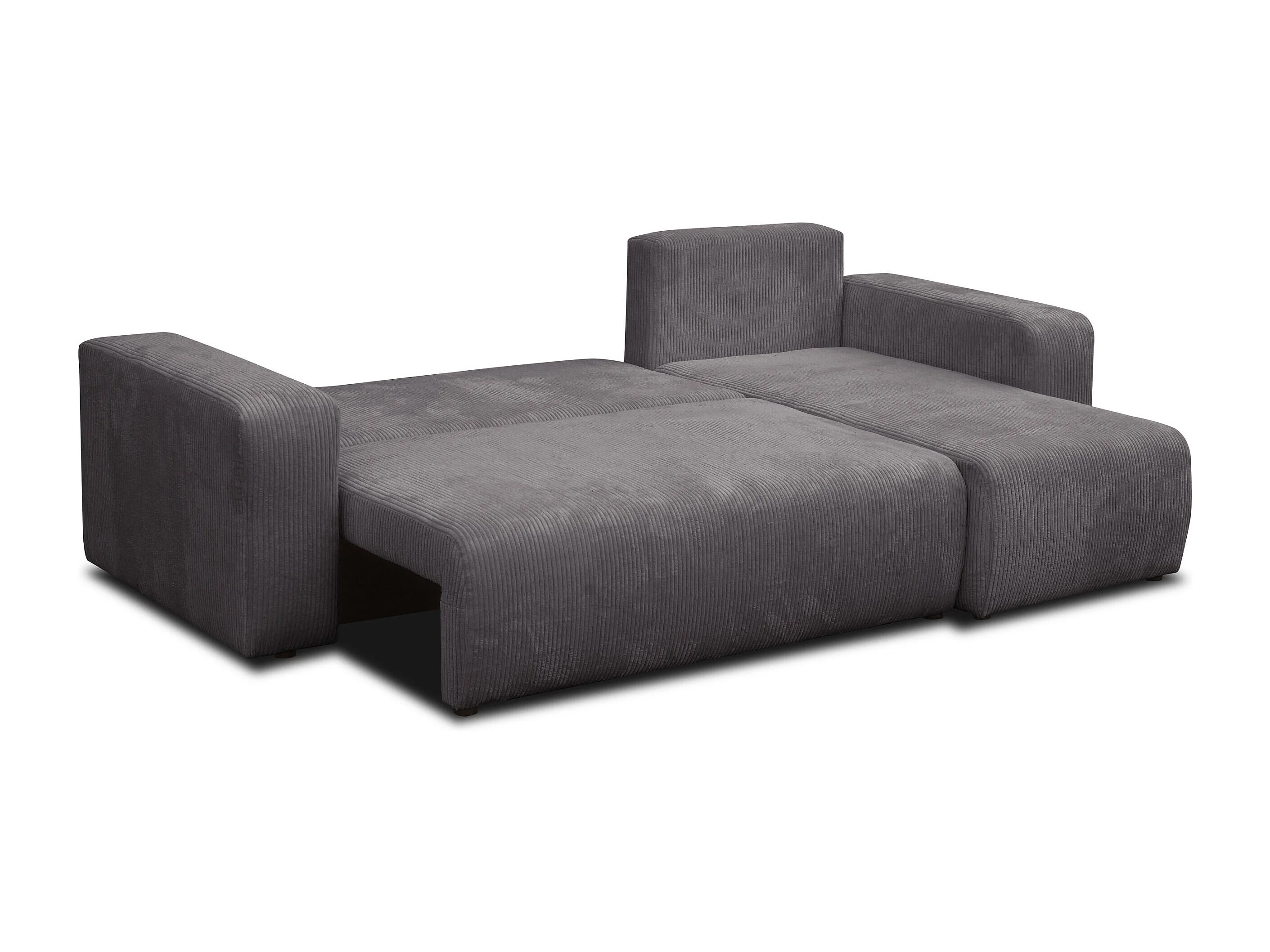 Canapé d'angle Luna L avec fonction couchage et coffre de rangement, couleur : gris foncé, tissu cordé, pouf universel