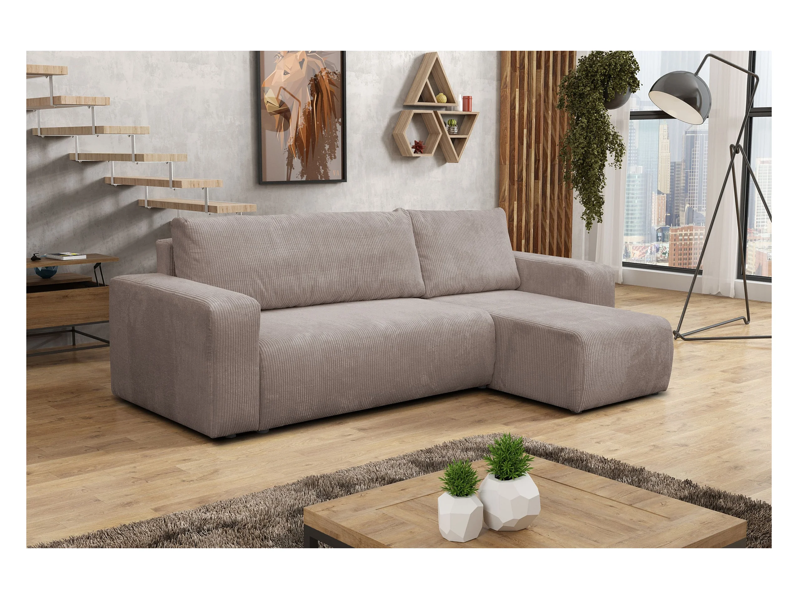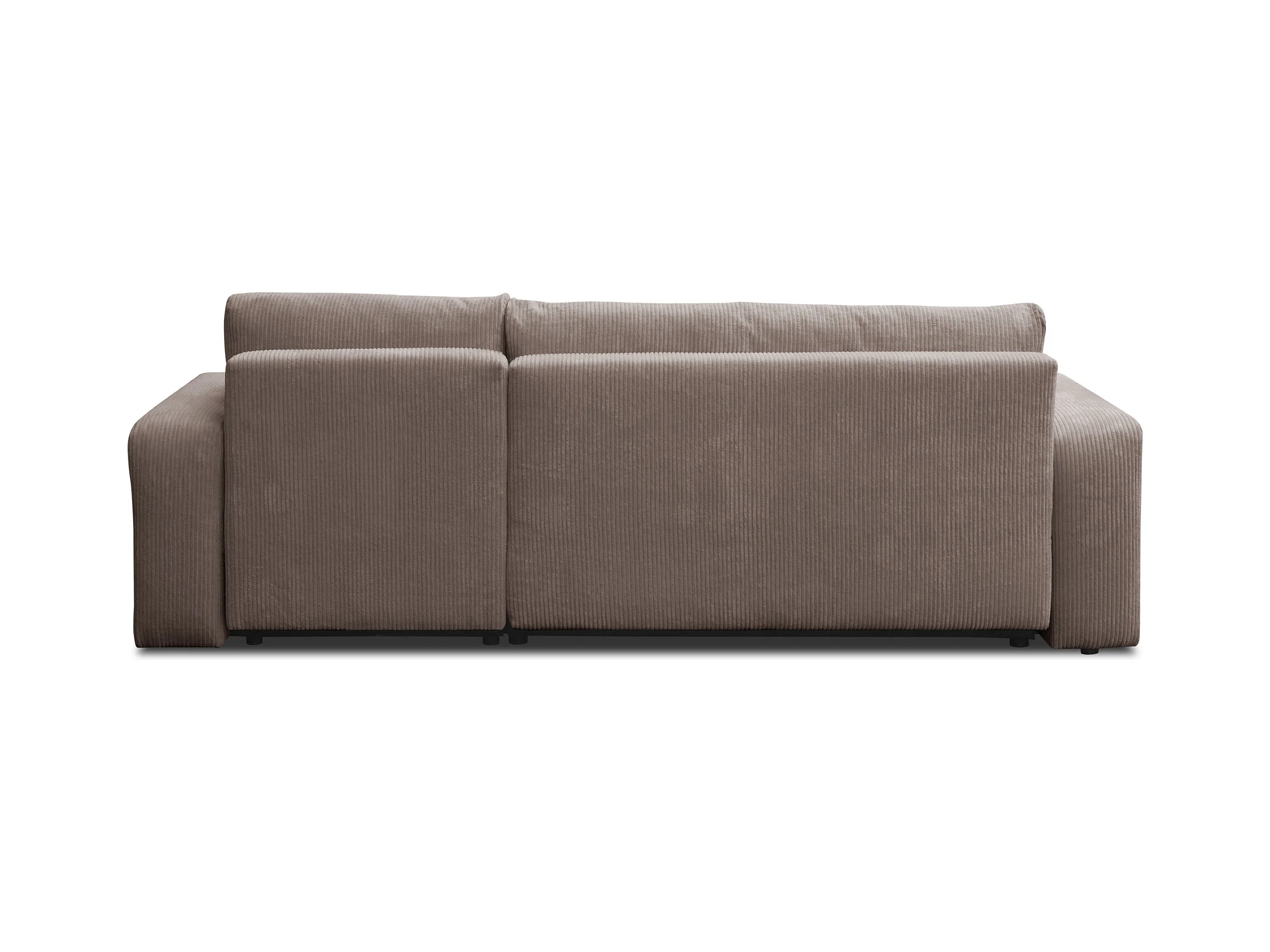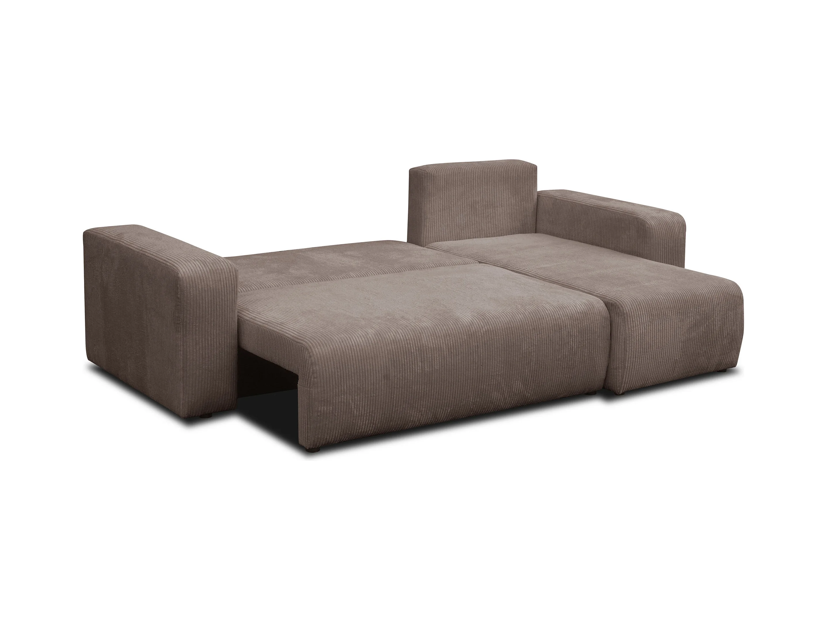 Canapé d'angle Luna L avec fonction couchage et coffre de rangement, couleur : marron clair, tissu cordé, pouf universel