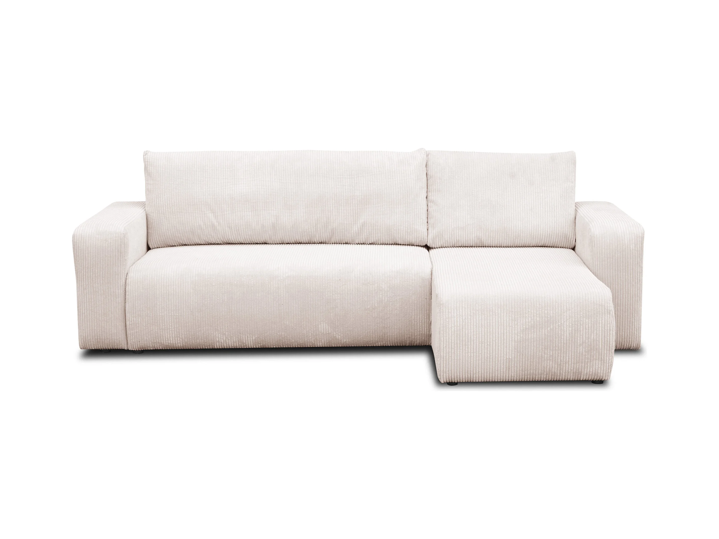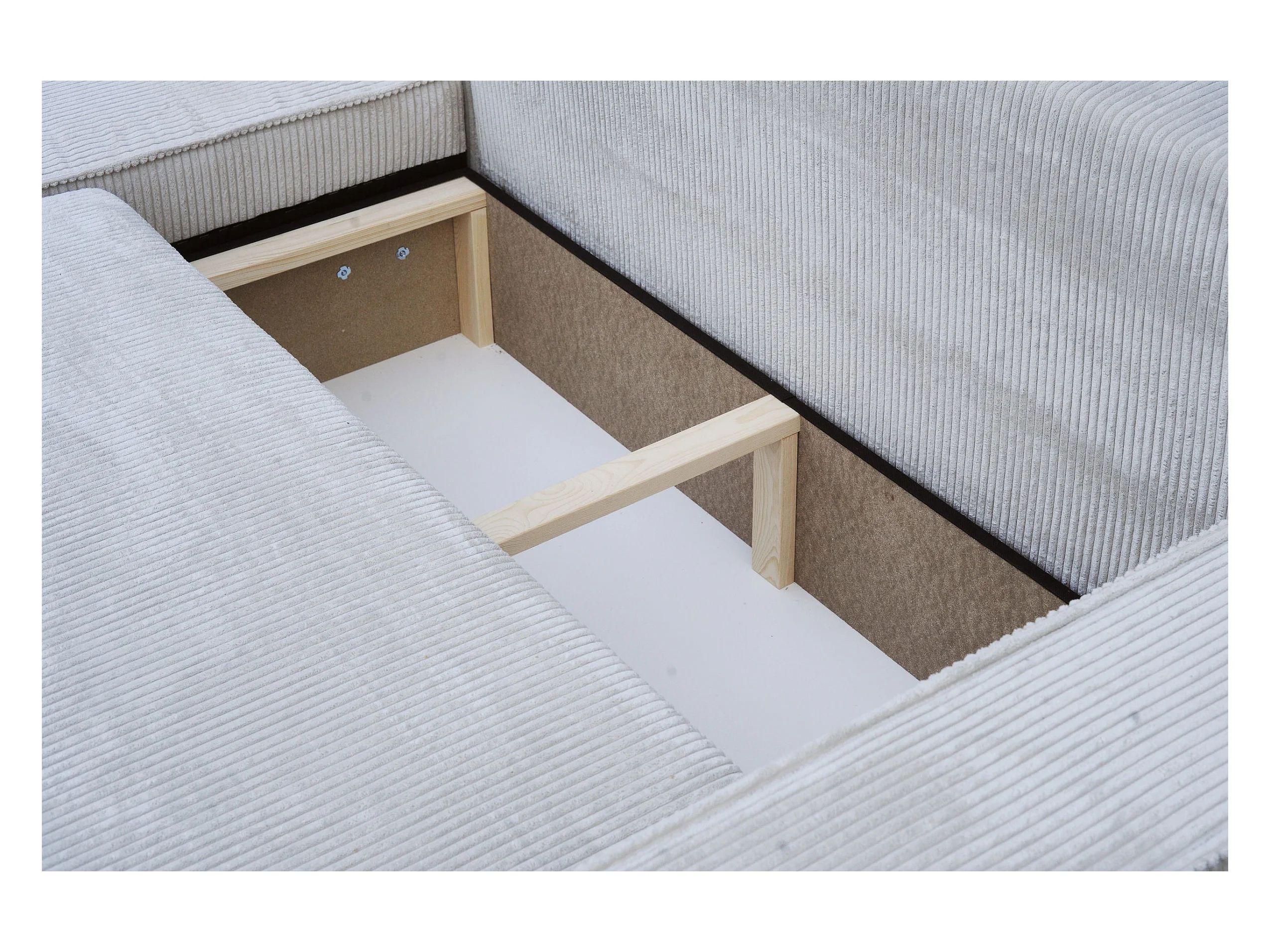Canapé d'angle Luna L avec fonction de couchage et coffre de rangement, couleur : beige, tissu cordé, pouf universel