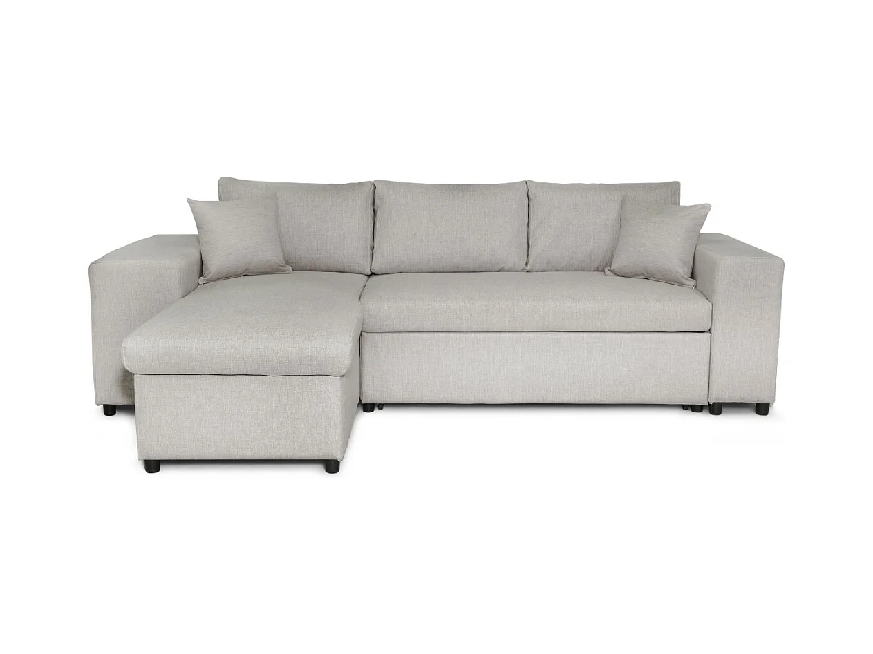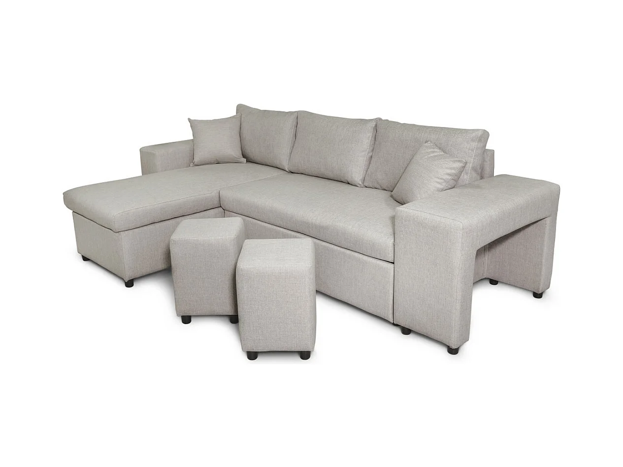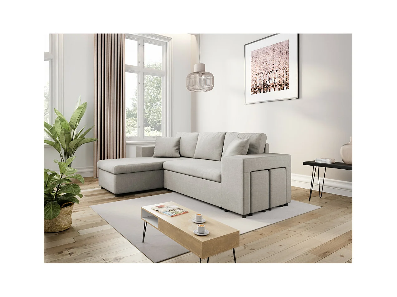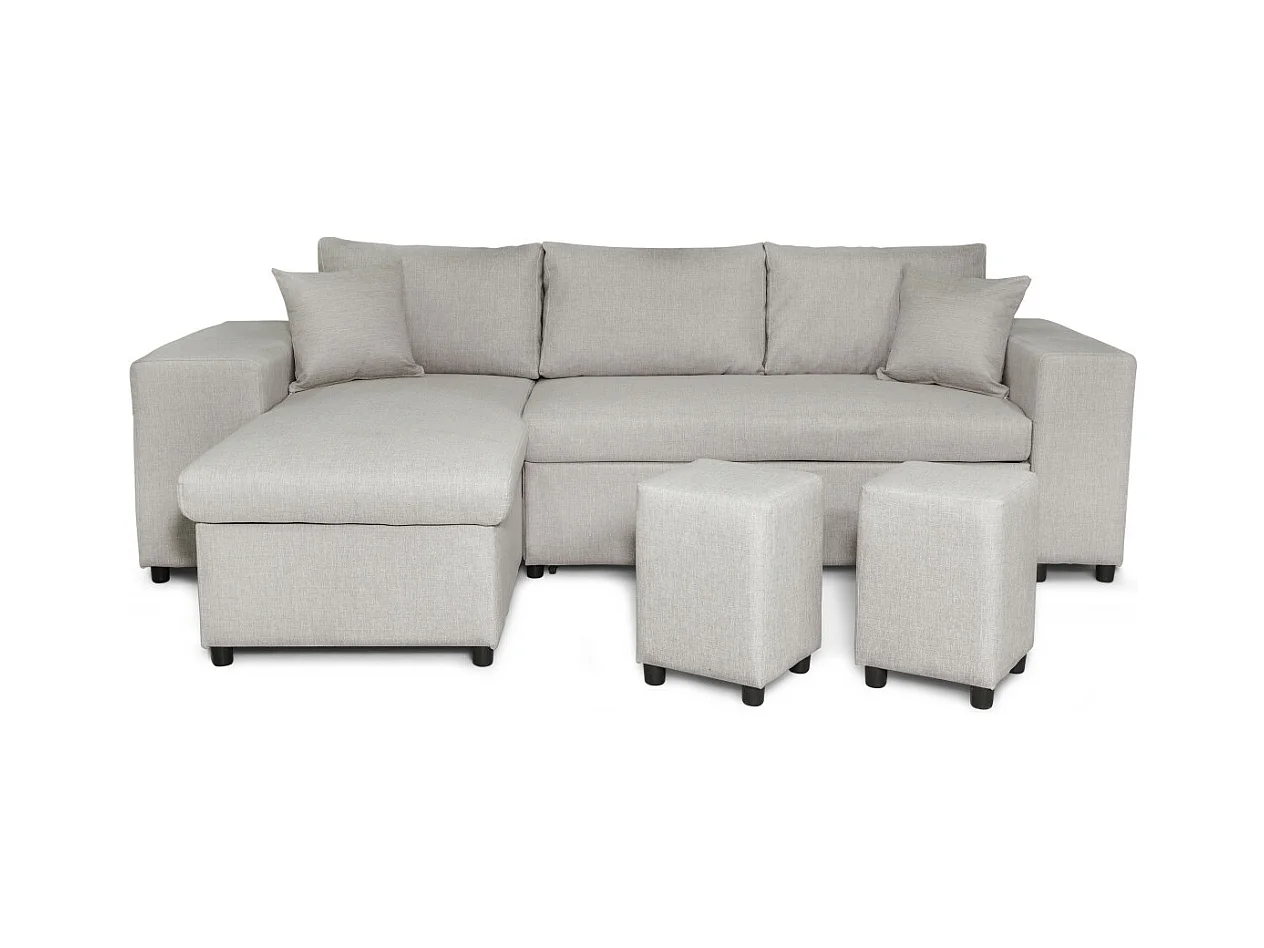 Canapé d'angle MADY convertible avec coffre, accoudoir étagère et poufs droit en tissu beige