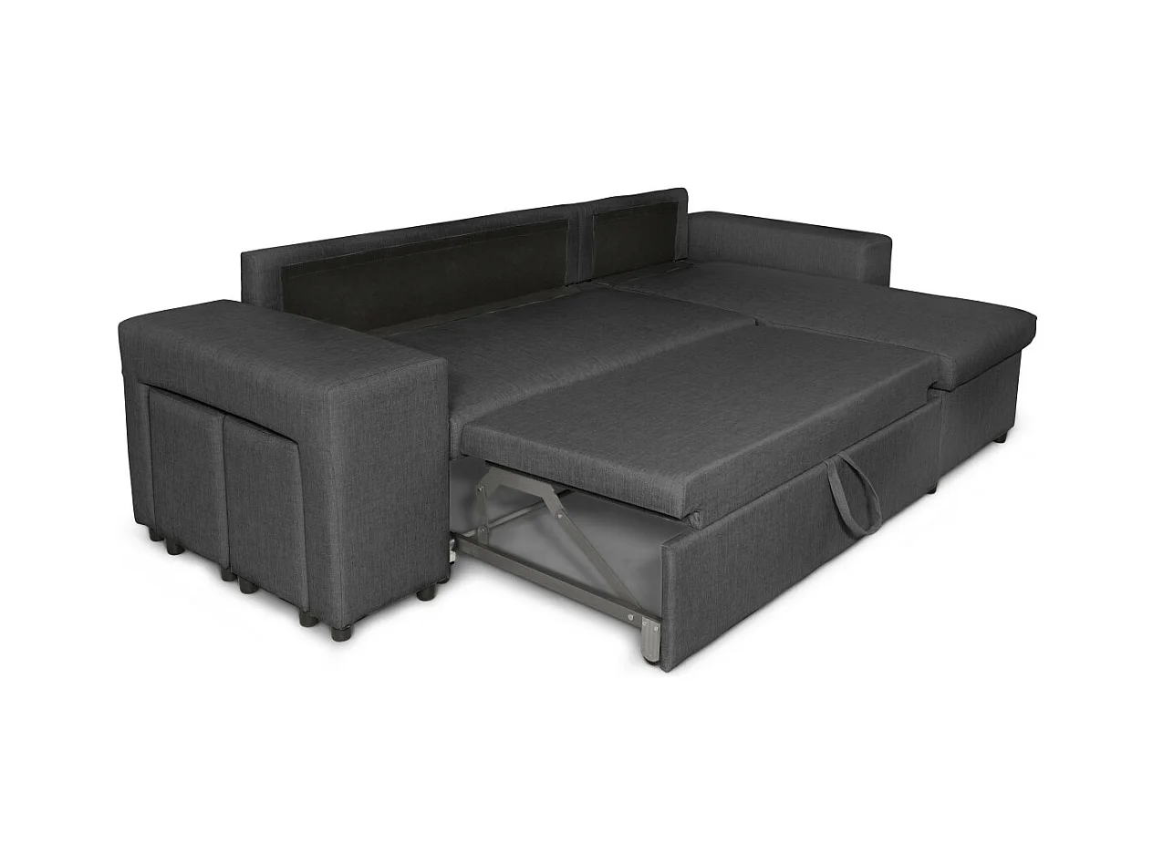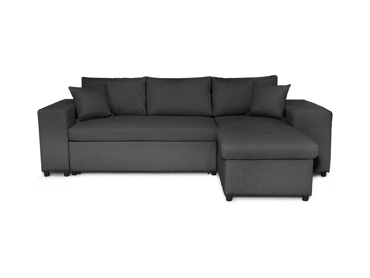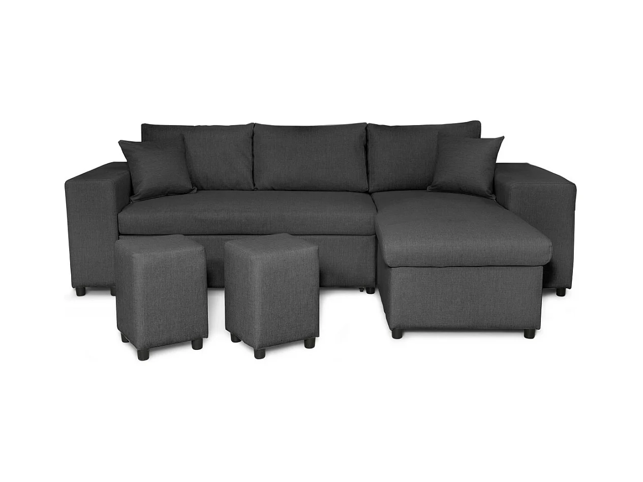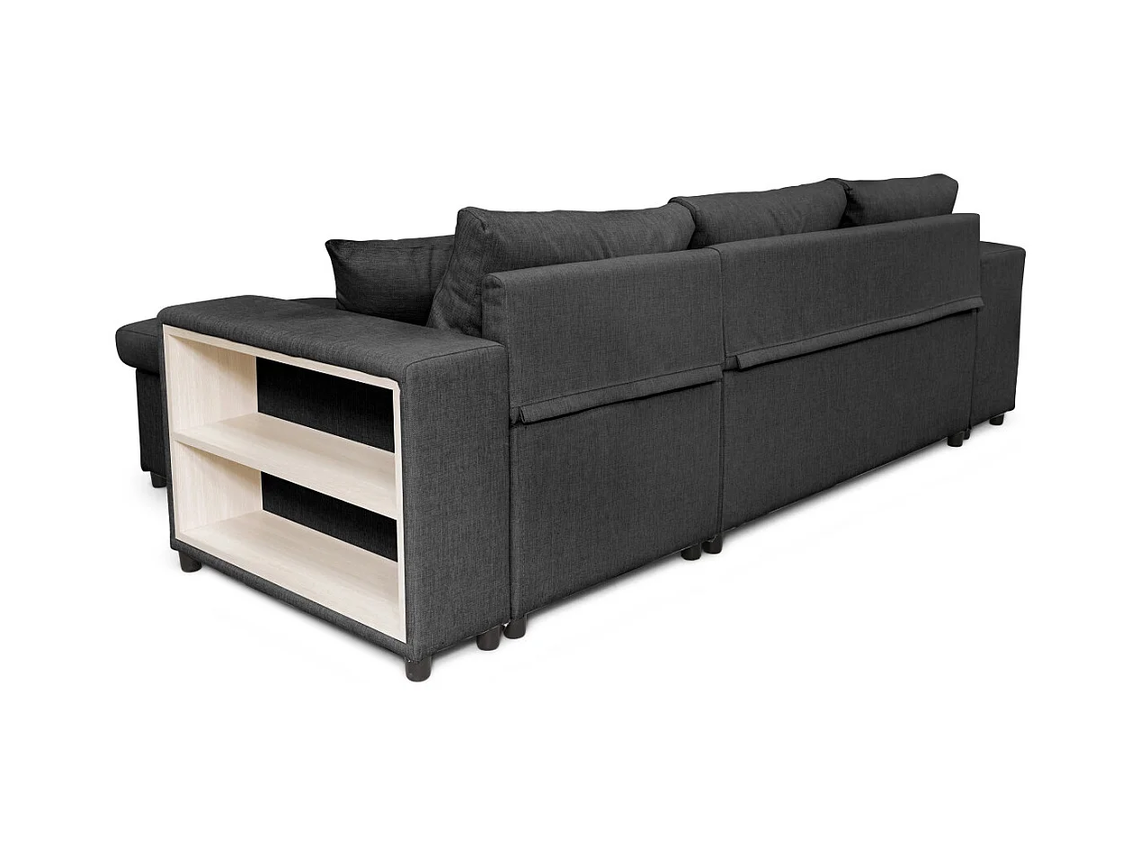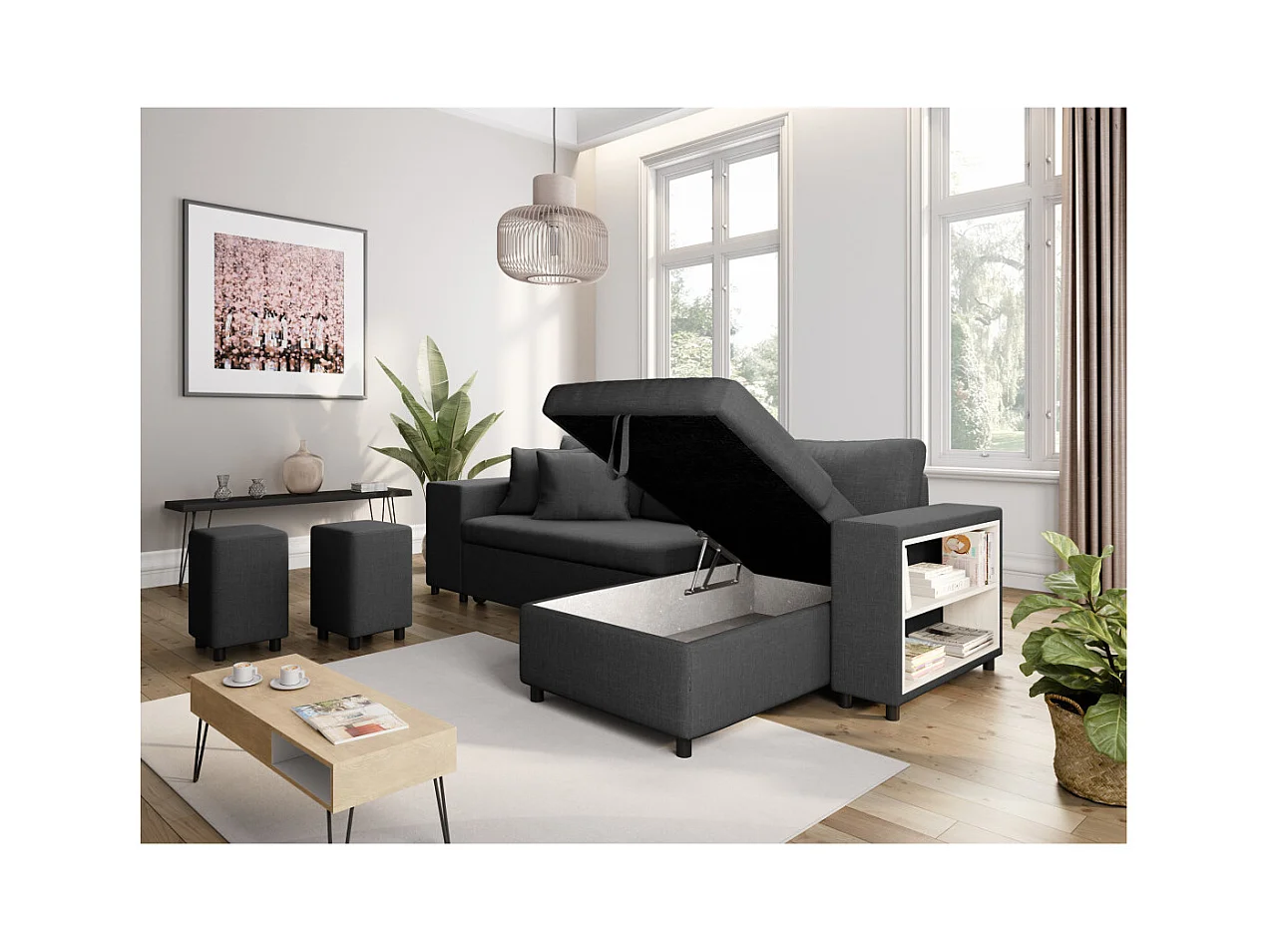 Canapé d'angle réversible Mady avec coffre accoudoir étagère et poufs gauche en tissu- Gris anthracite - L254 x P146 x H81cm - Loungitude