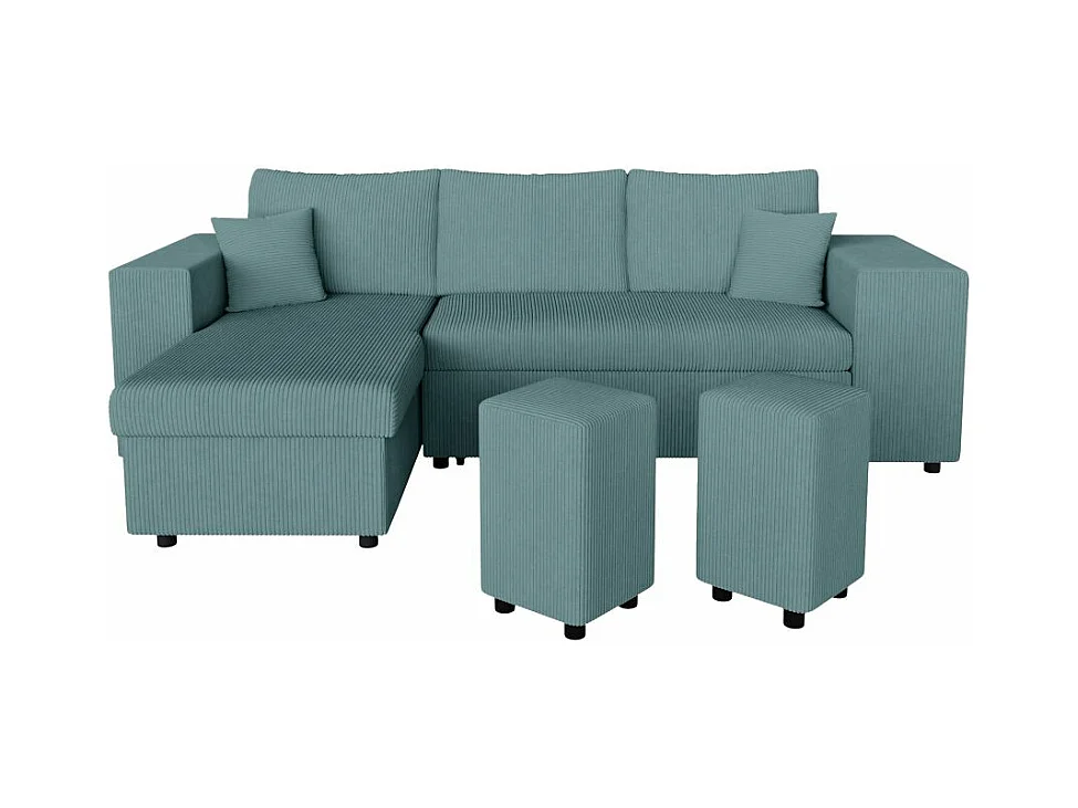 Canapé d'angle réversible Mady avec coffre, rangement poufs à droite en velours côtelé bleu clair - L254 x P146 x H81cm - Loungitude
