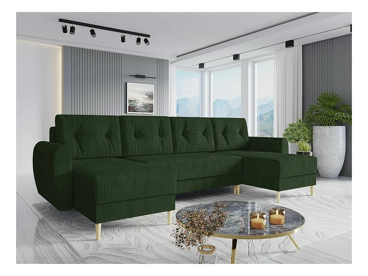 Canapé d'angle Memphis 140, Vert, Fonction de couchage, Boîte de literie, 307x139x95cm