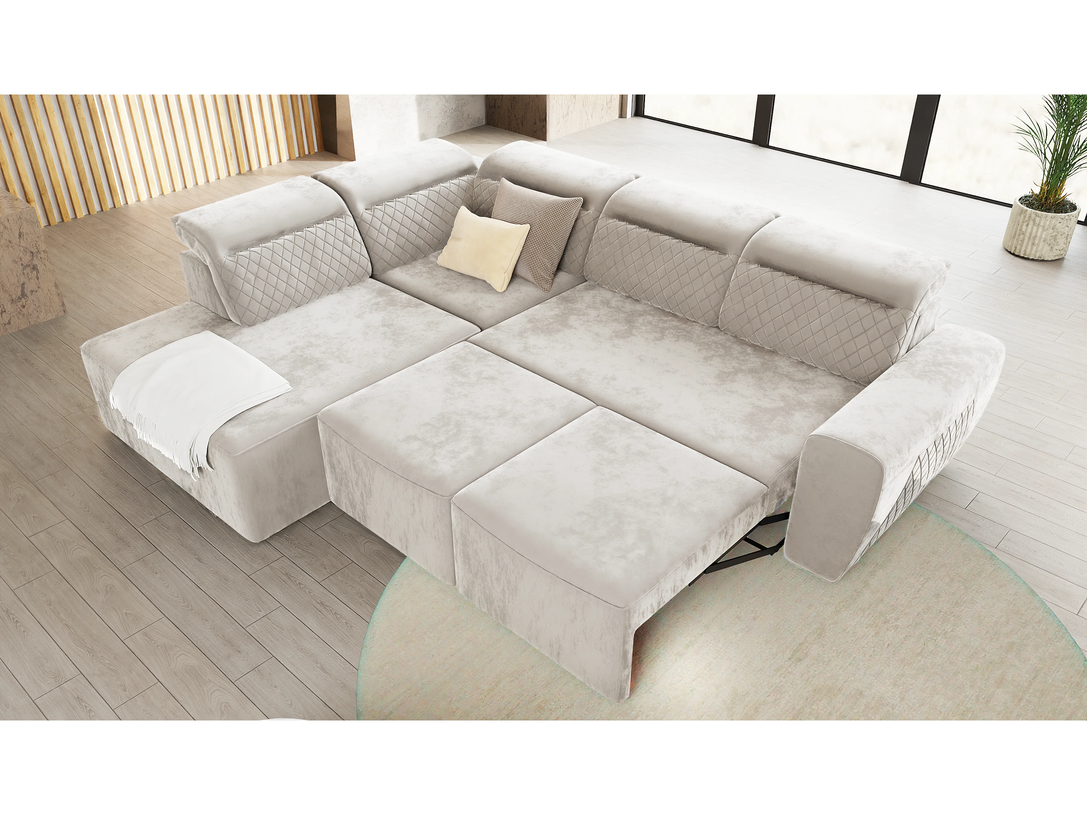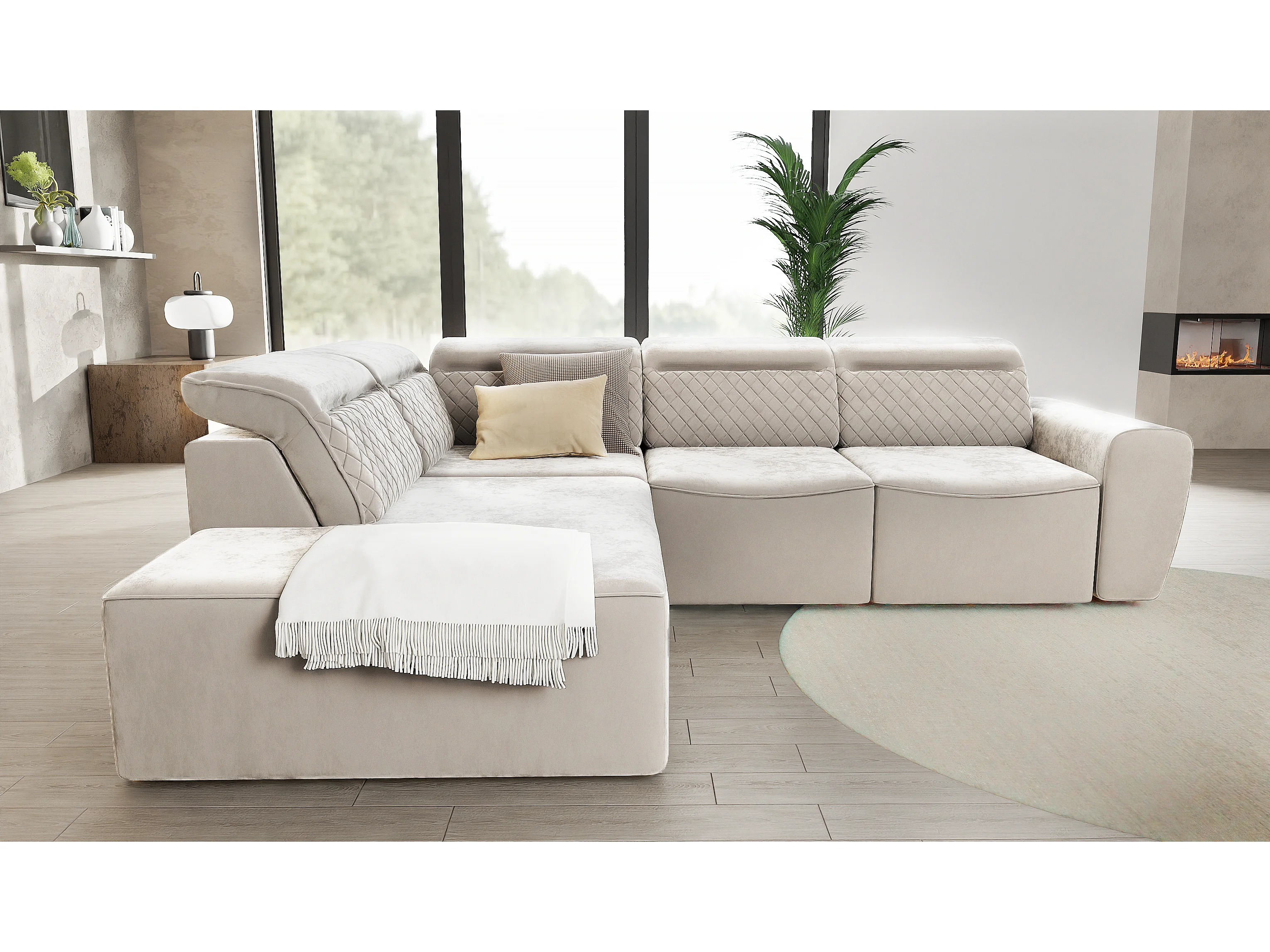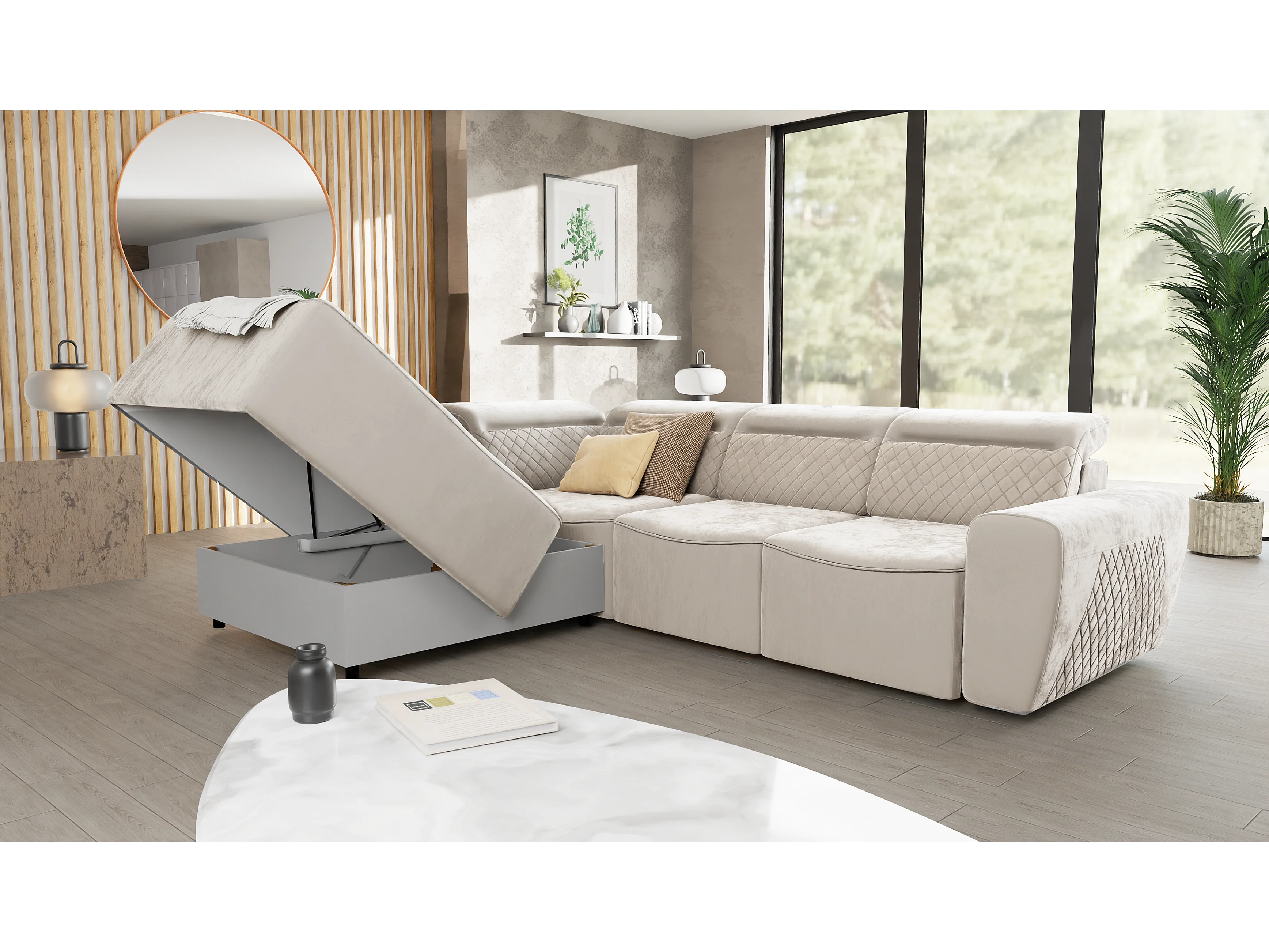 Canapé d’angle moderne avec fonction lit et coffre de rangement, en tissu velours beige, et des appuie-têtes réglables Hilda