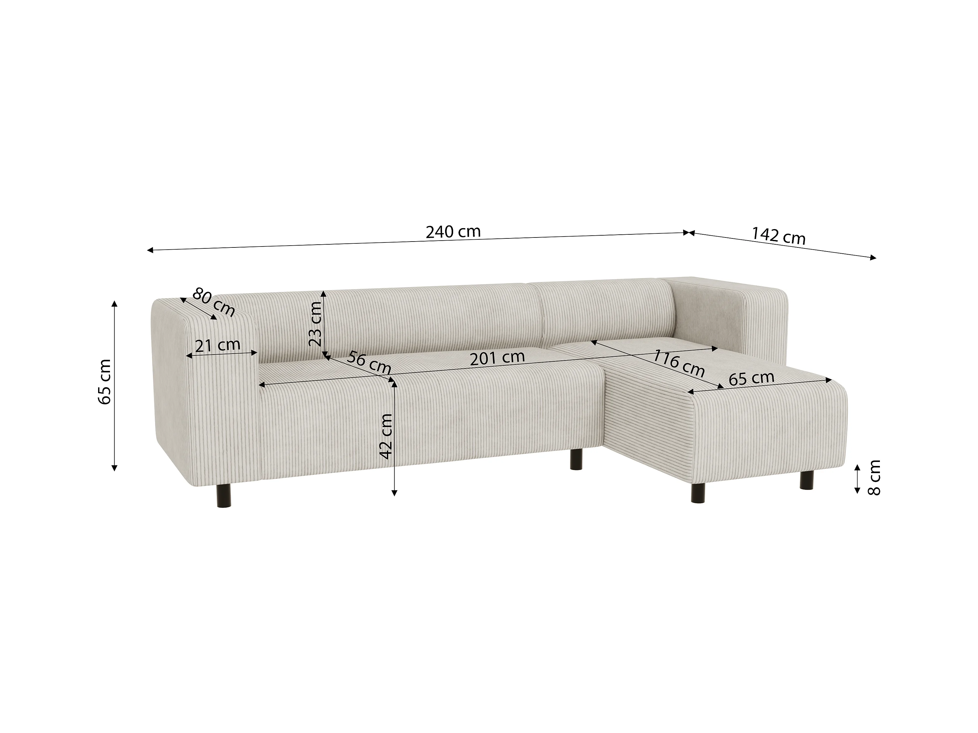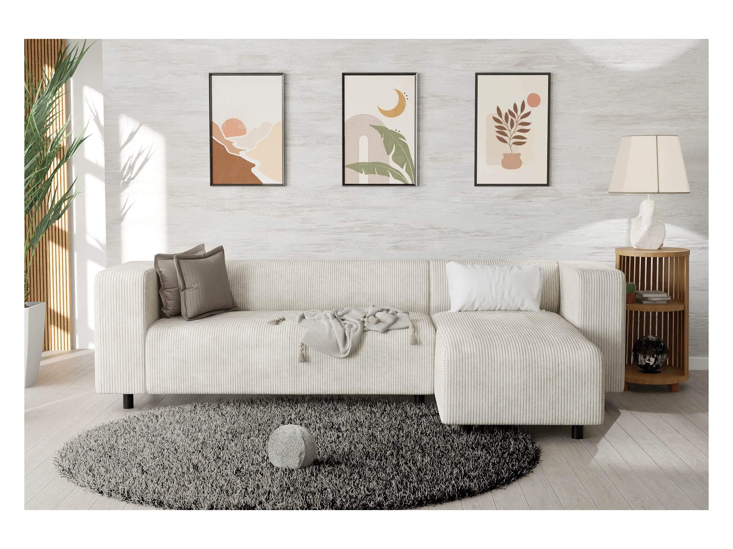 Canapé d’angle moderne avec ottomane en velours côtelé beige avec assise confortable THORA