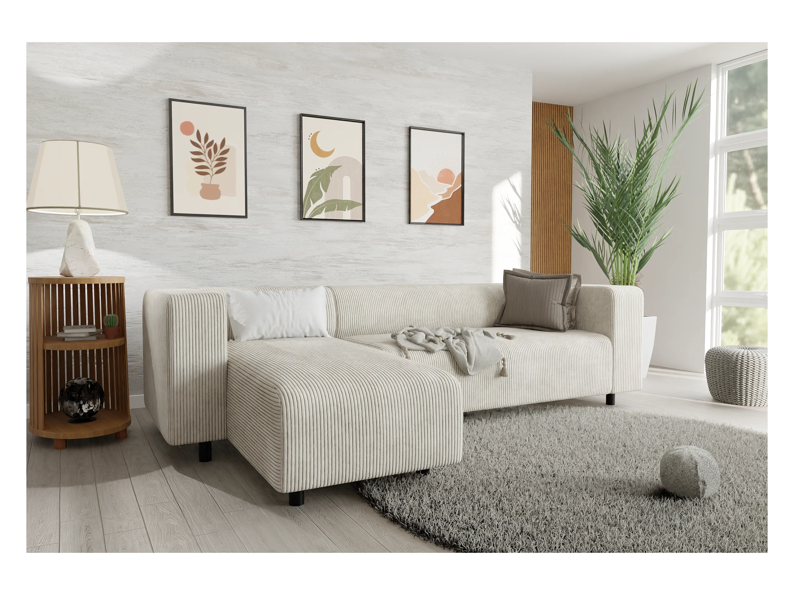 Canapé d’angle moderne avec ottomane en velours côtelé beige avec assise confortable THORA