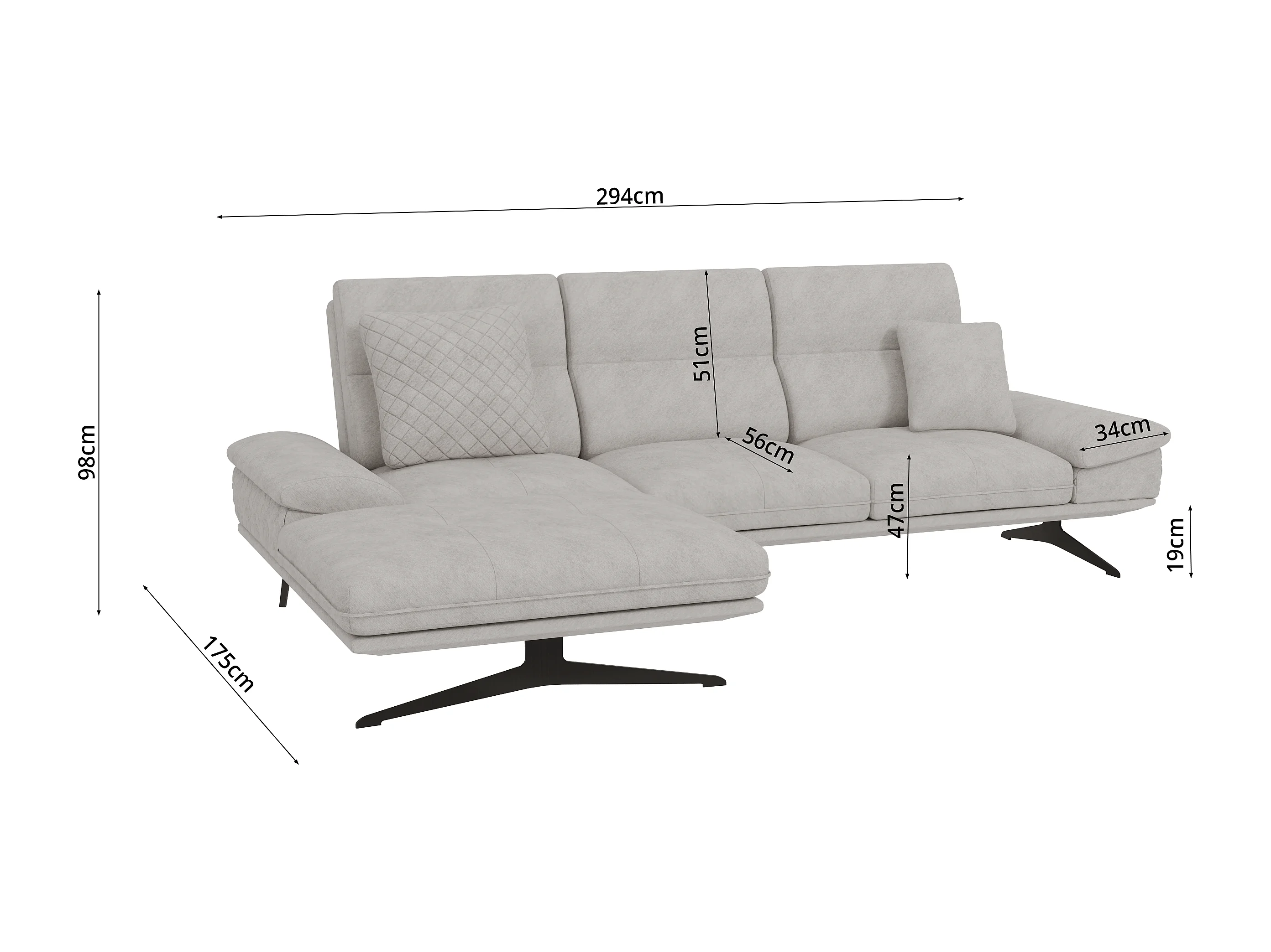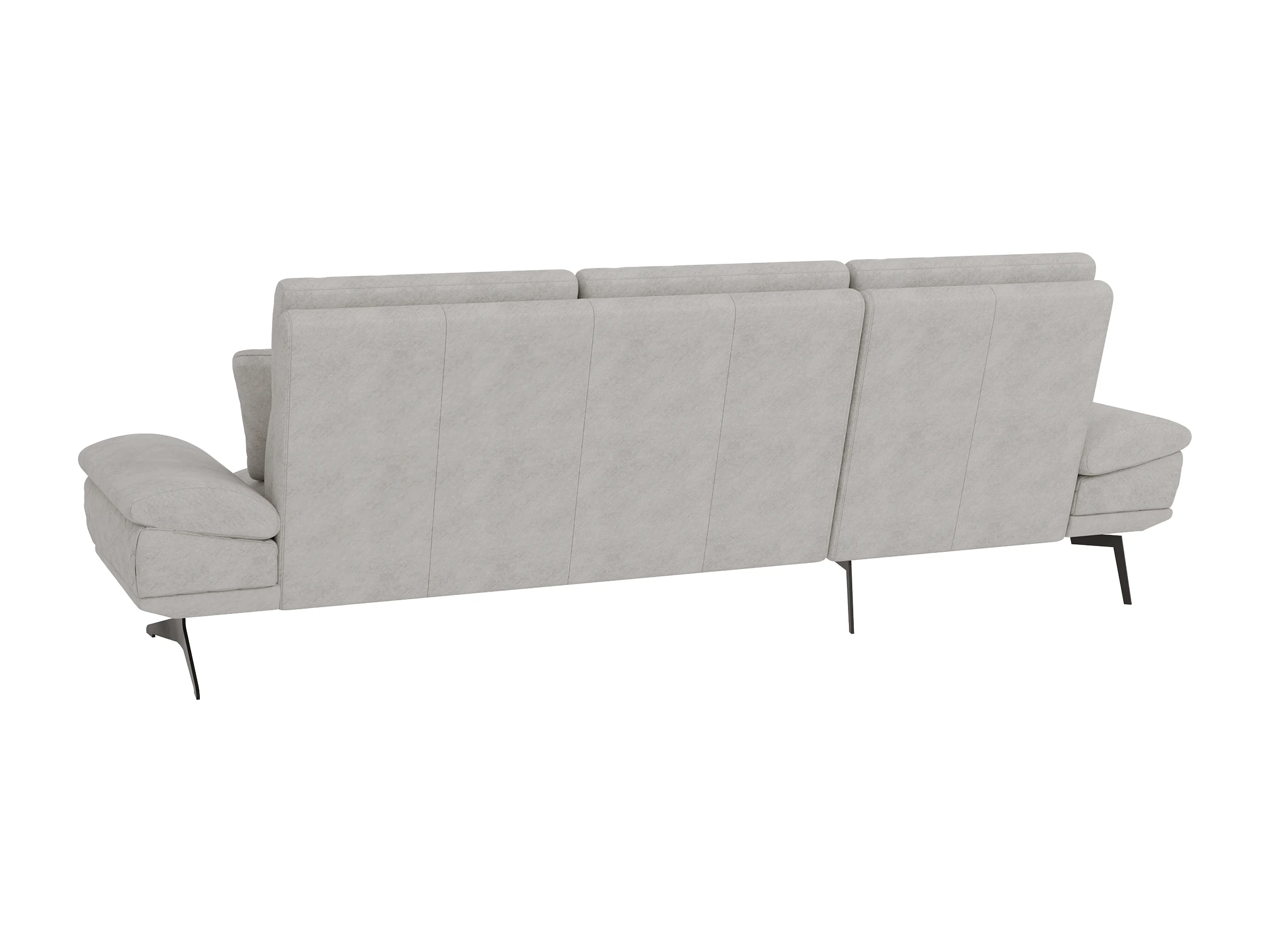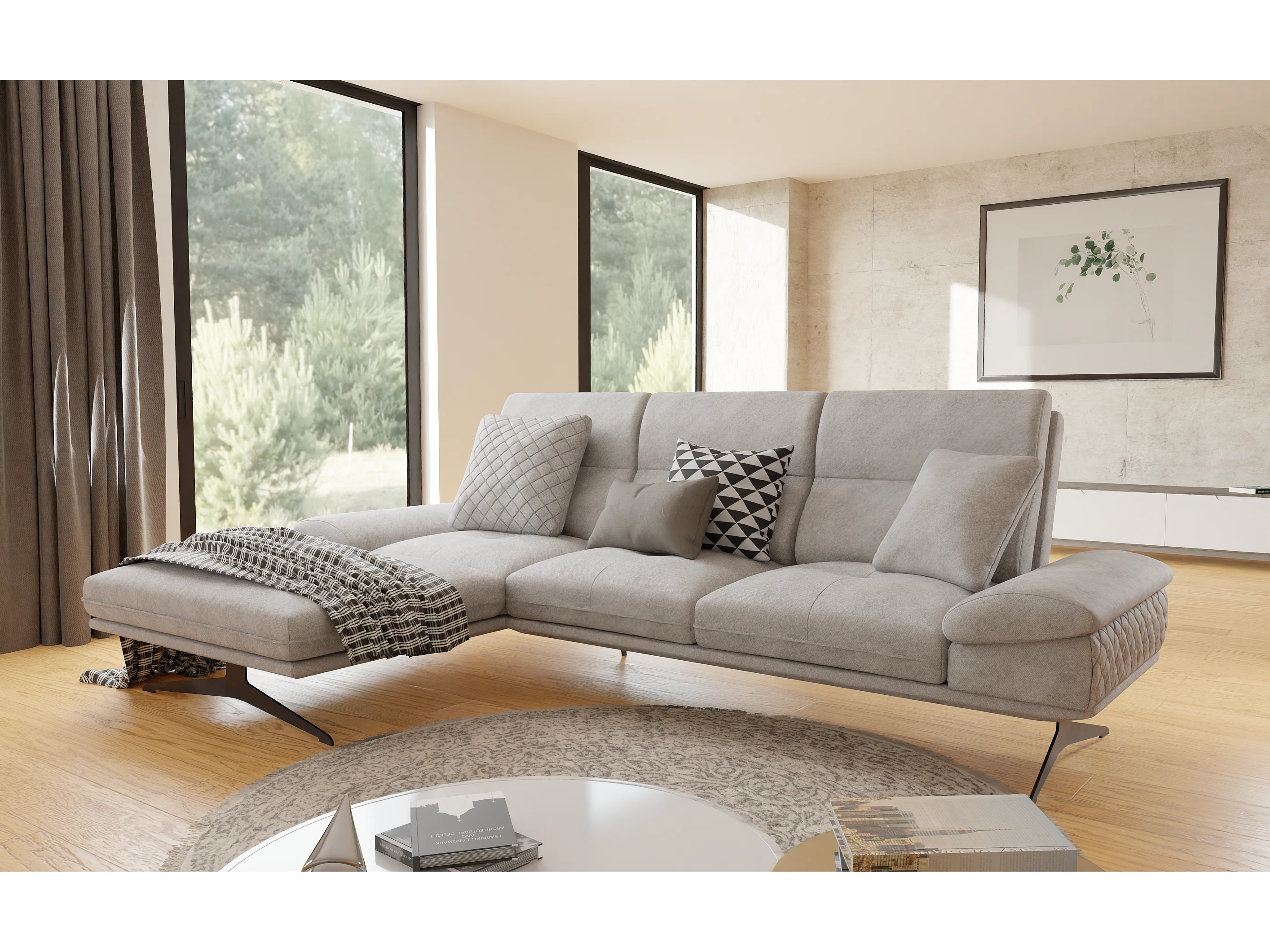 Canapé d’angle moderne avec ottomane et pieds hauts en métal noir, en tissu velours gris clair HAGA