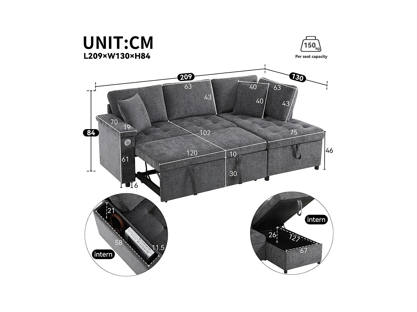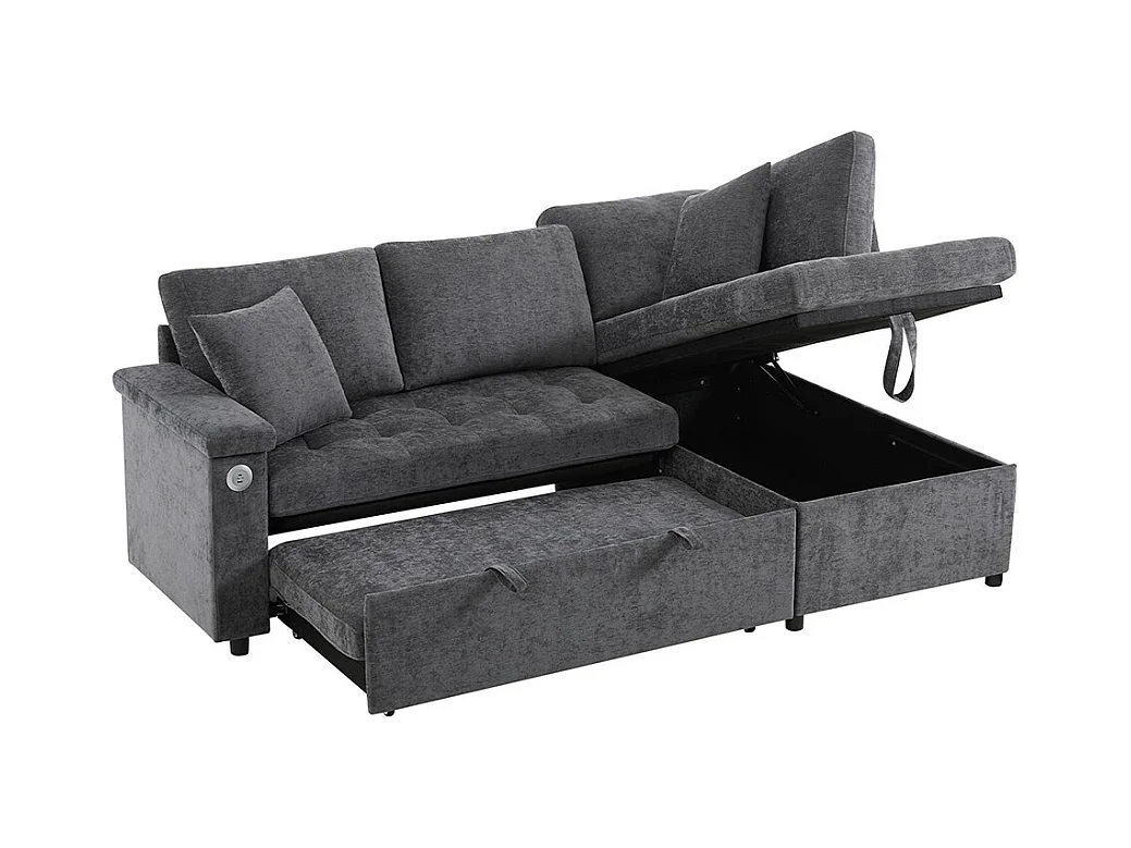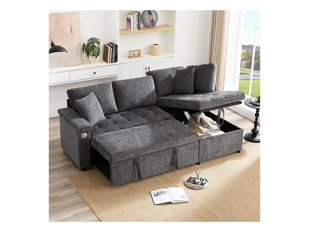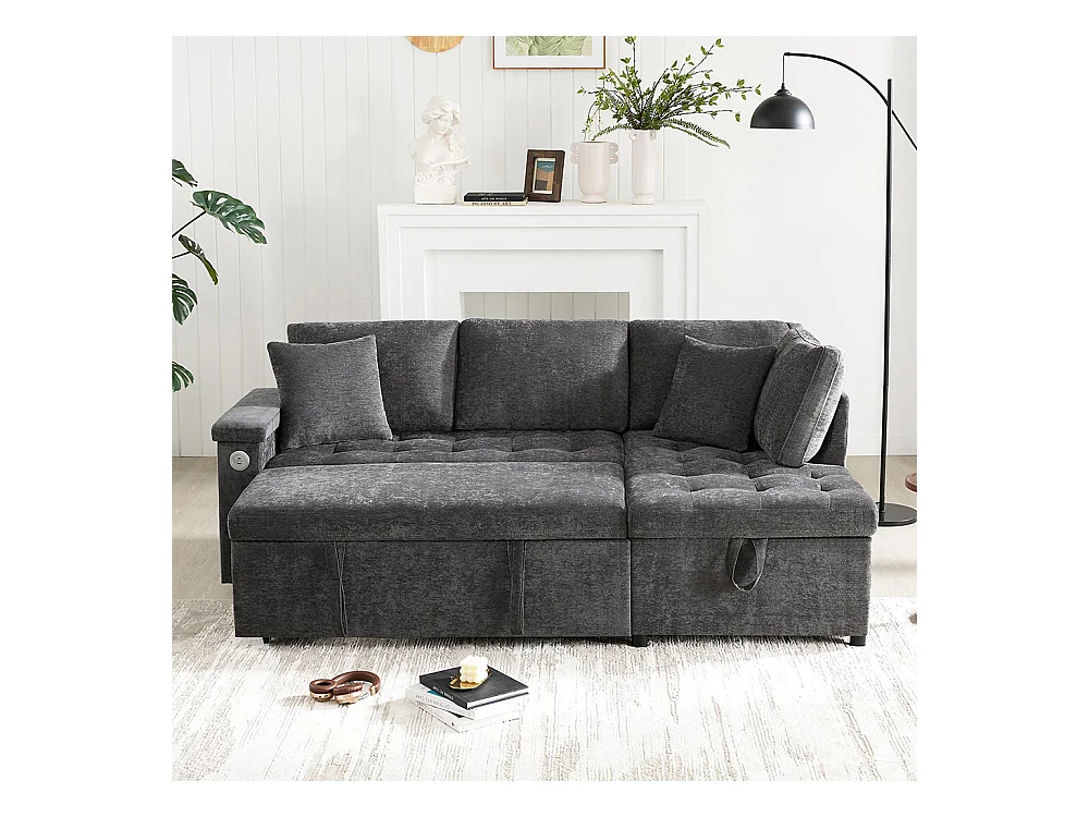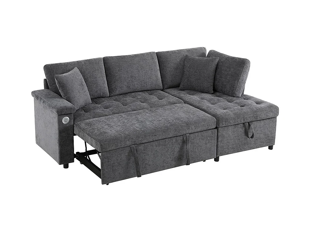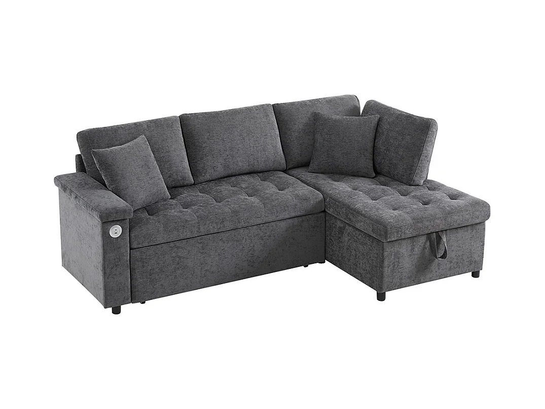 Canapé d'angle moderne convertible canapé-lit rangement chargeur USB accoudoir 2 coussins salon gris foncé