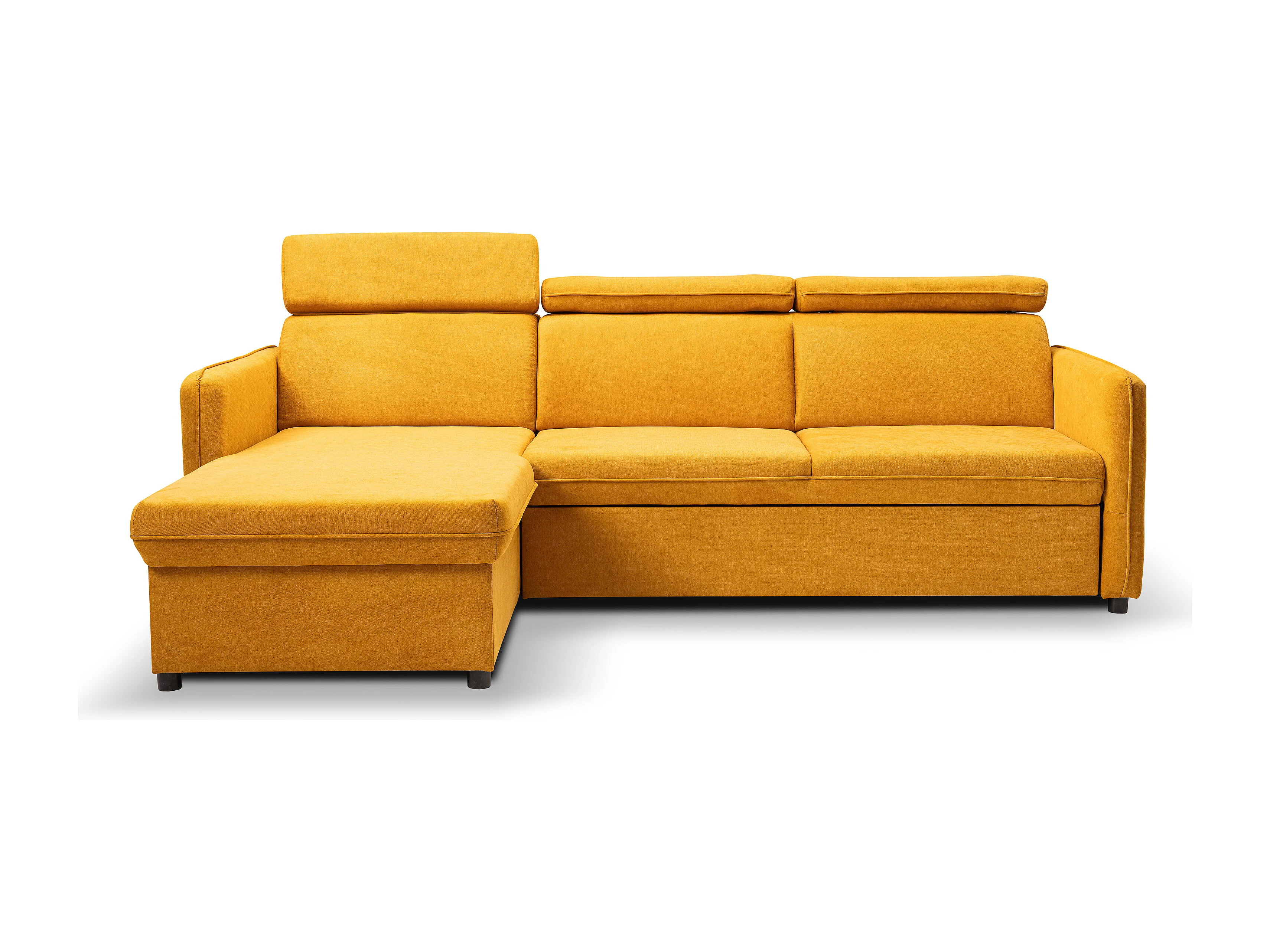 Canapé d'angle NOTTI convertible - Tétières mobiles - Coffre de rangement - Tissu lisse jaune moutarde- Angle réversible
