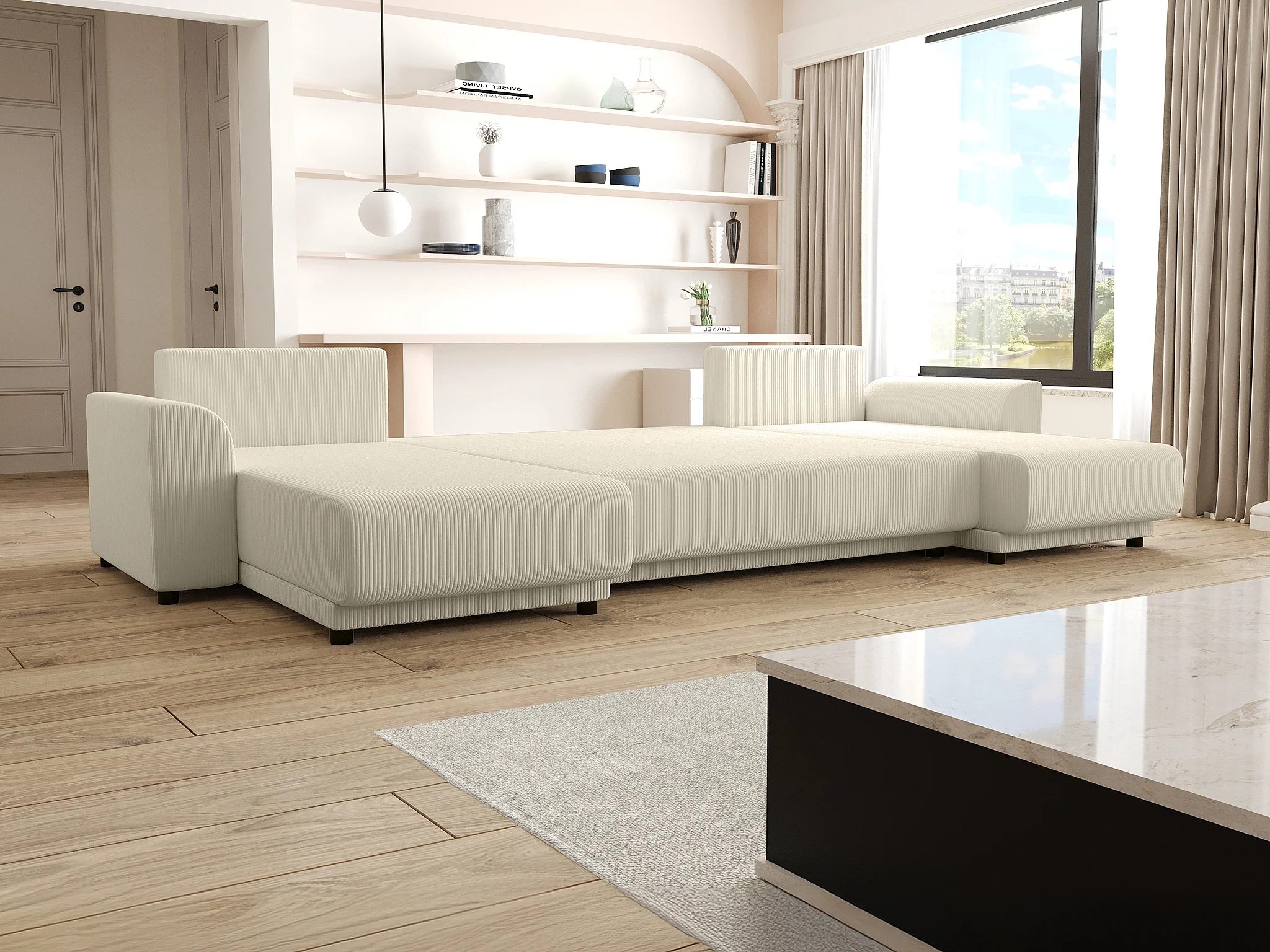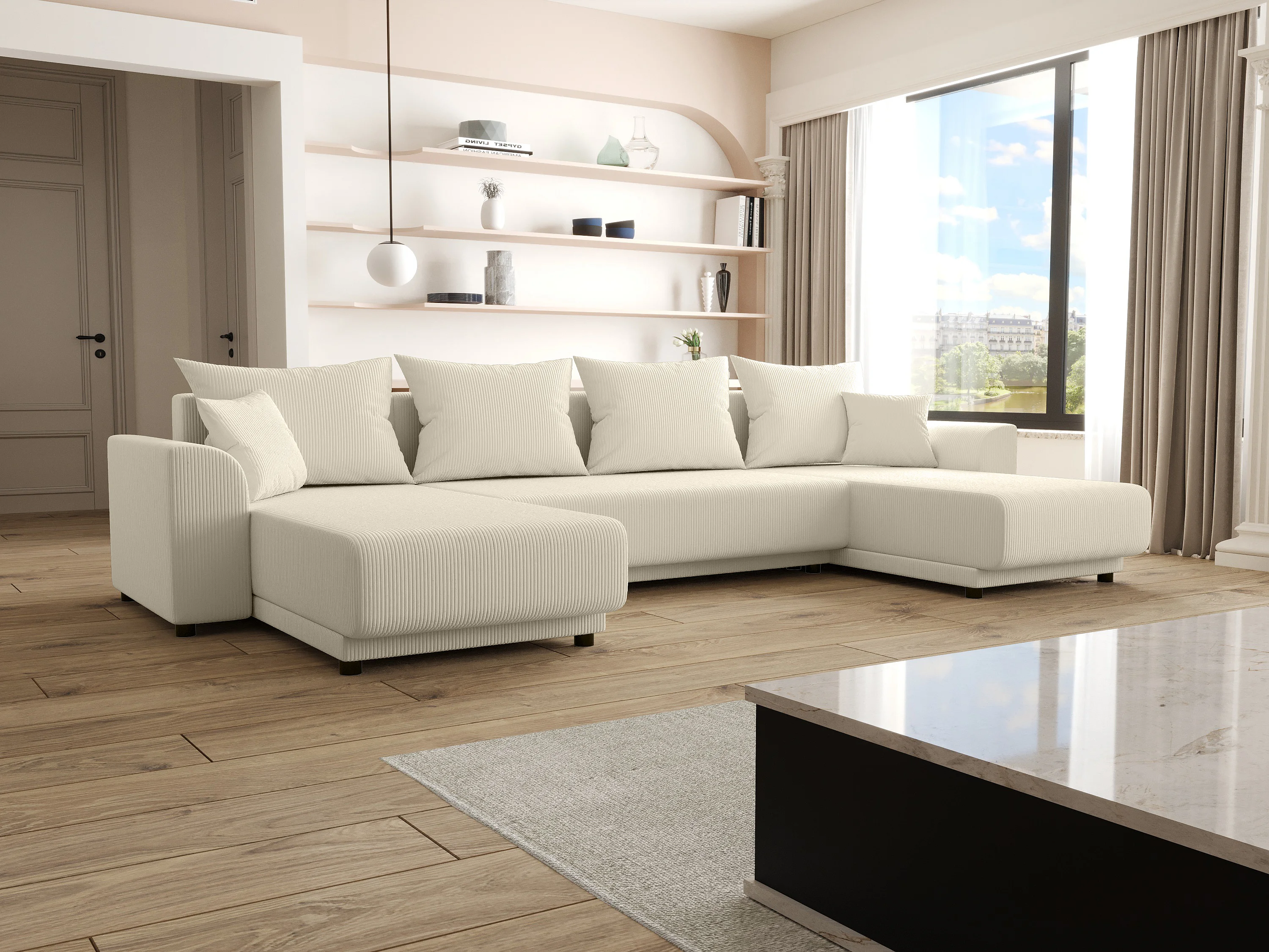 Canapé d'angle panoramique convertible en velours côtelé beige NESSARO