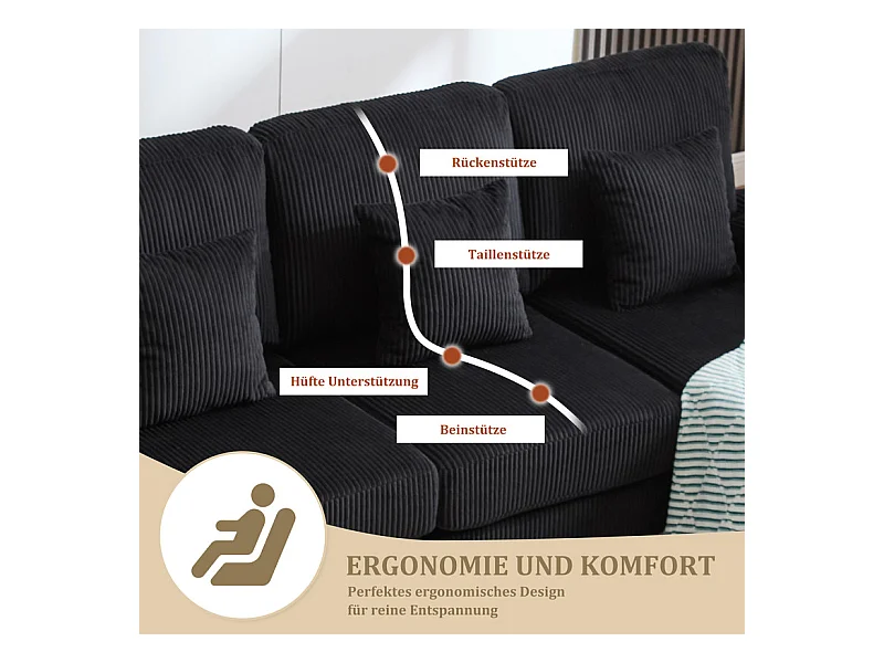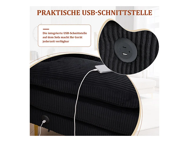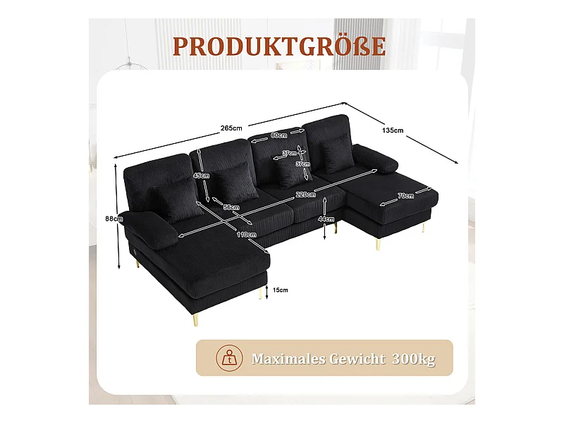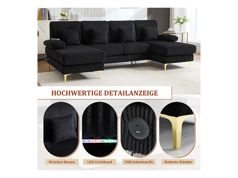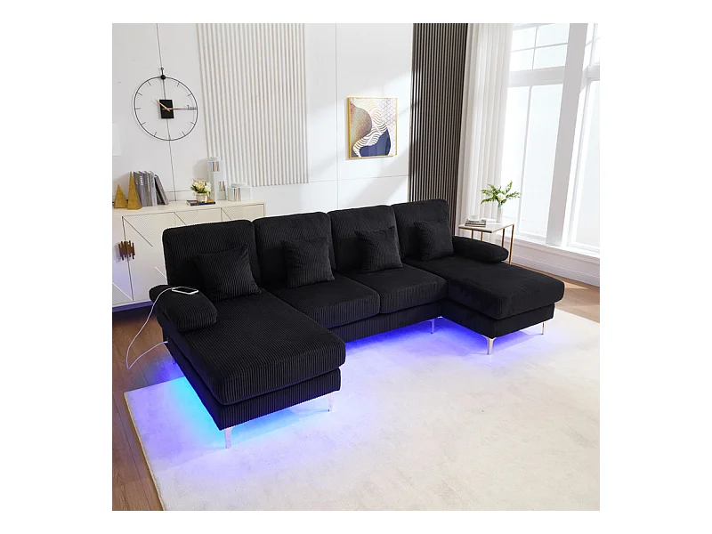 Canapé d'angle panoramique en velours - 4 places - avec LED RGB et Port USB+Type-C - 265x135x88cm - Noir