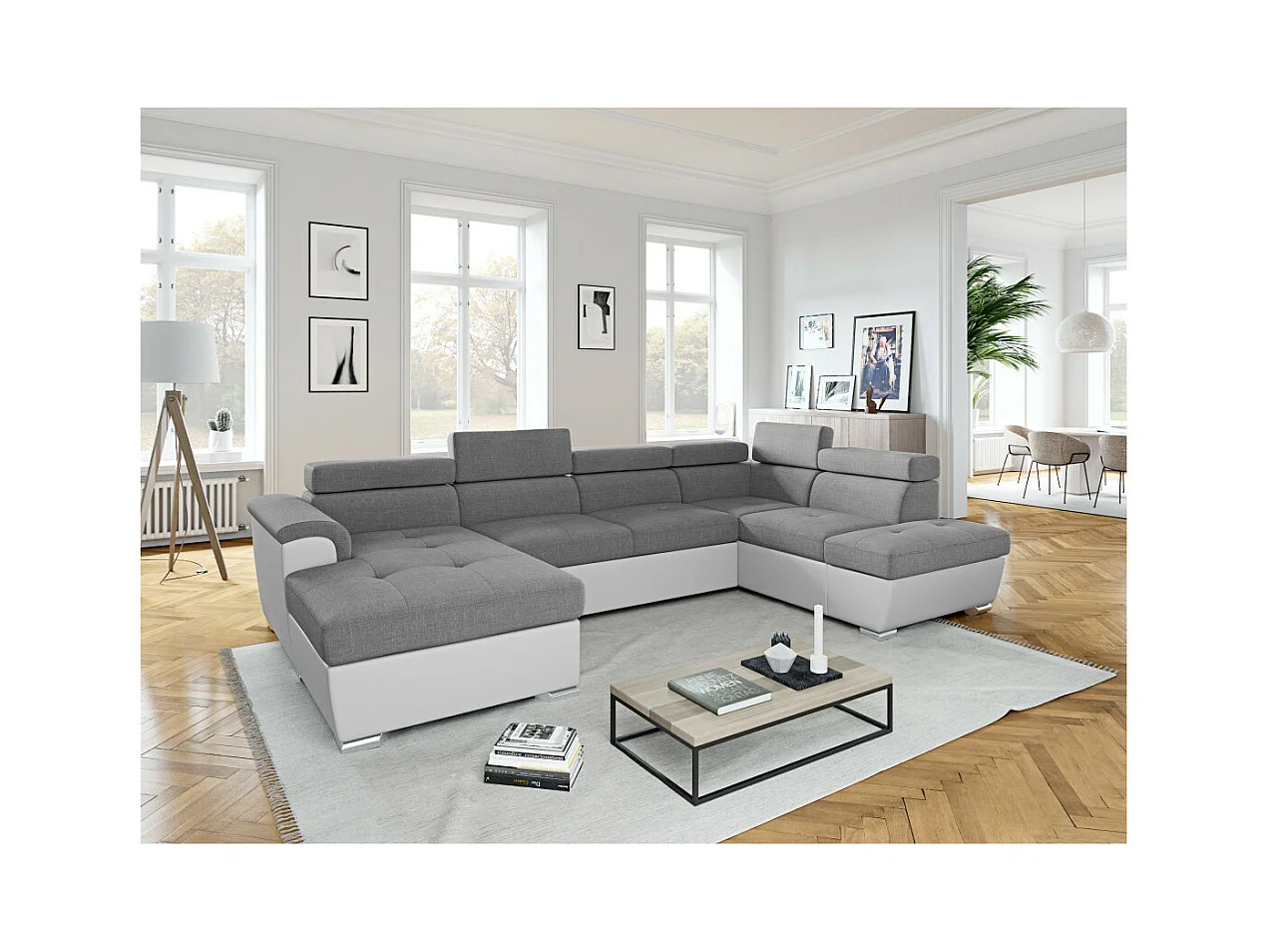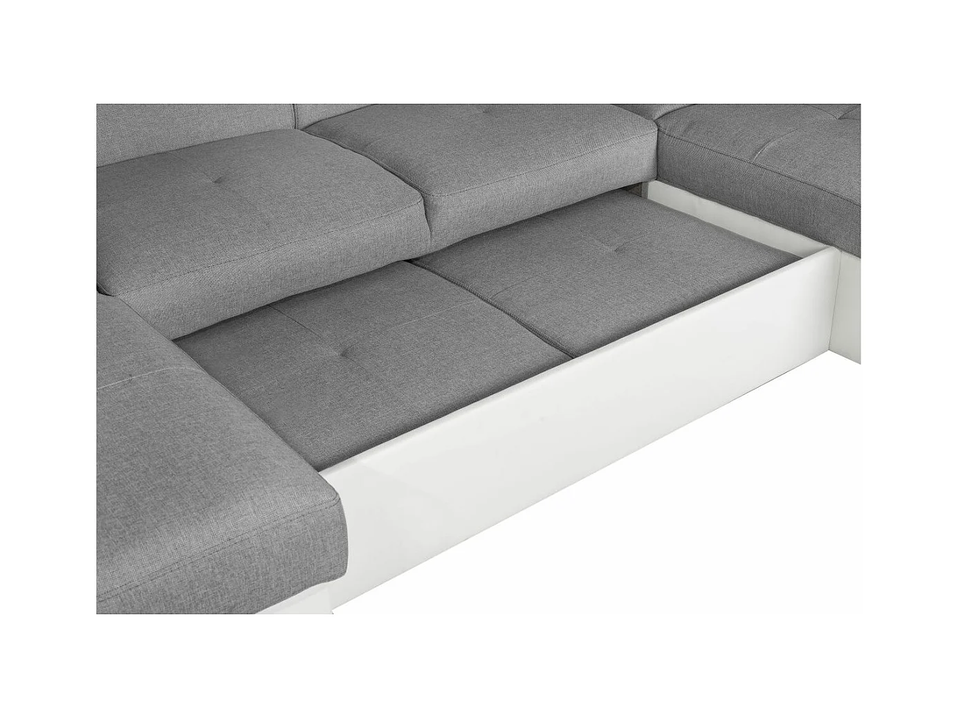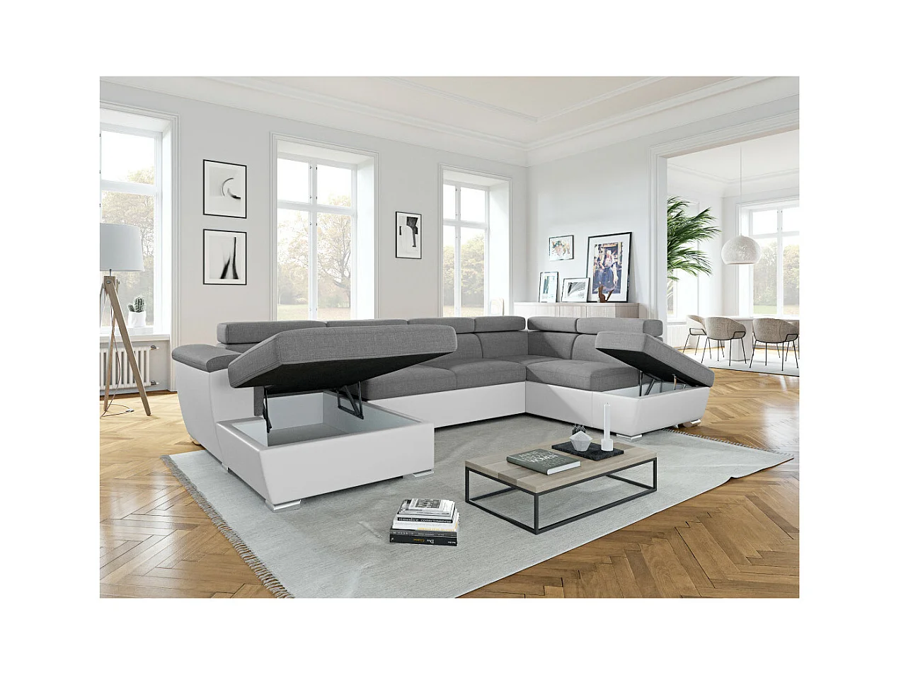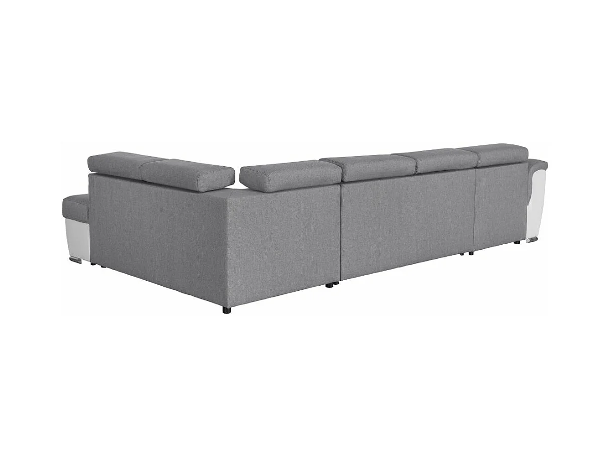 Canapé d'angle Panoramique 6 Places Paola Convertible en Simili/Tissu Avec Coffres - Blanc/Gris - L322 x P196 x H76cm - Loungitude