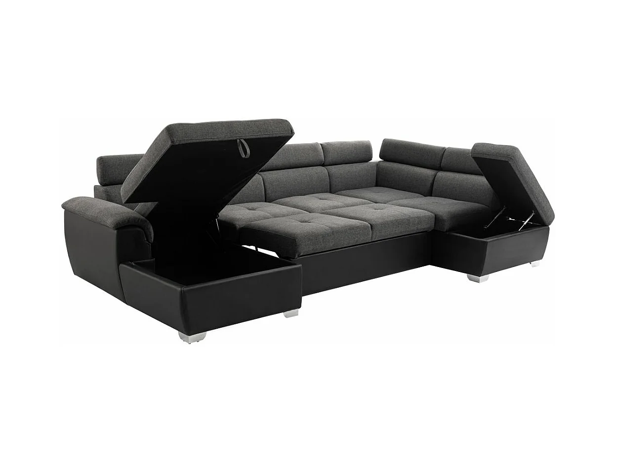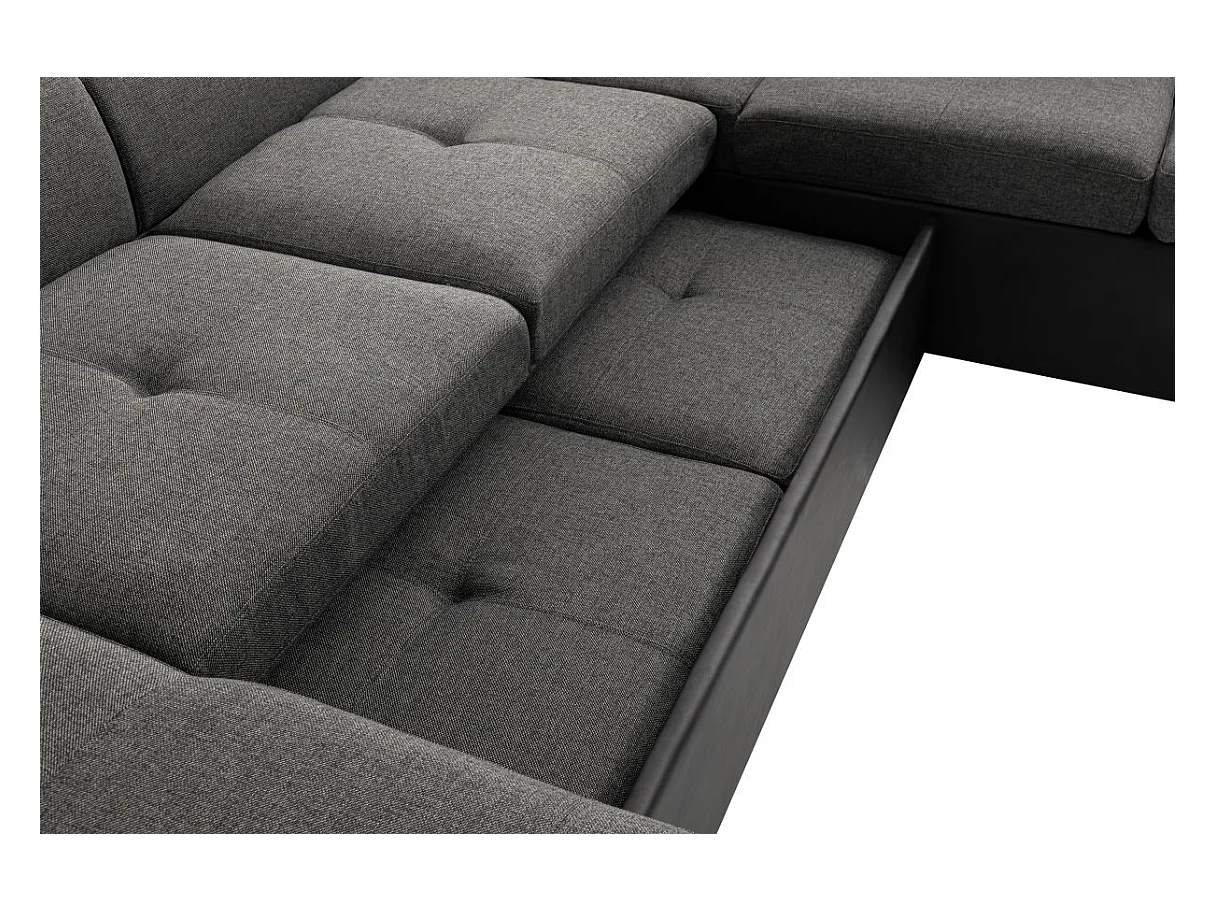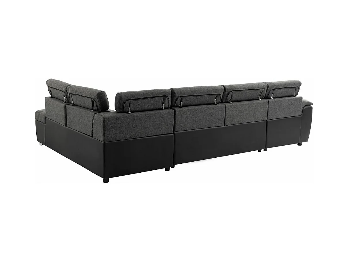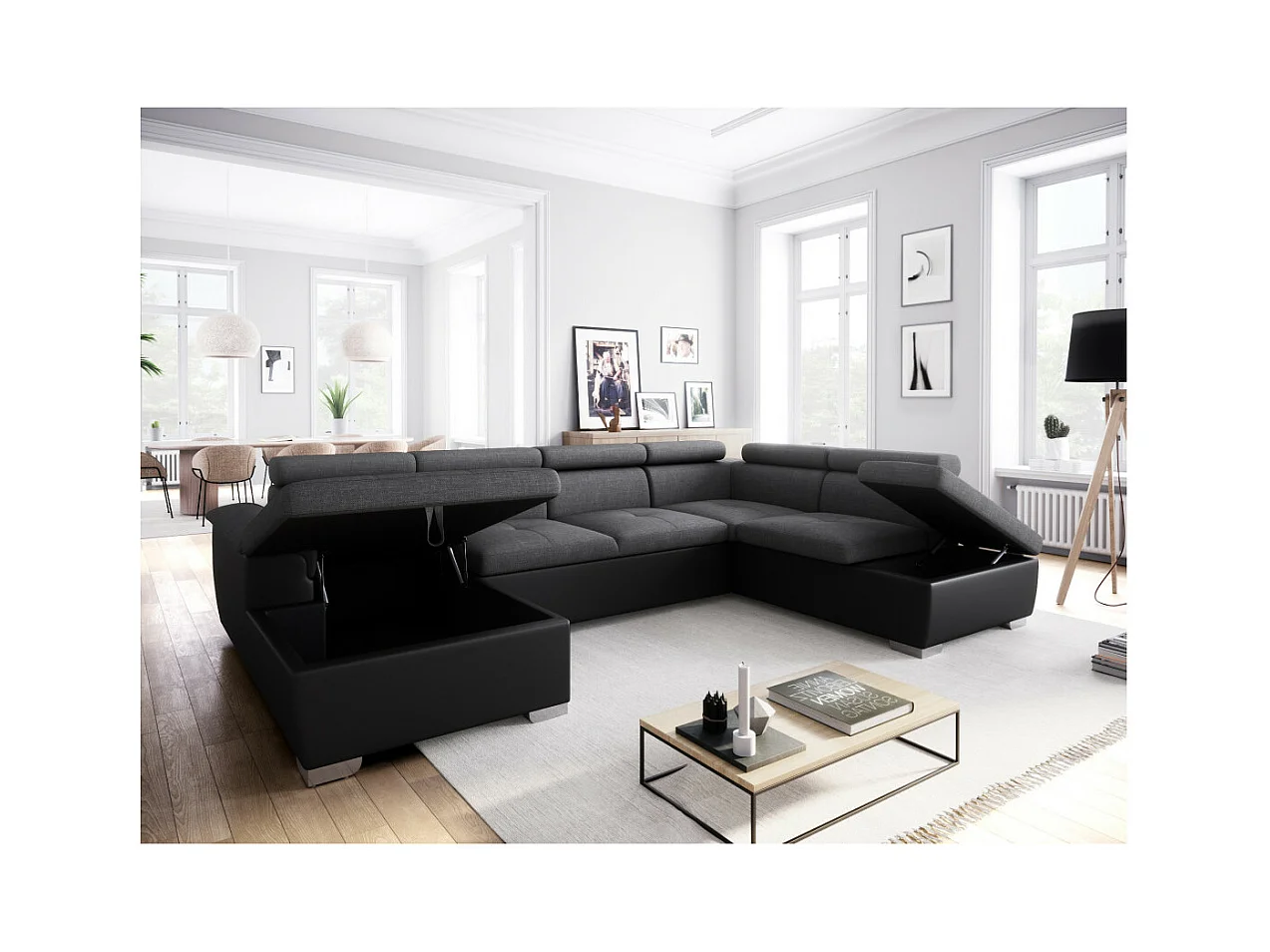 Canapé d'angle Panoramique 6 Places Paola Convertible en Simili et Tissu Avec Coffres - Gris/Noir - L322 x P196 x H76cm - Loungitude