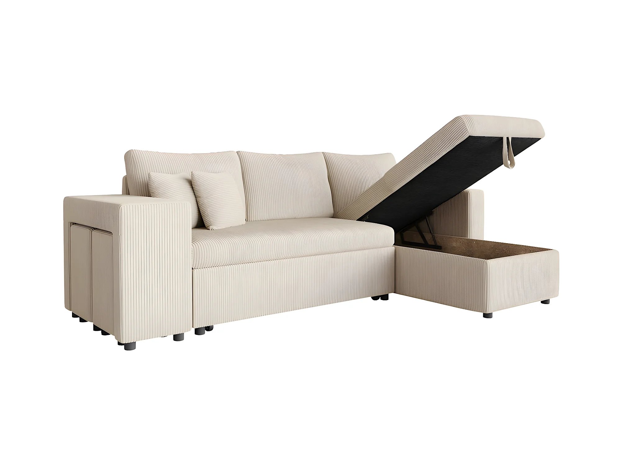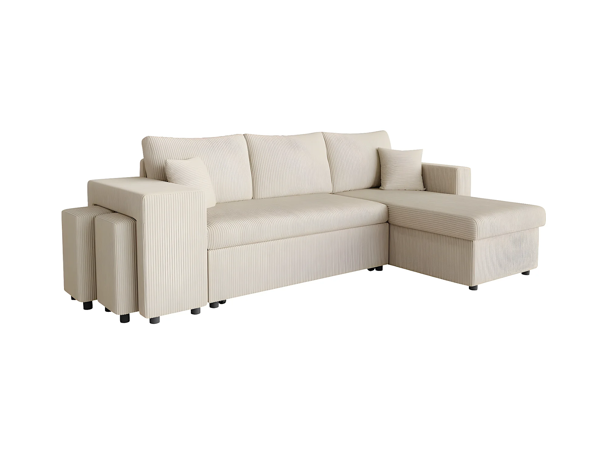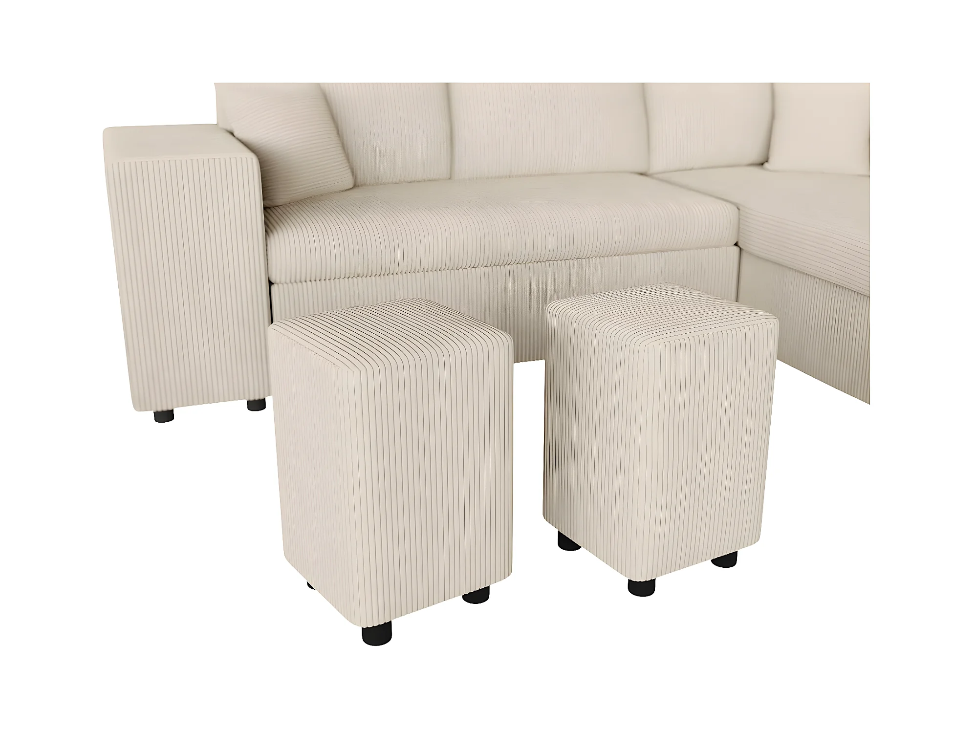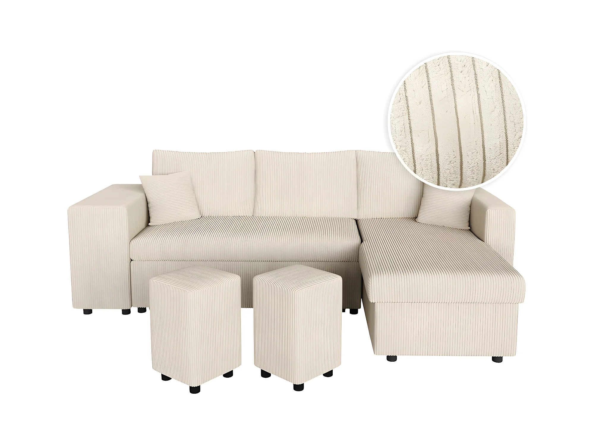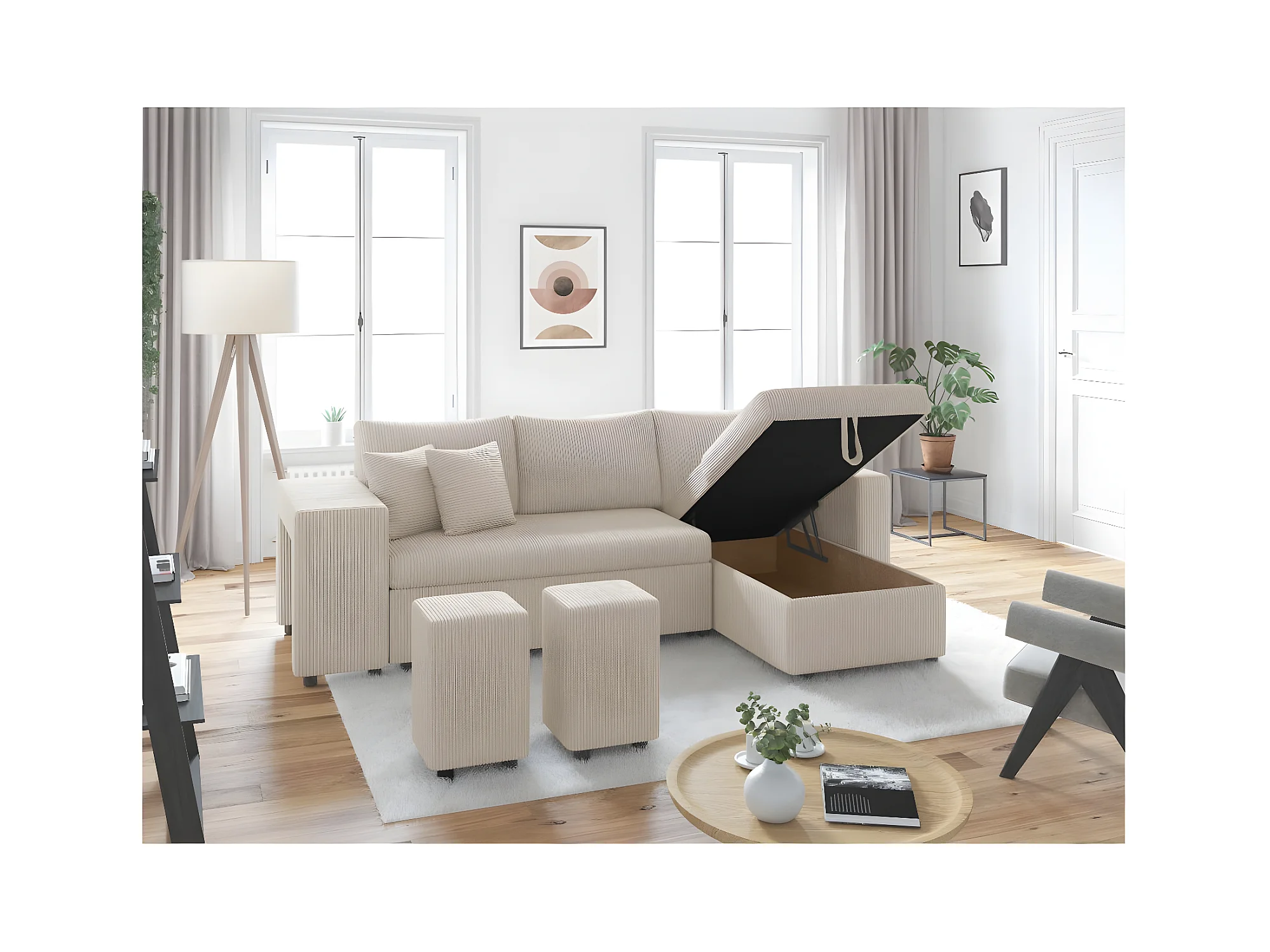 Canapé d'angle réversible convertible Oslo avec coffre, 2 poufs à gauche en velours côtelé beige - L241 x P146 x H81cm - Loungitude