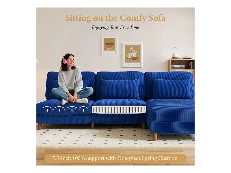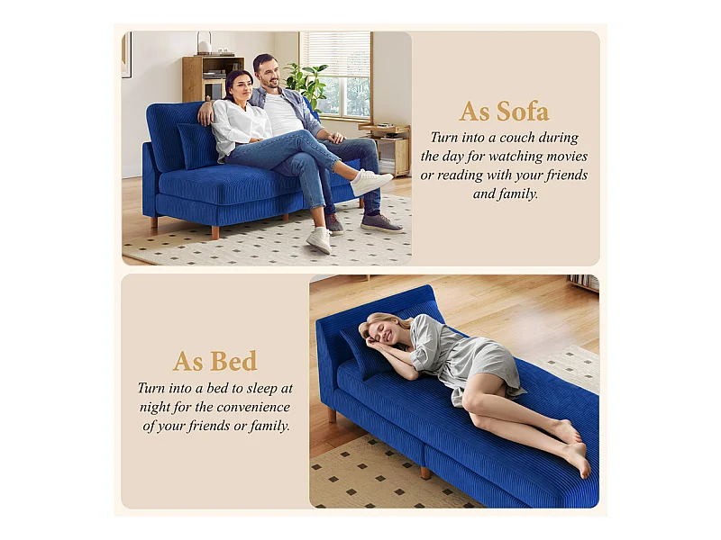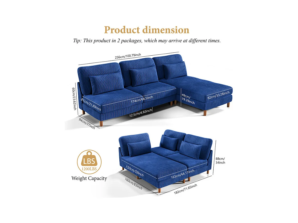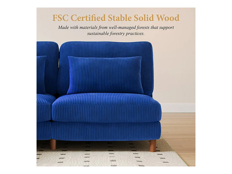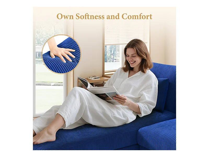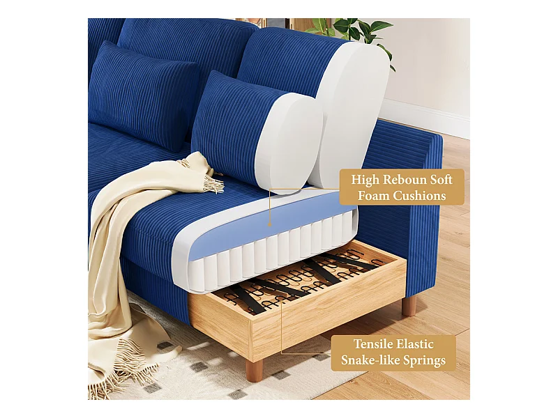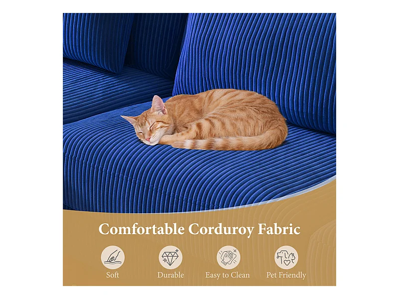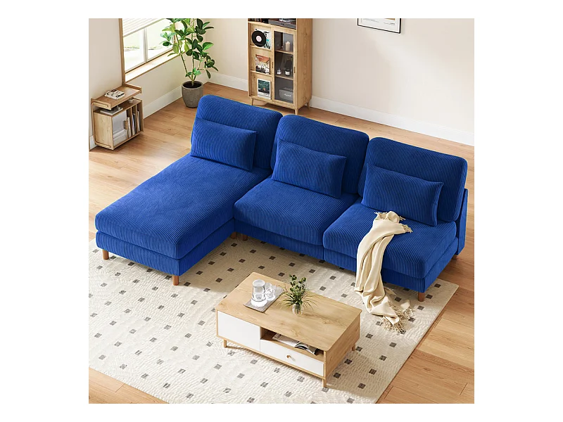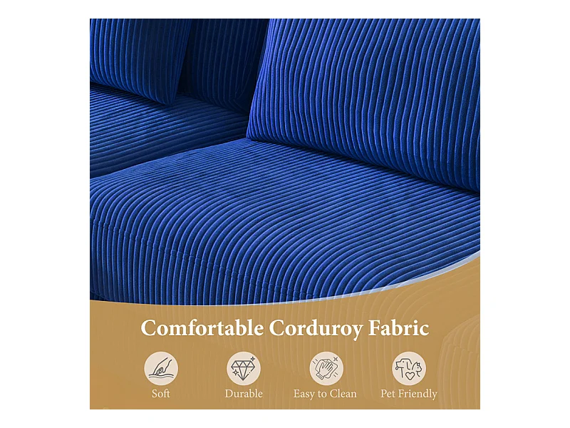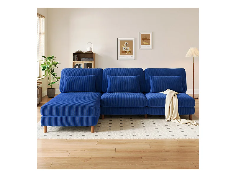 Canapé d'angle réversible en velours cotelé - 2 places + méridienne - Bleu - 256 x 160 x 88 cm