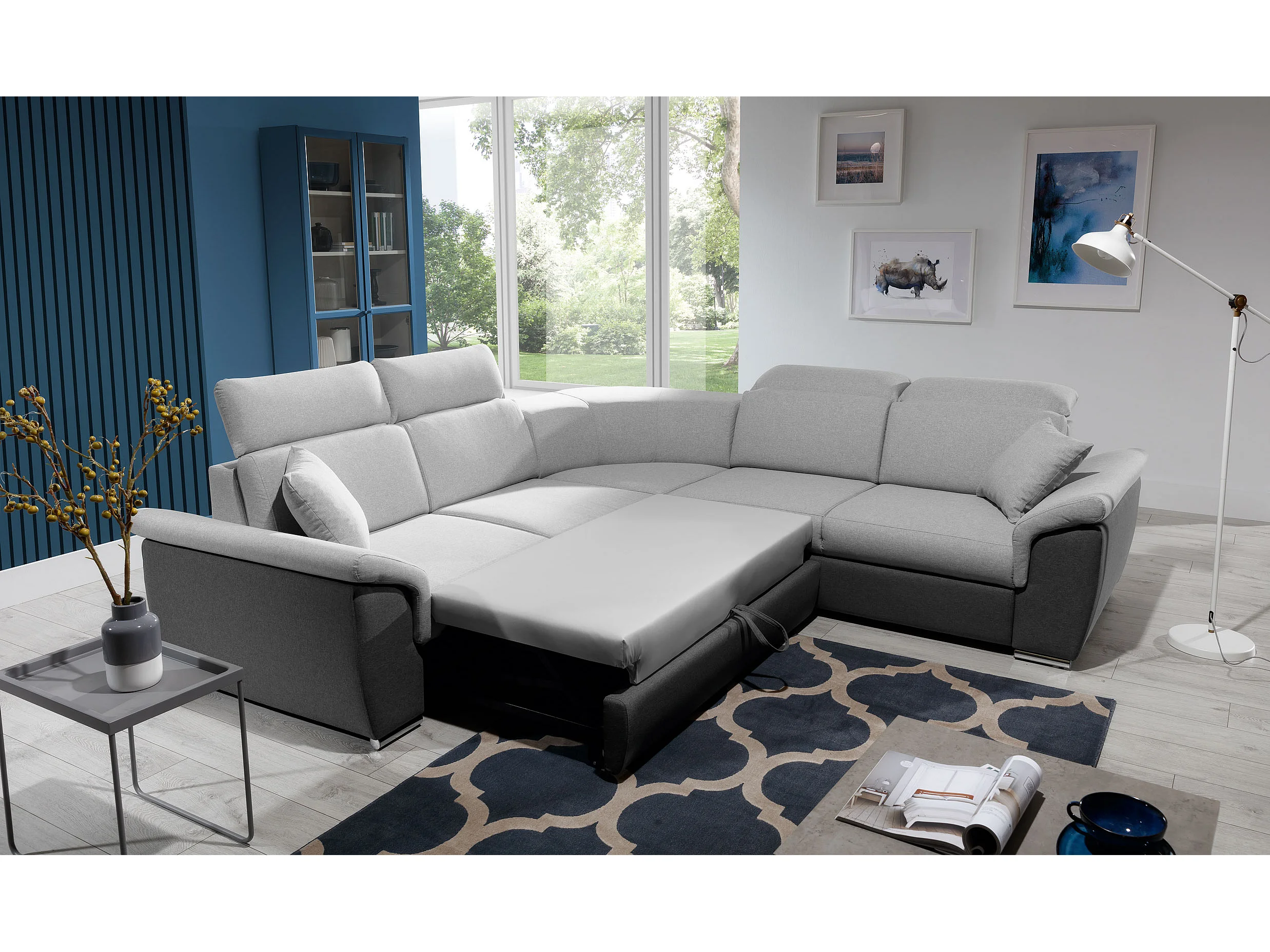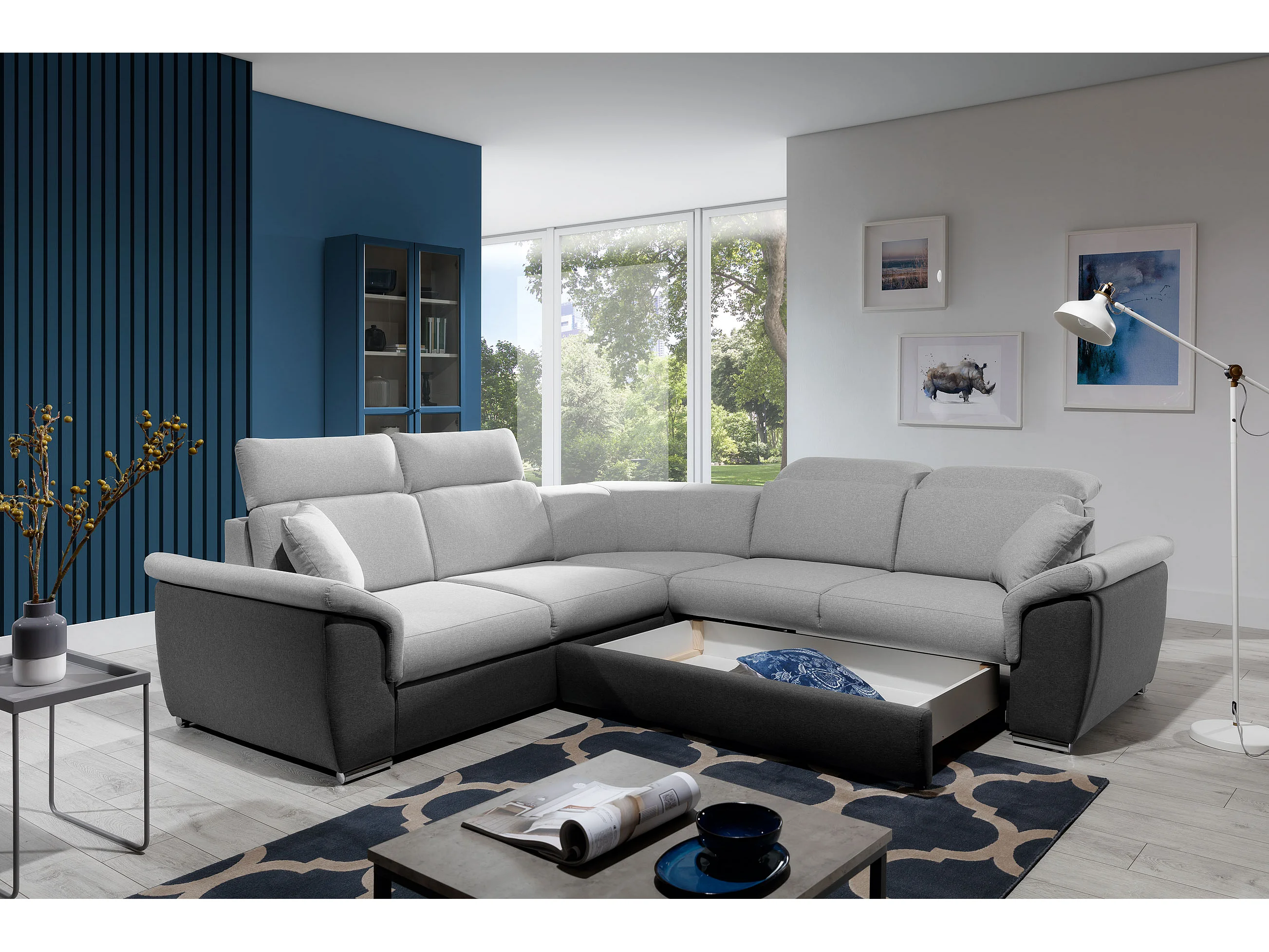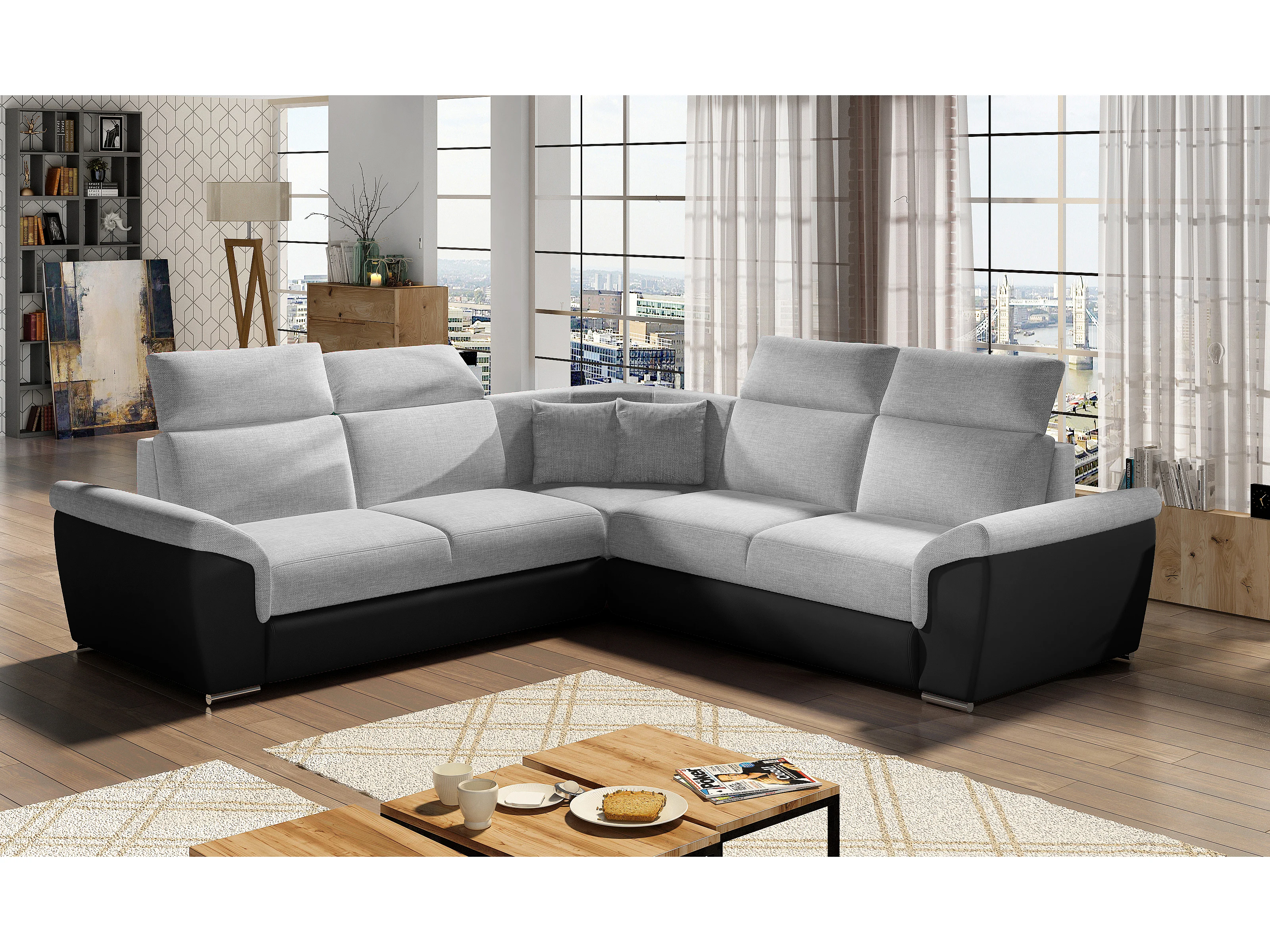 Canapé d'angle réversible et convertible bi-matières Neo - Pieds acier chromé-Noir/Gris clair