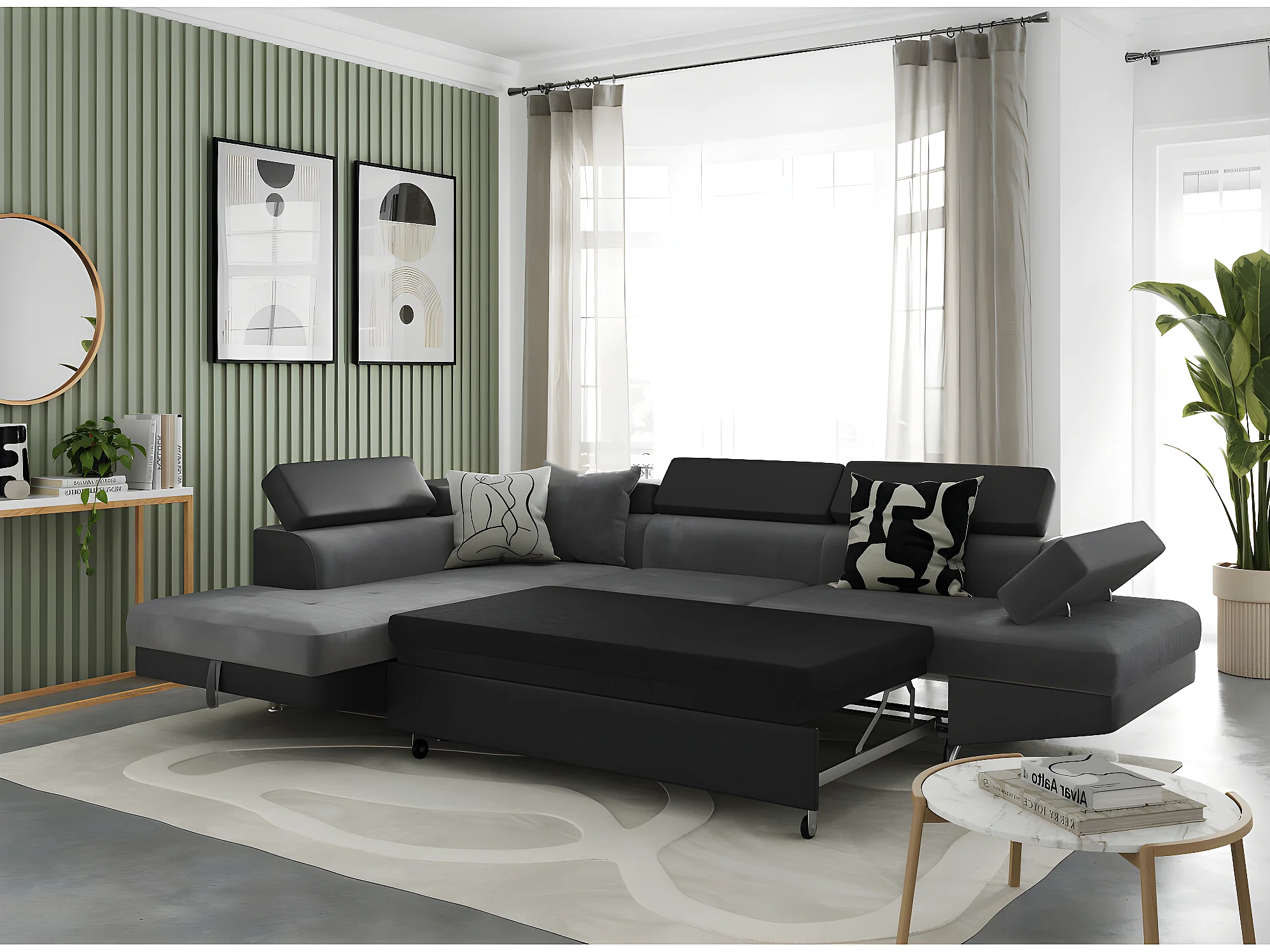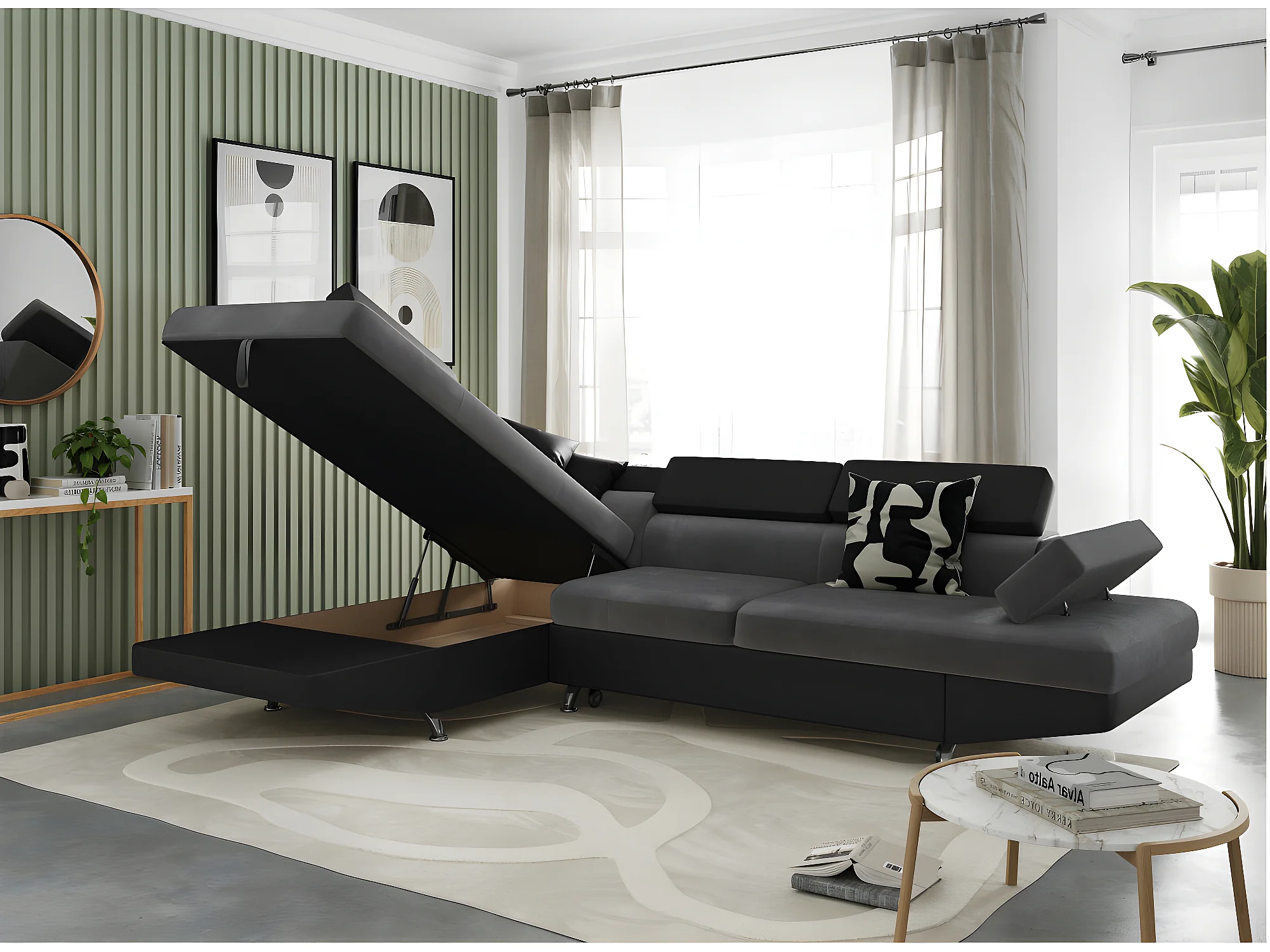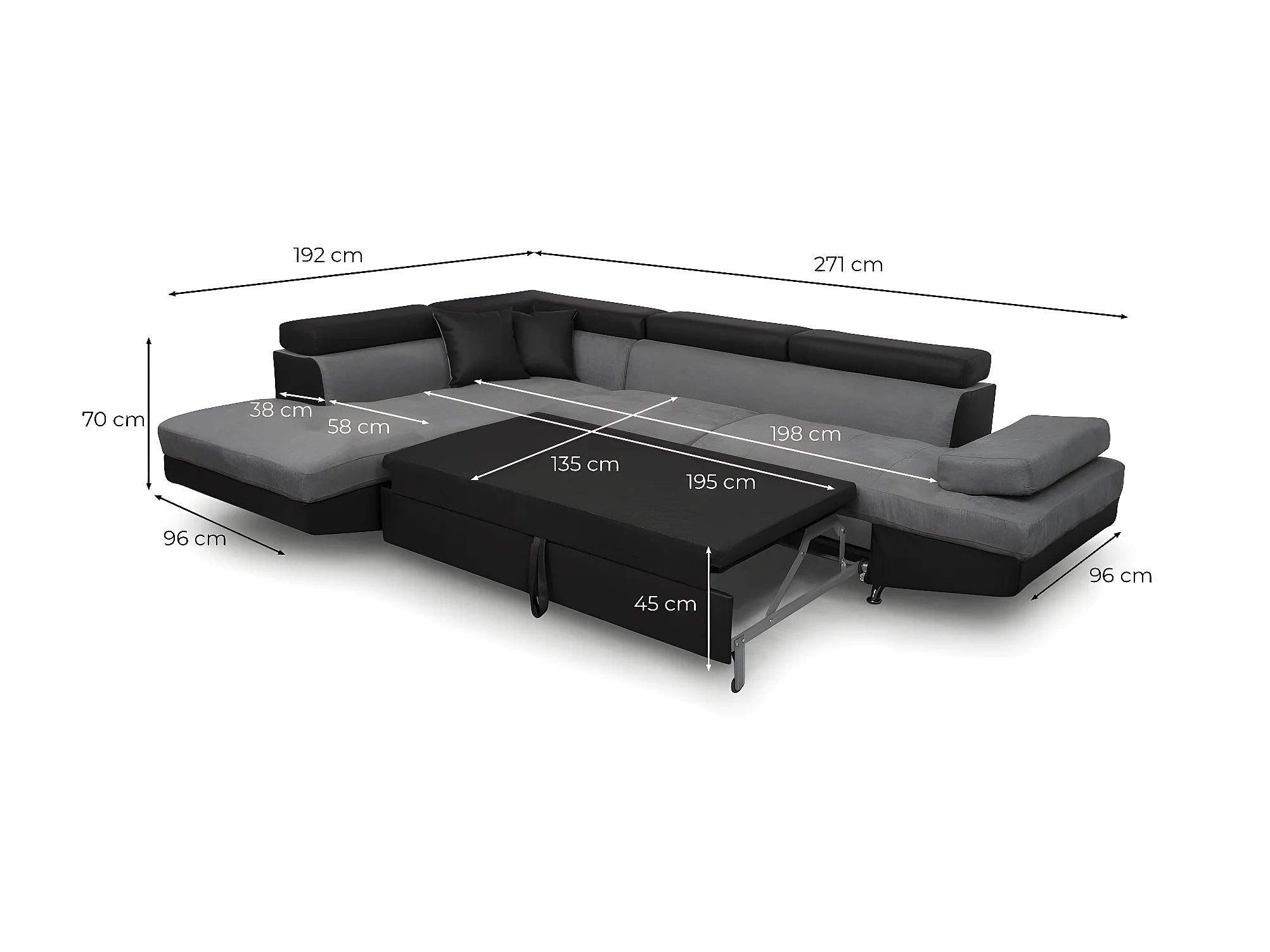 Canapé d'angle gauche 5 places Rio Convertible avec coffre en microfibre et simili - Gris/Noir - L271 x P192 x H70cm - Loungitude