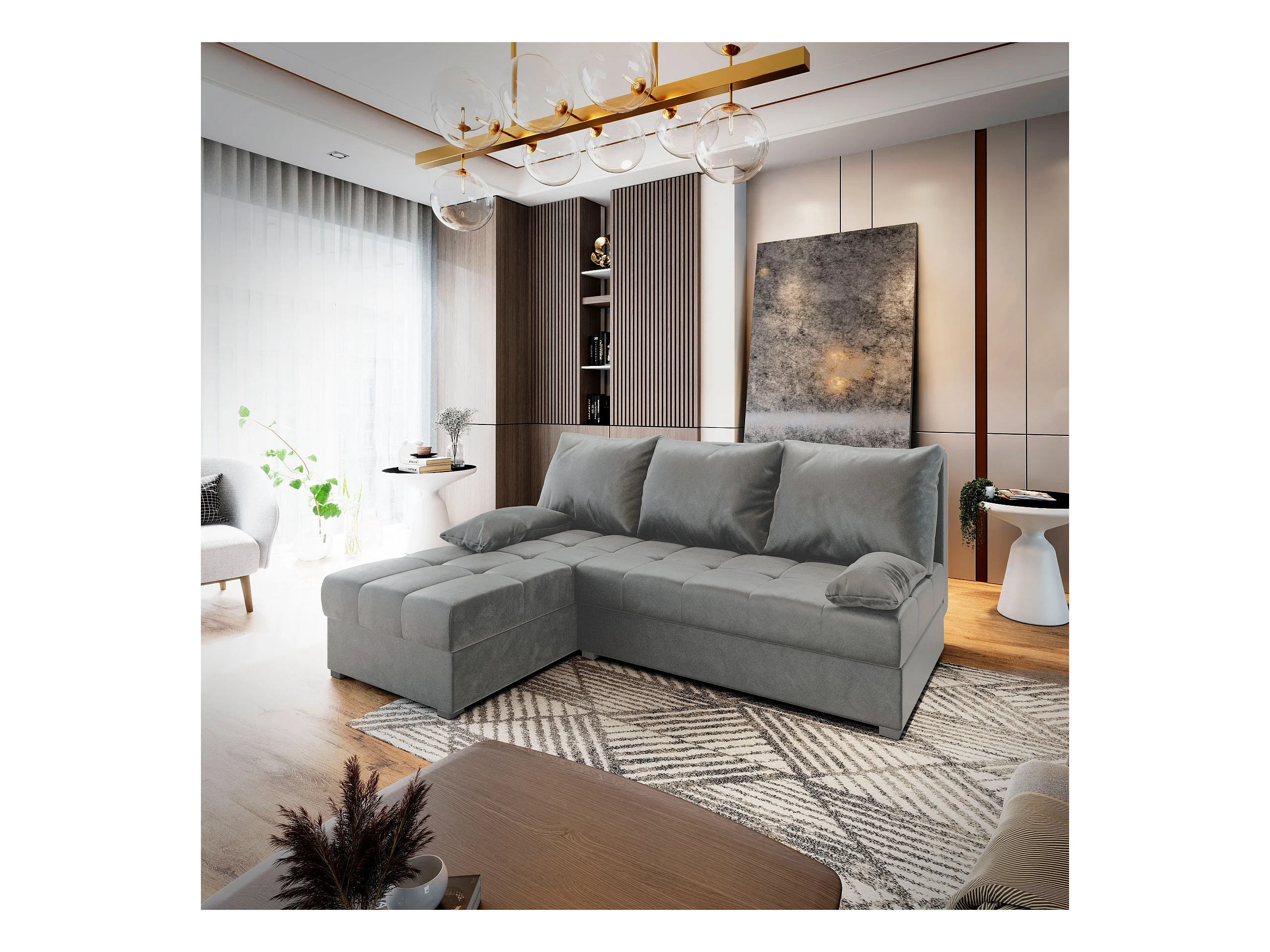 Canapé d'angle RITA Gris clair en peluche avec fonction de couchage