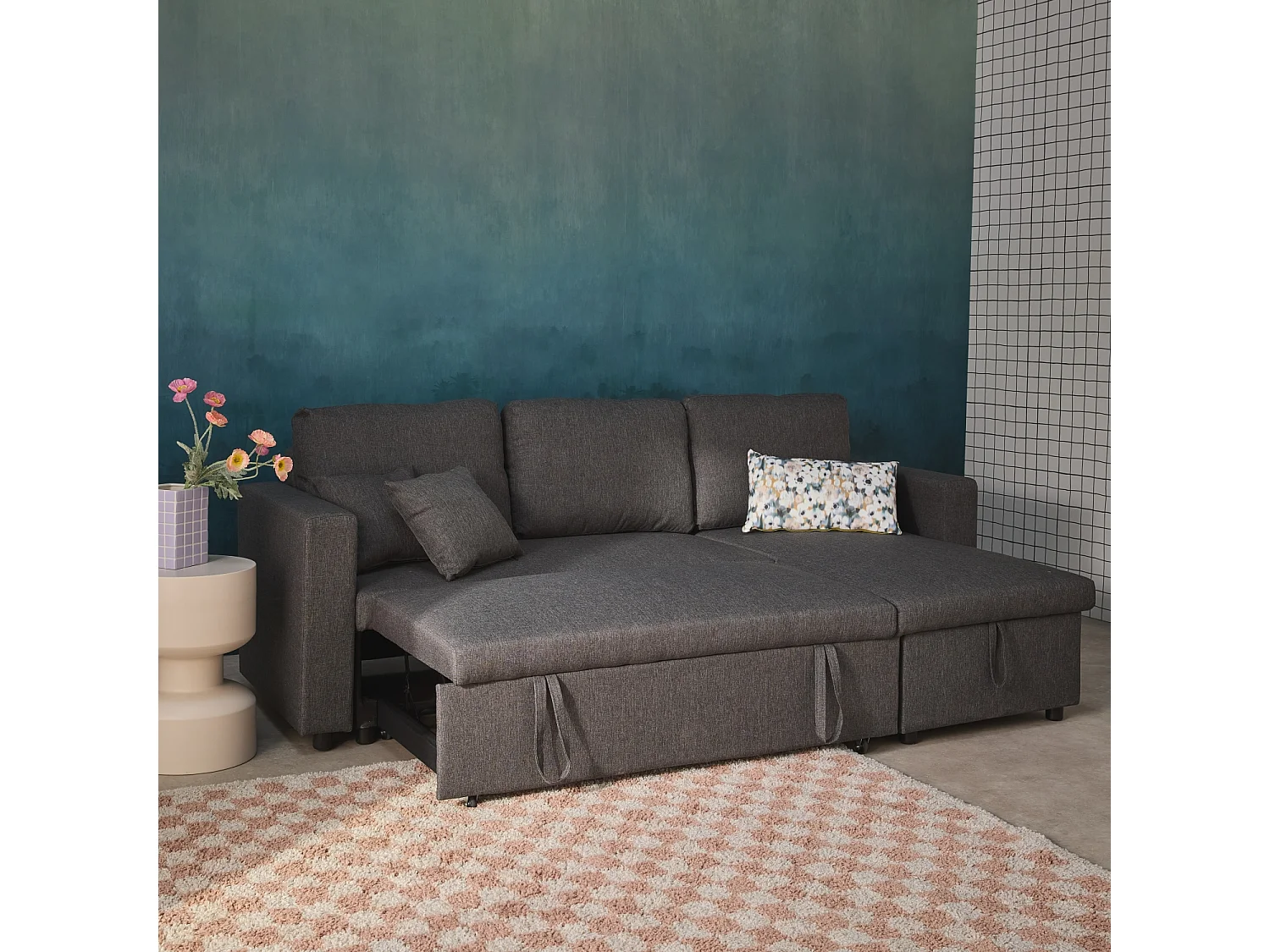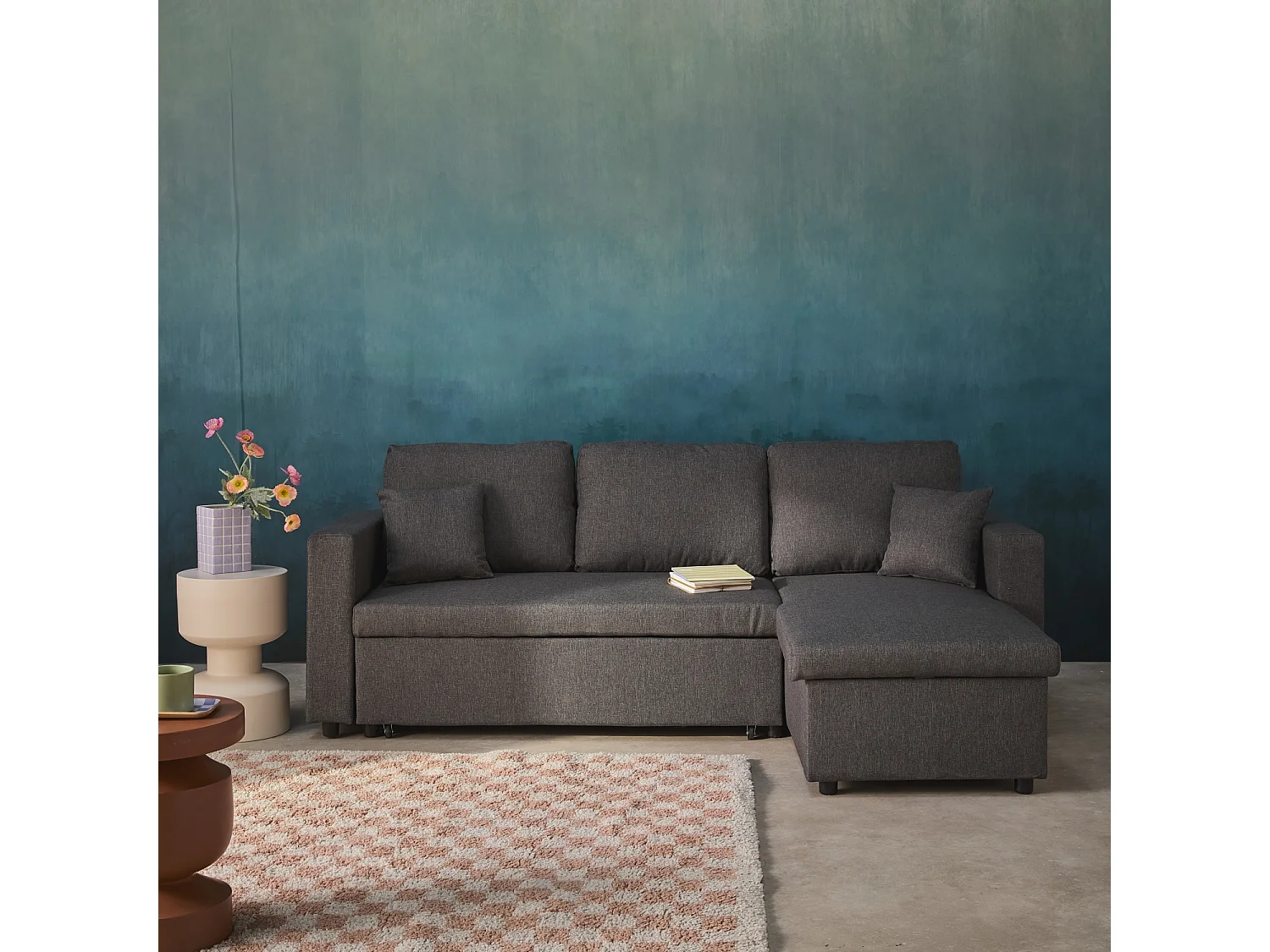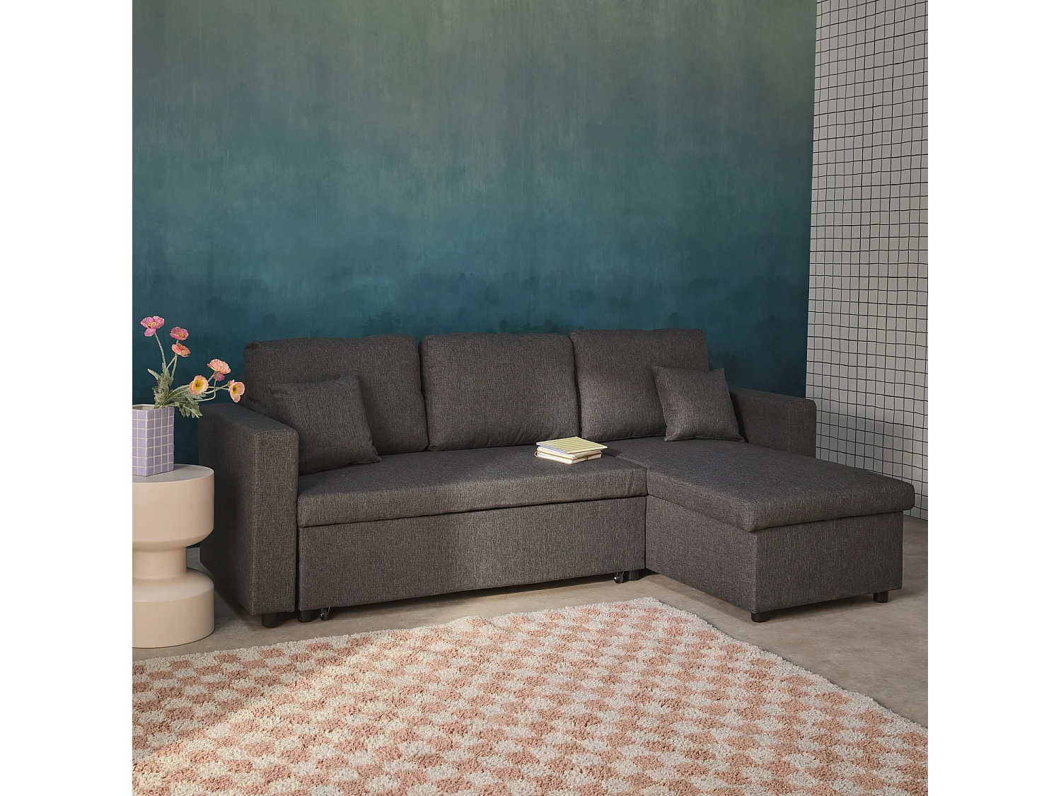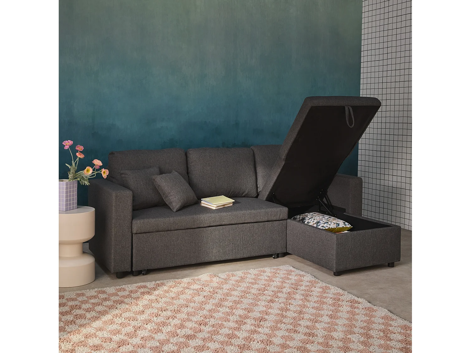Canapé d'angle SMILE convertible réversible compact 3 places en tissu gris foncé. L 213.5 x P 136.5 x H 83cm. avec coffre de rangement
