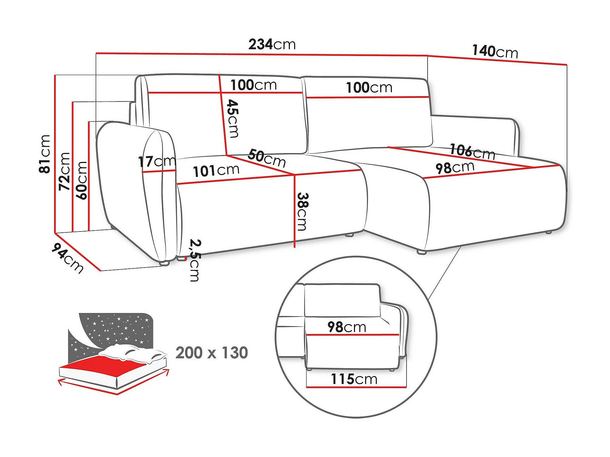 Canapé d'angle Temple 131, Bleu, Fonction de couchage, Boîte de literie, 234x140x81cm