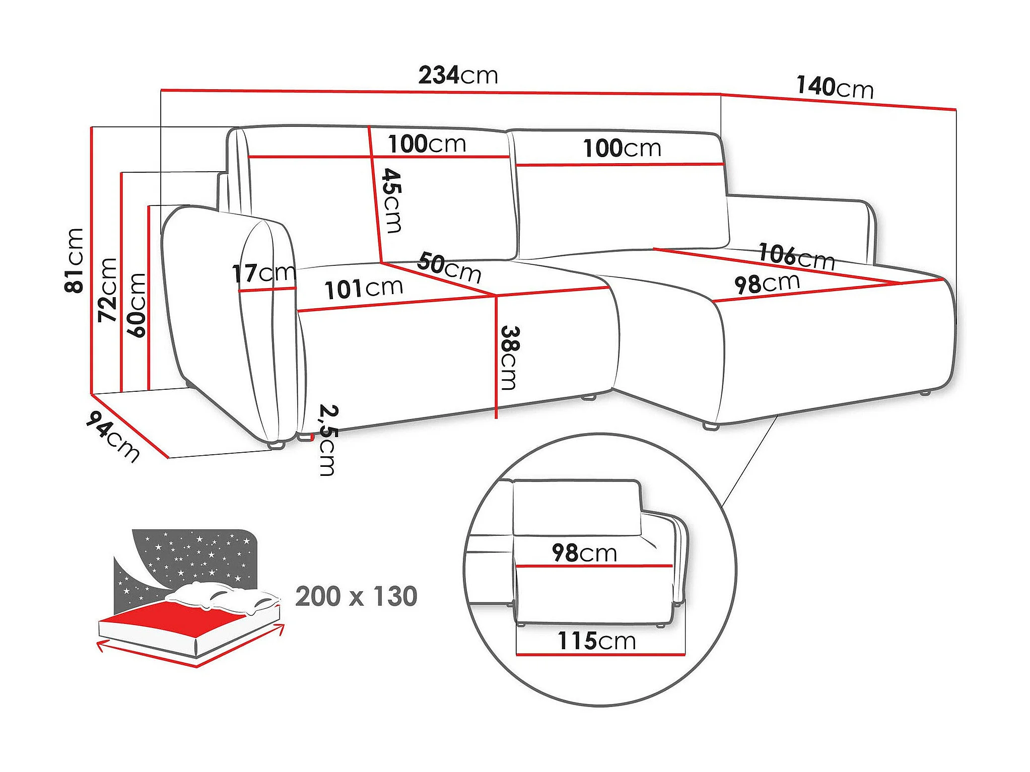 Canapé d'angle Temple 131, Brun clair, Fonction de couchage, Boîte de literie, 234x140cm