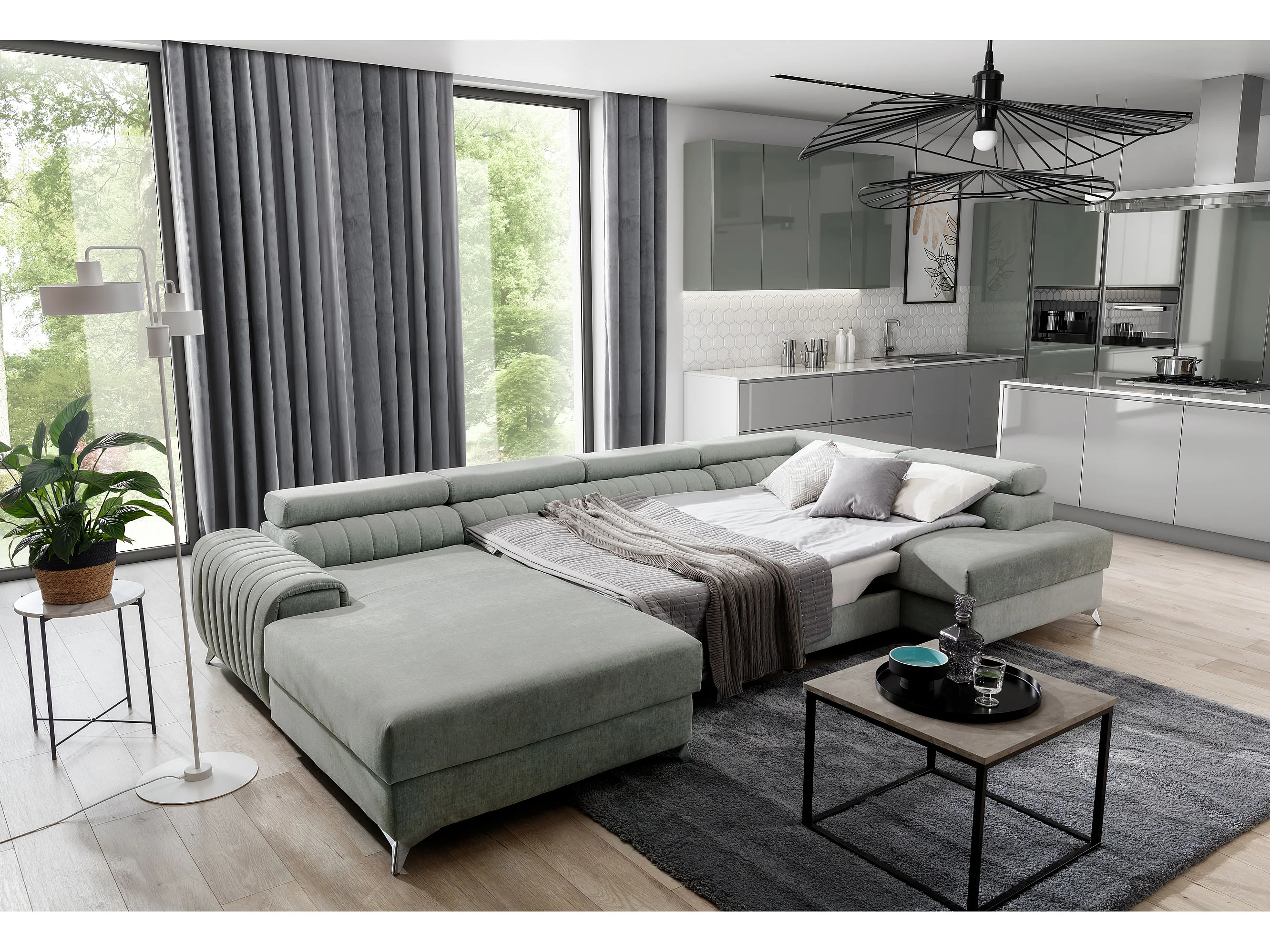 Canapé d'angle U velours beige coffre de rangement à droite Kalante 347cm