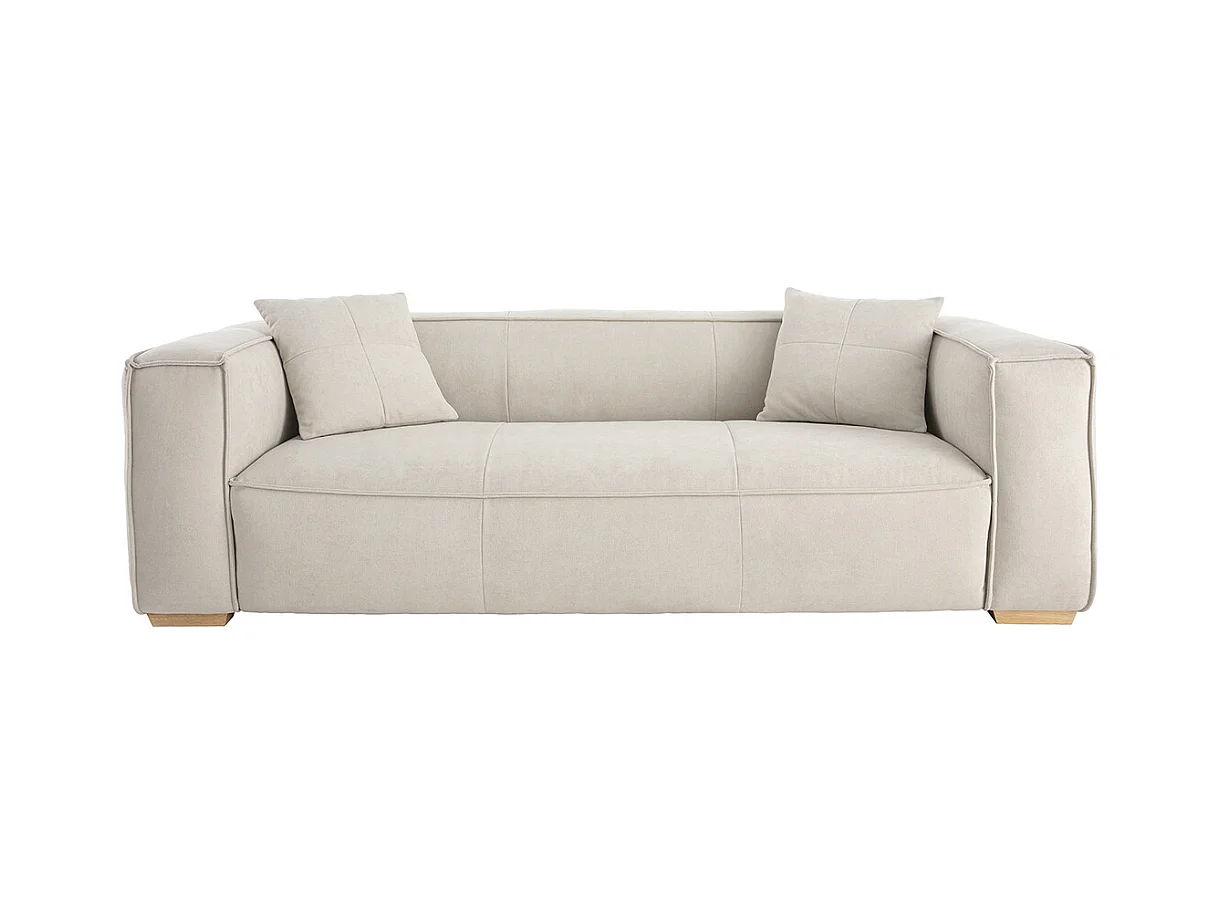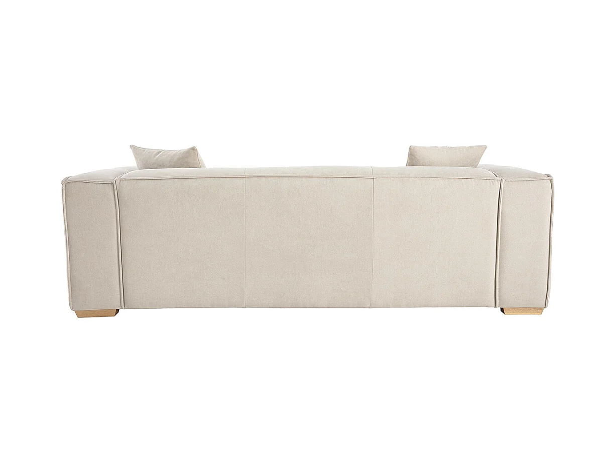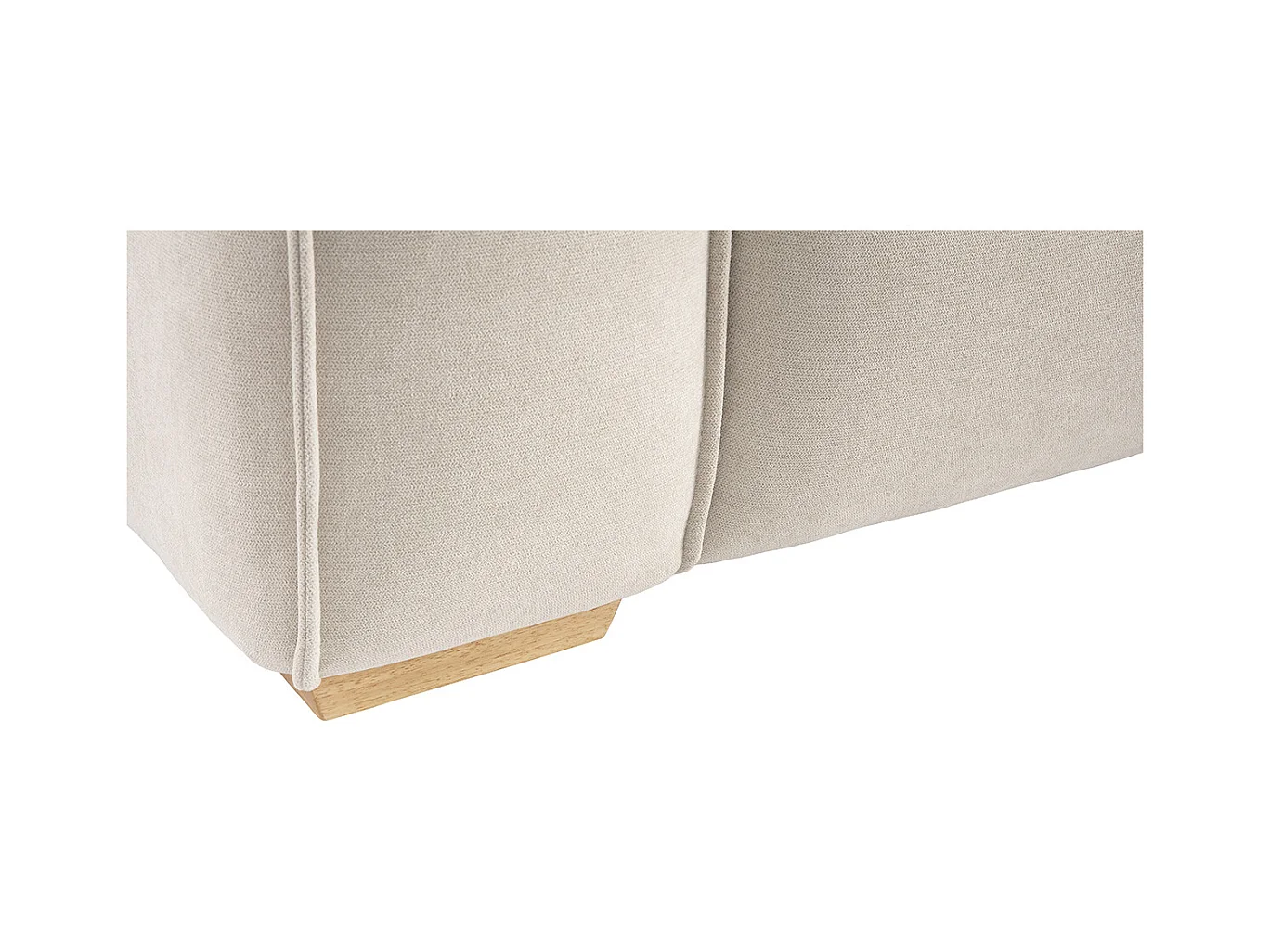 Canapé design 3 places en tissu effet velours beige naturel et bois clair COBAIN