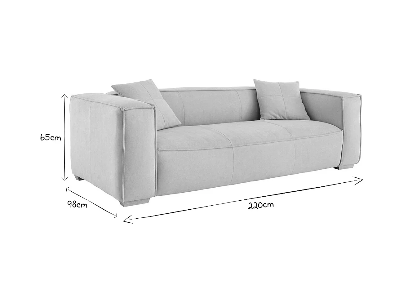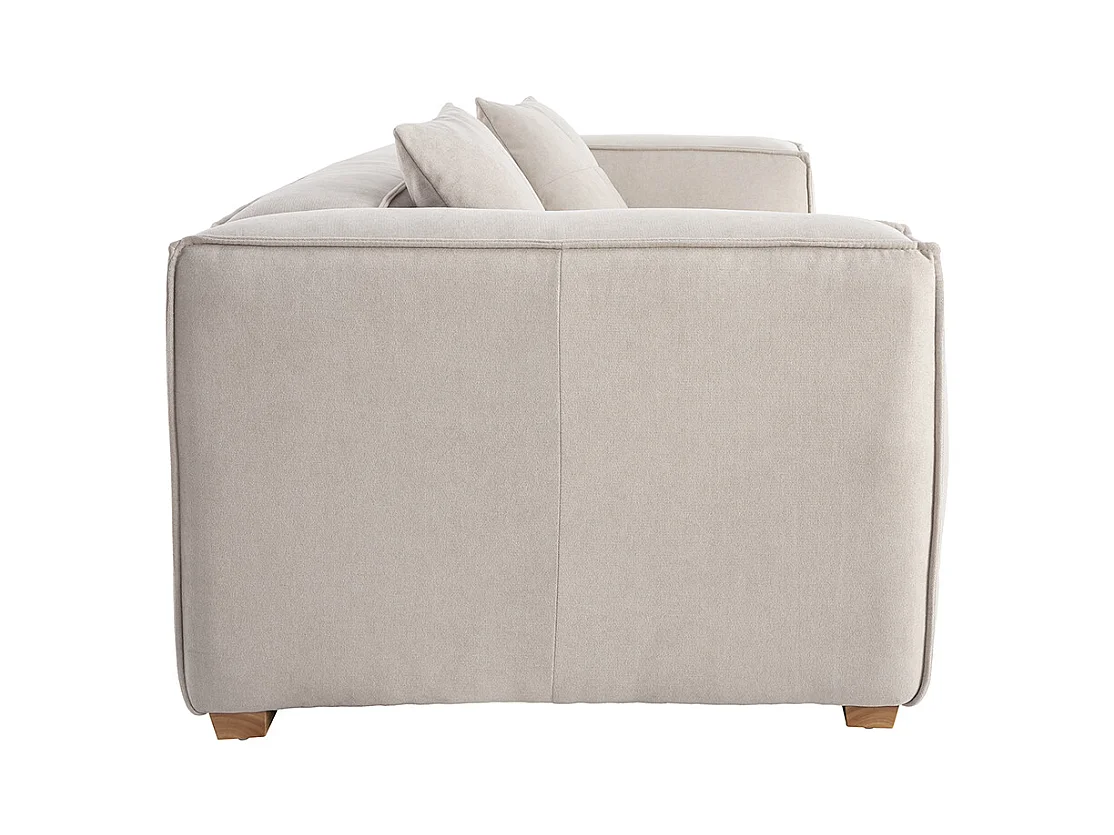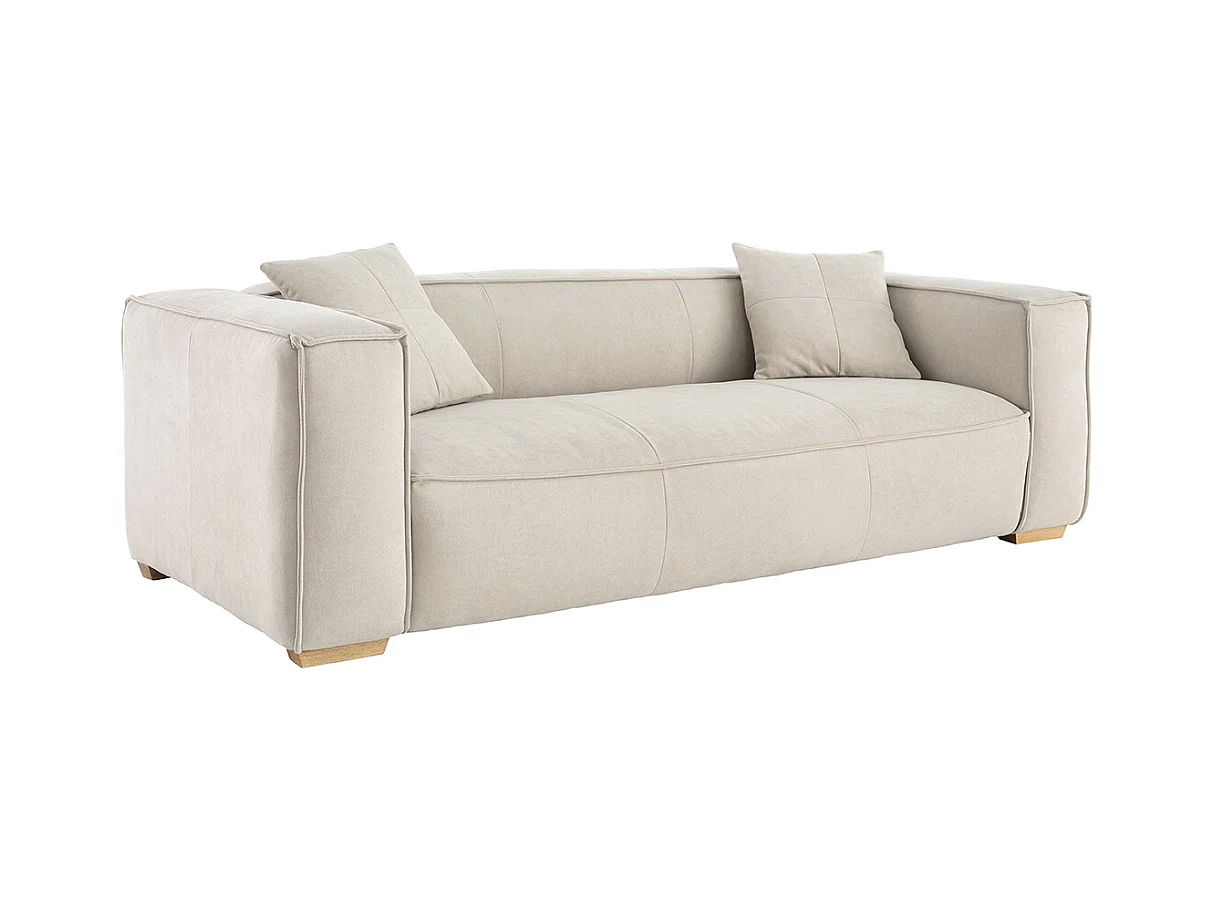Canapé design 3 places en tissu effet velours beige naturel et bois clair COBAIN