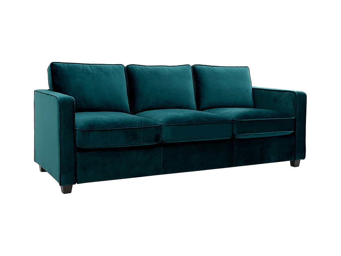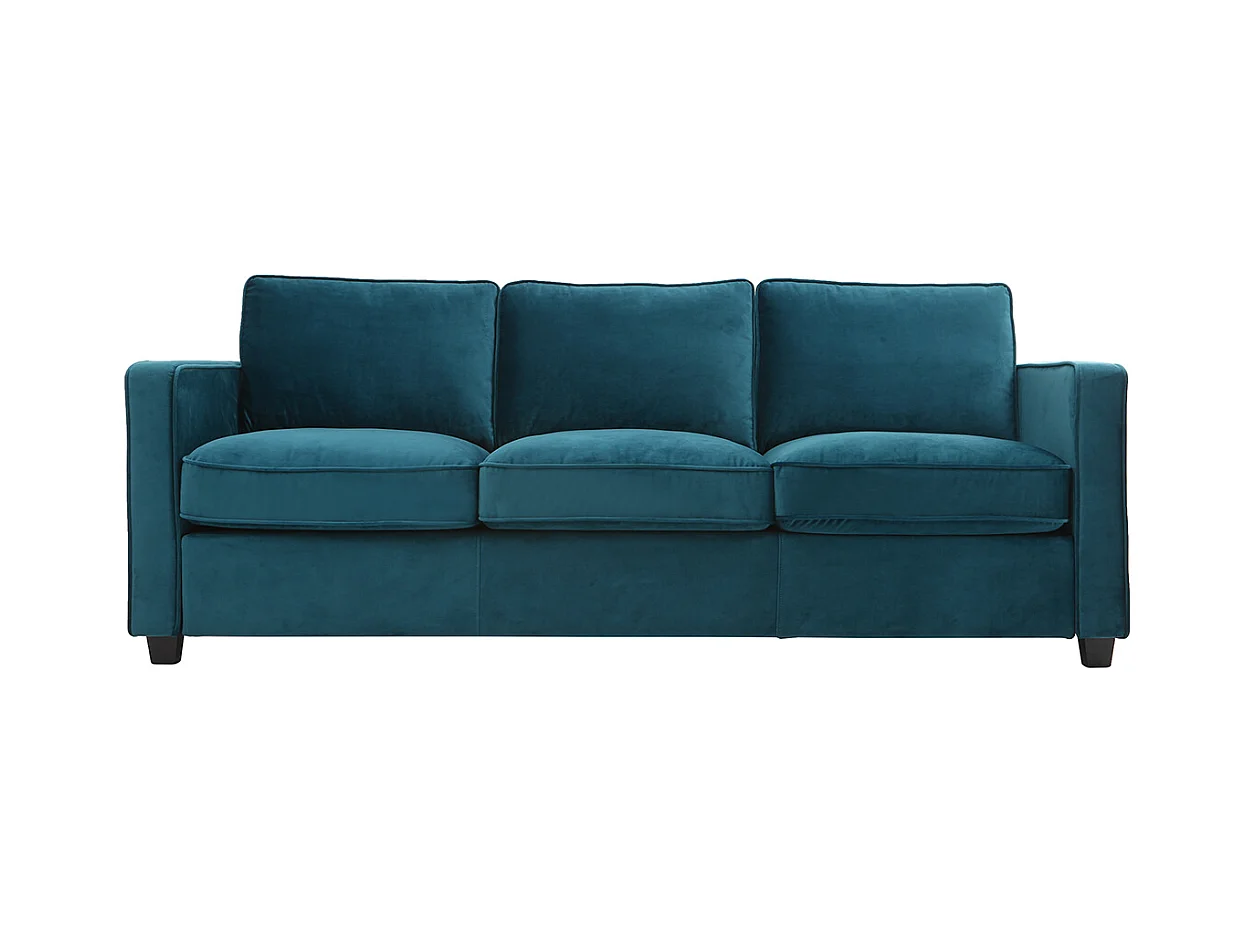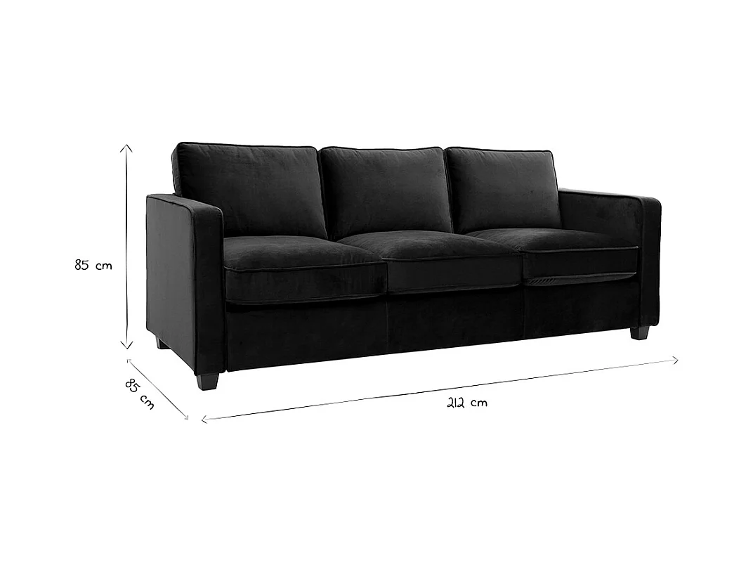 Canapé design 3 places en tissu velours bleu pétrole et bois noir BROOKLYN