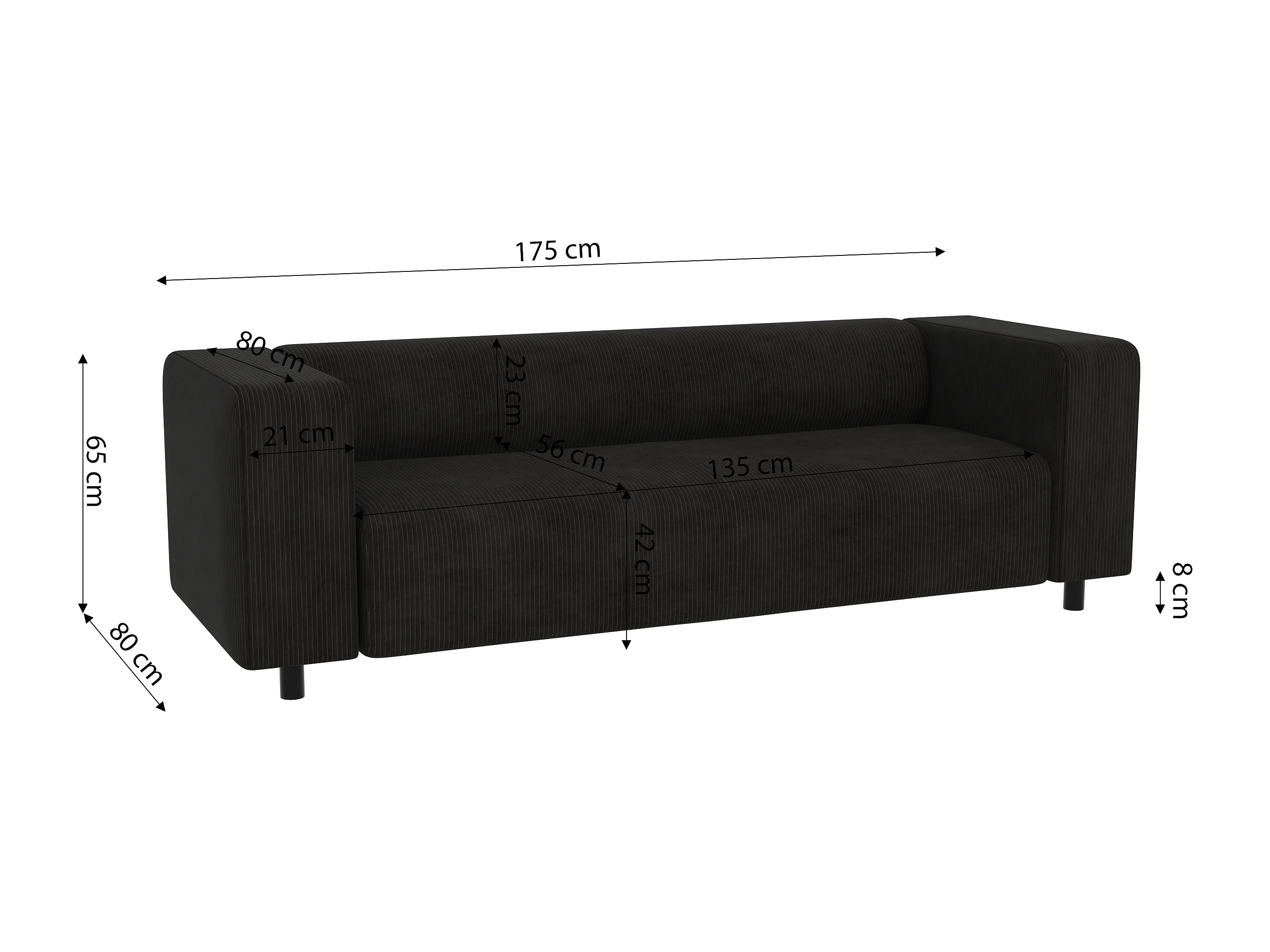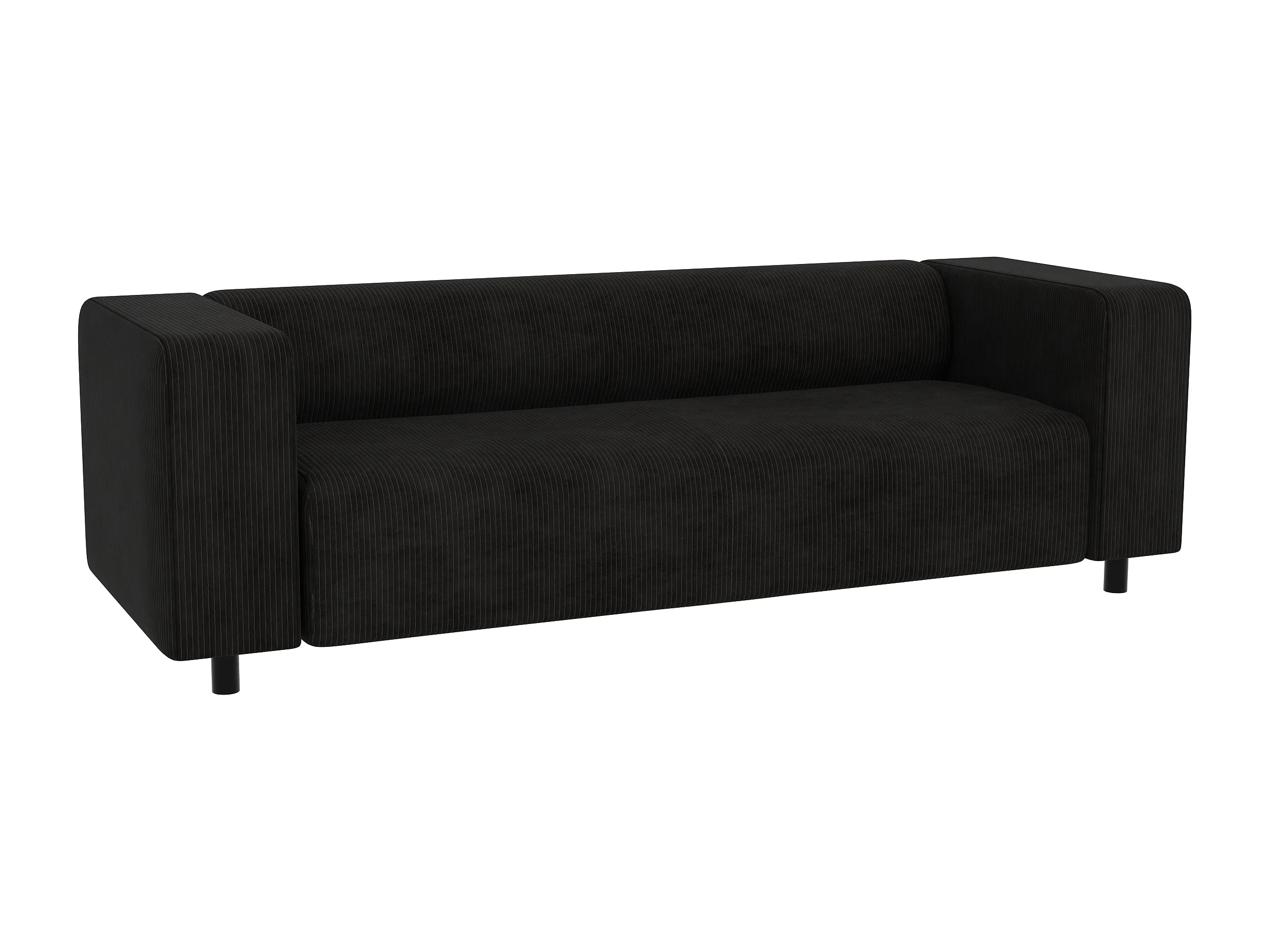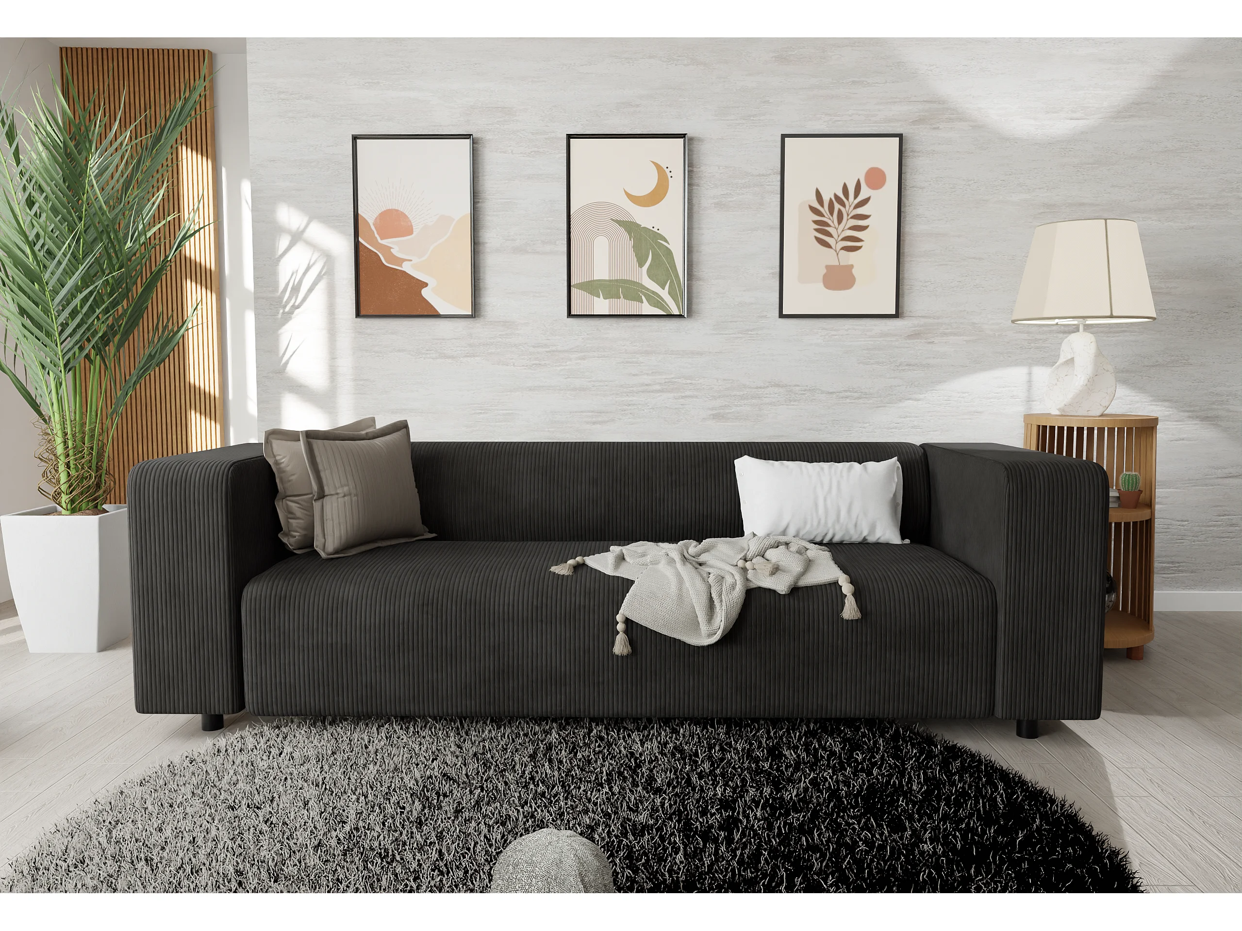 Canapé droit 3 places moderne en velours côtelé noir avec assise confortable THORA
