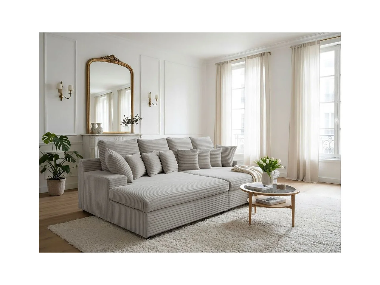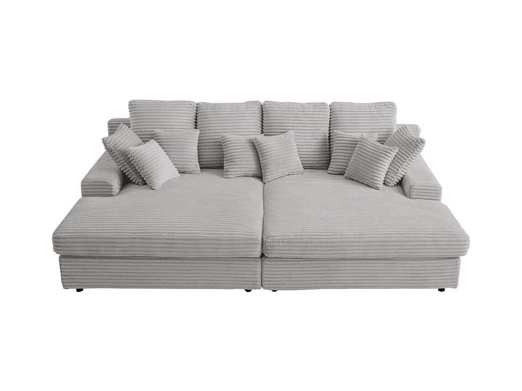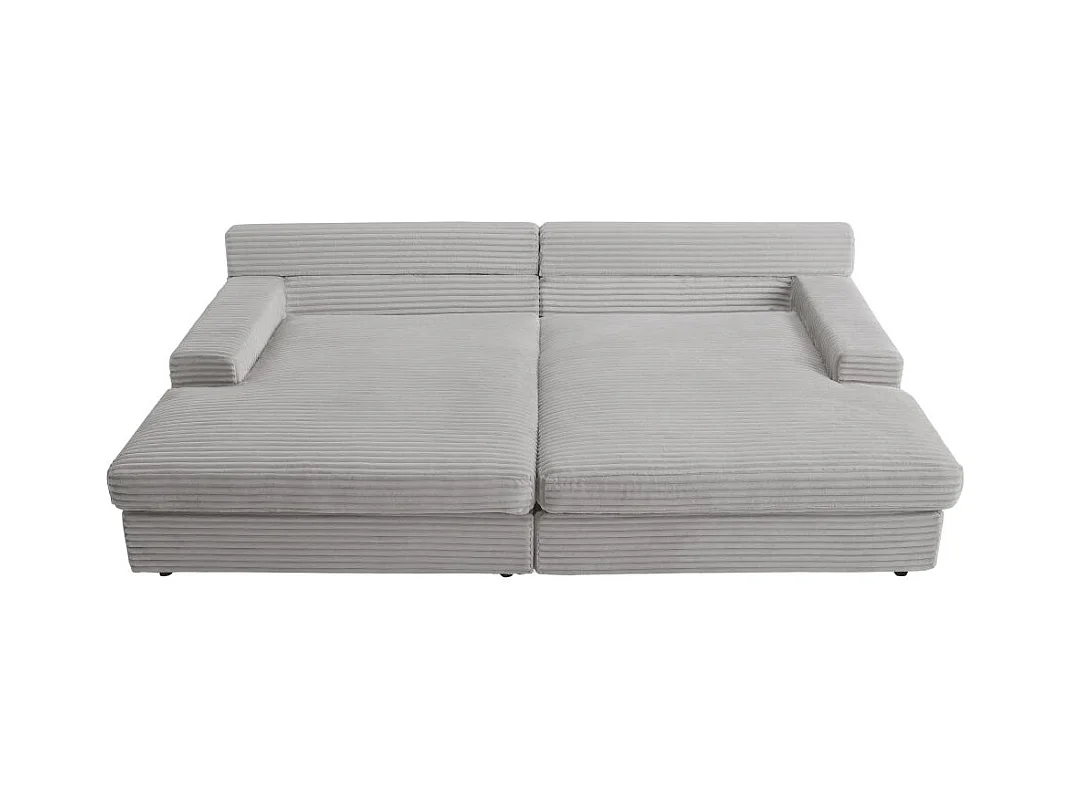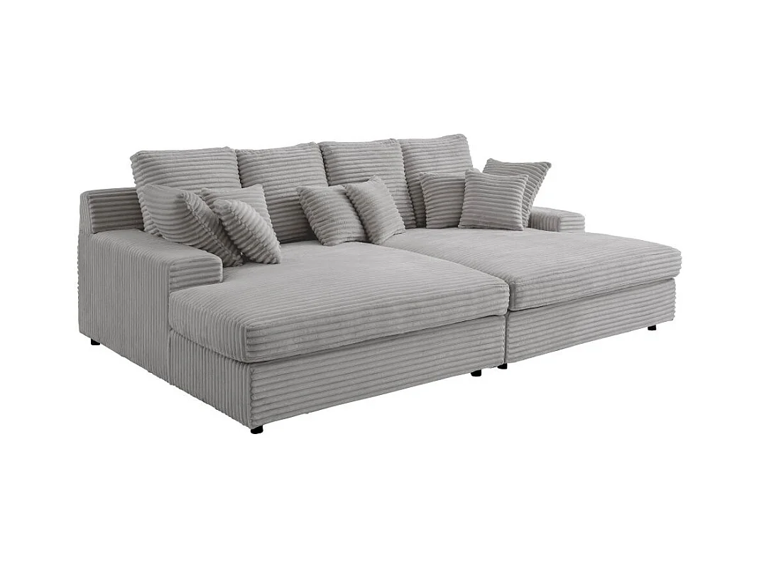 Canapé droit 4 places FLUFFY double méridienne et assise profonde en velours côtelé - gris clair