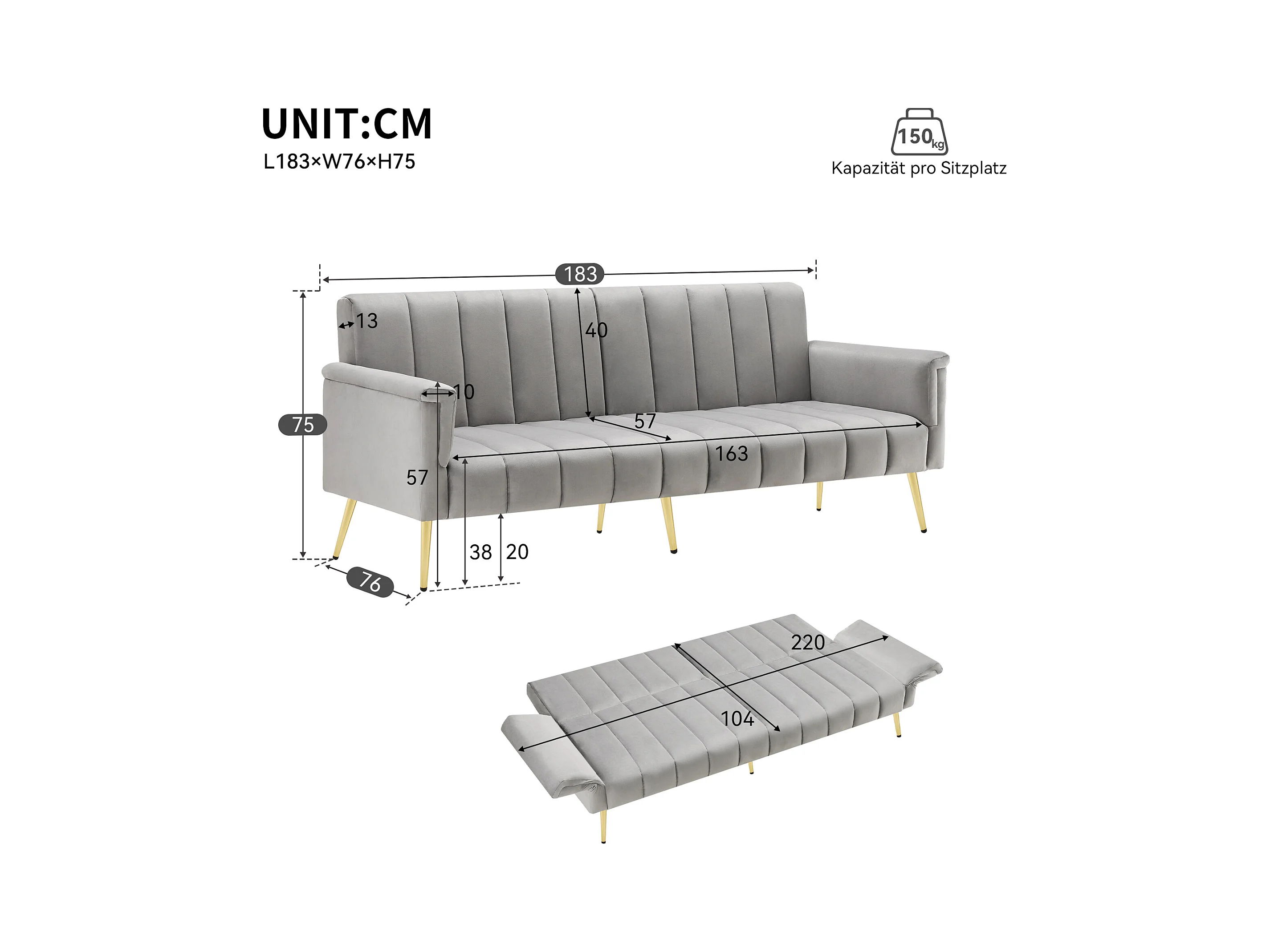 Canapé droit gris - Canapé pliant avec dossier et accoudoirs réglables - pour salon et chambre