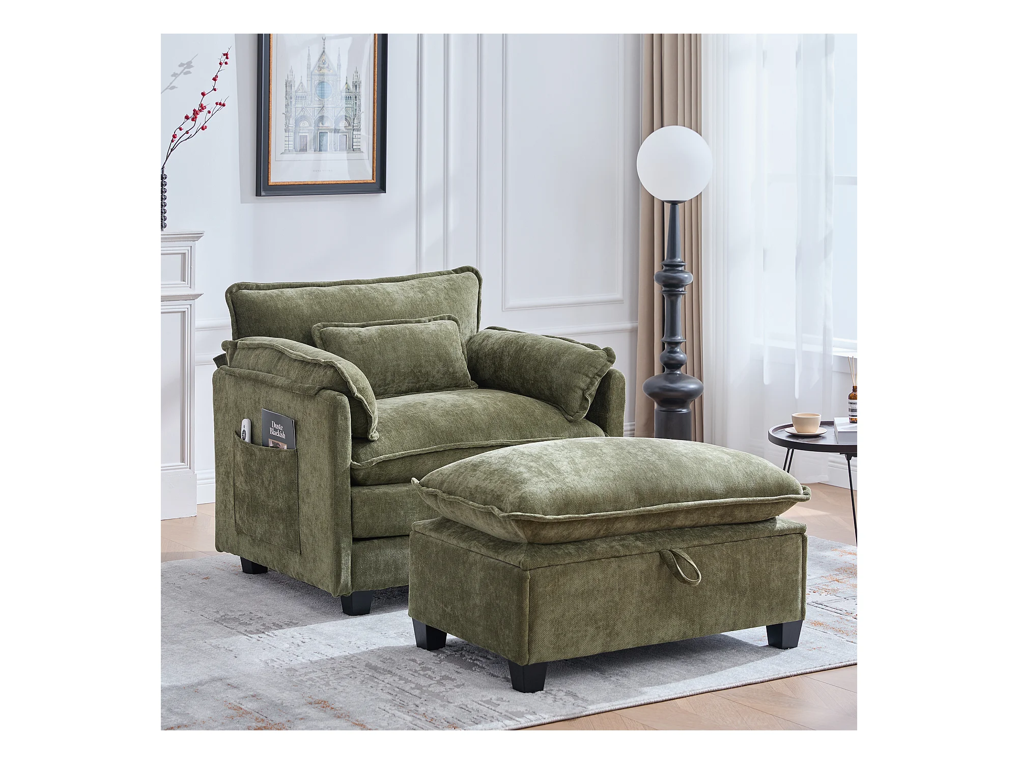 Canapé droit vert - Canapé avec poches latérales et repose-pieds de rangement - pour salon et chambre