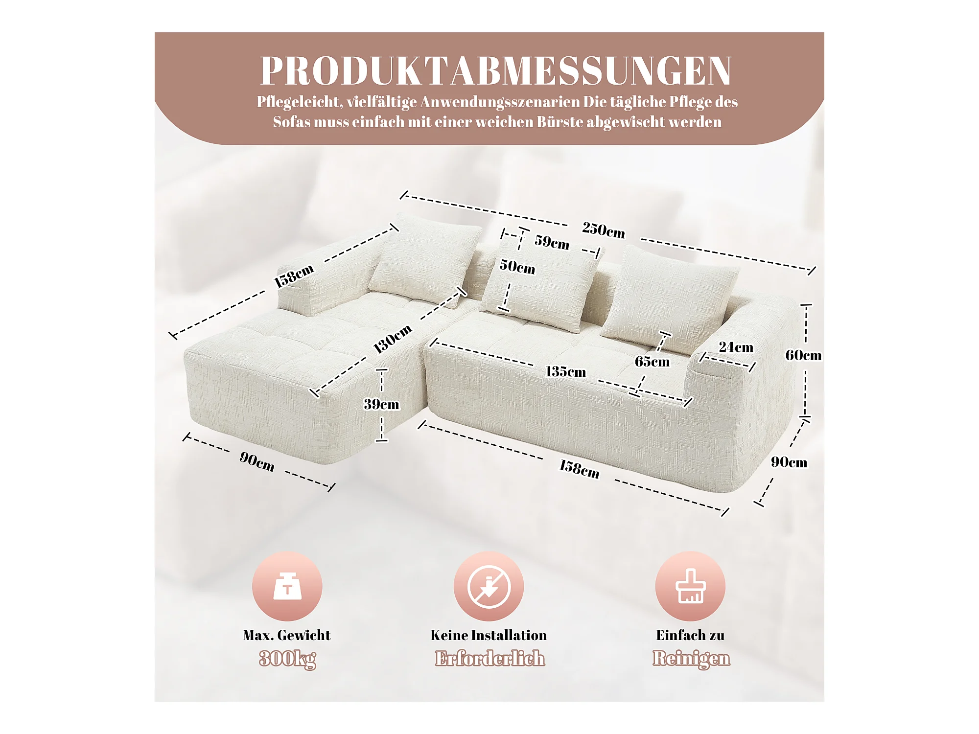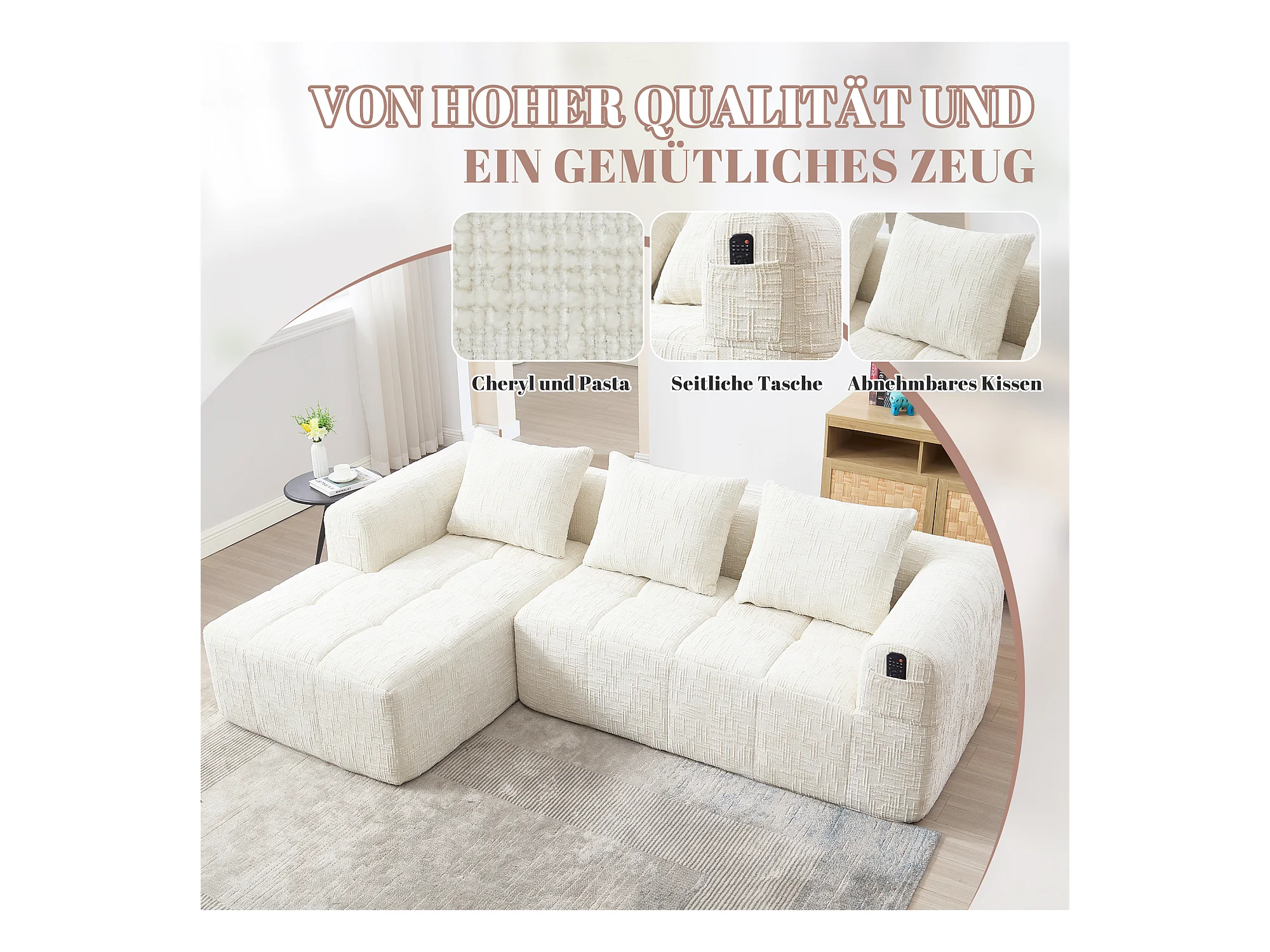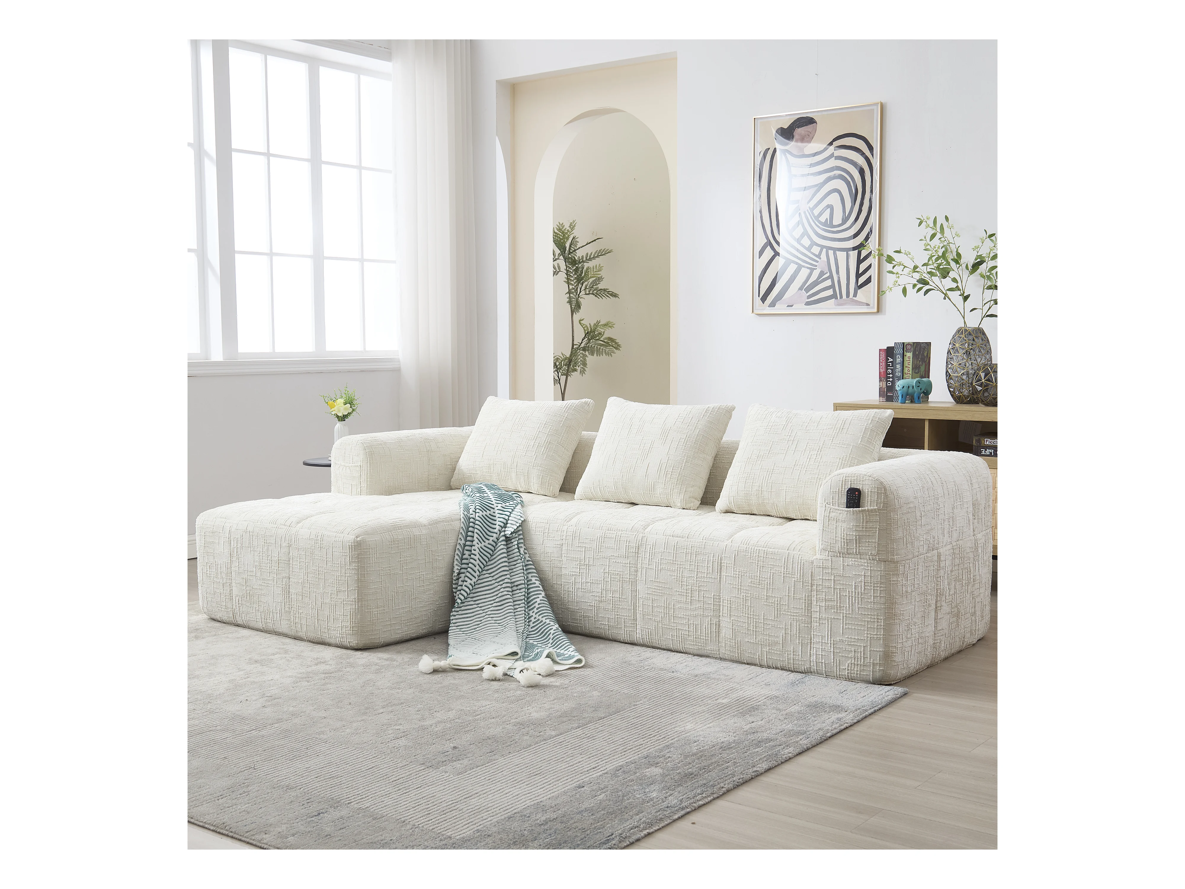 Canapé en L 3 places - 250 x 158 x 60 cm - avec méridienne + accoudoirs + 3 coussins - Chenille - beige