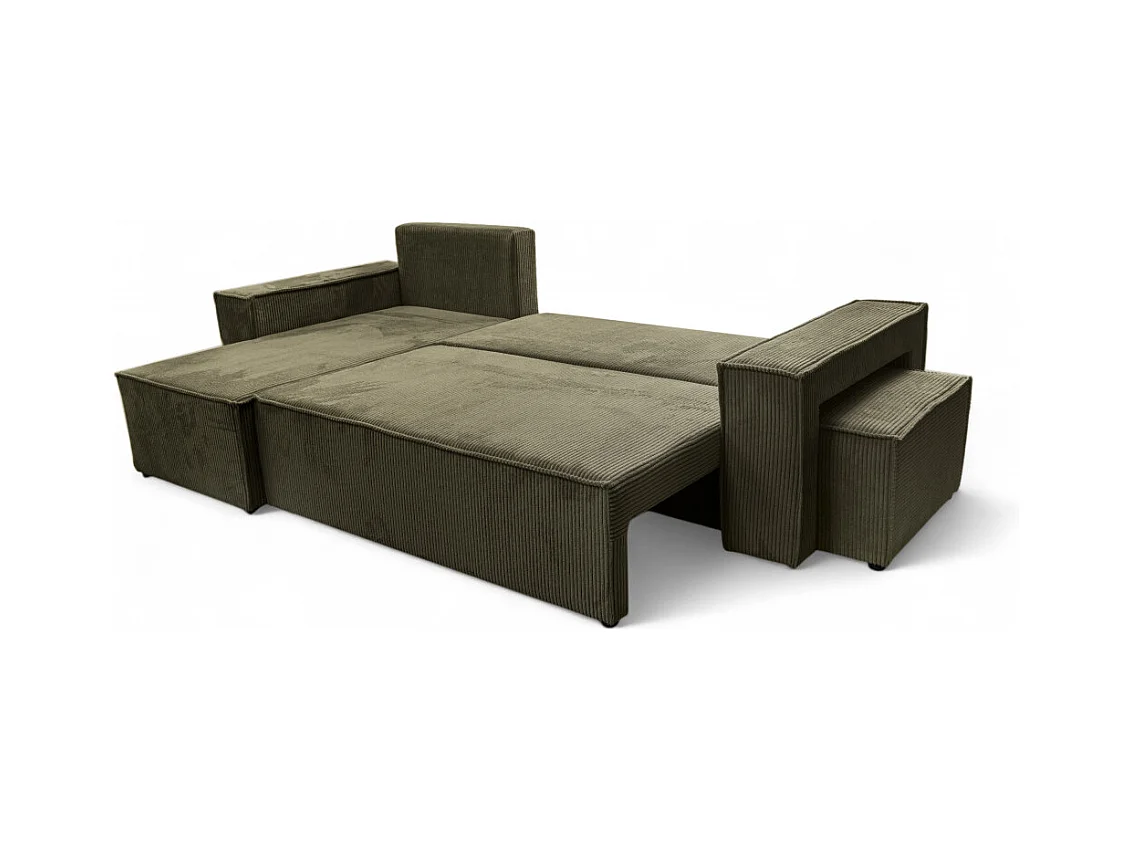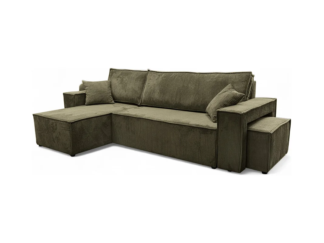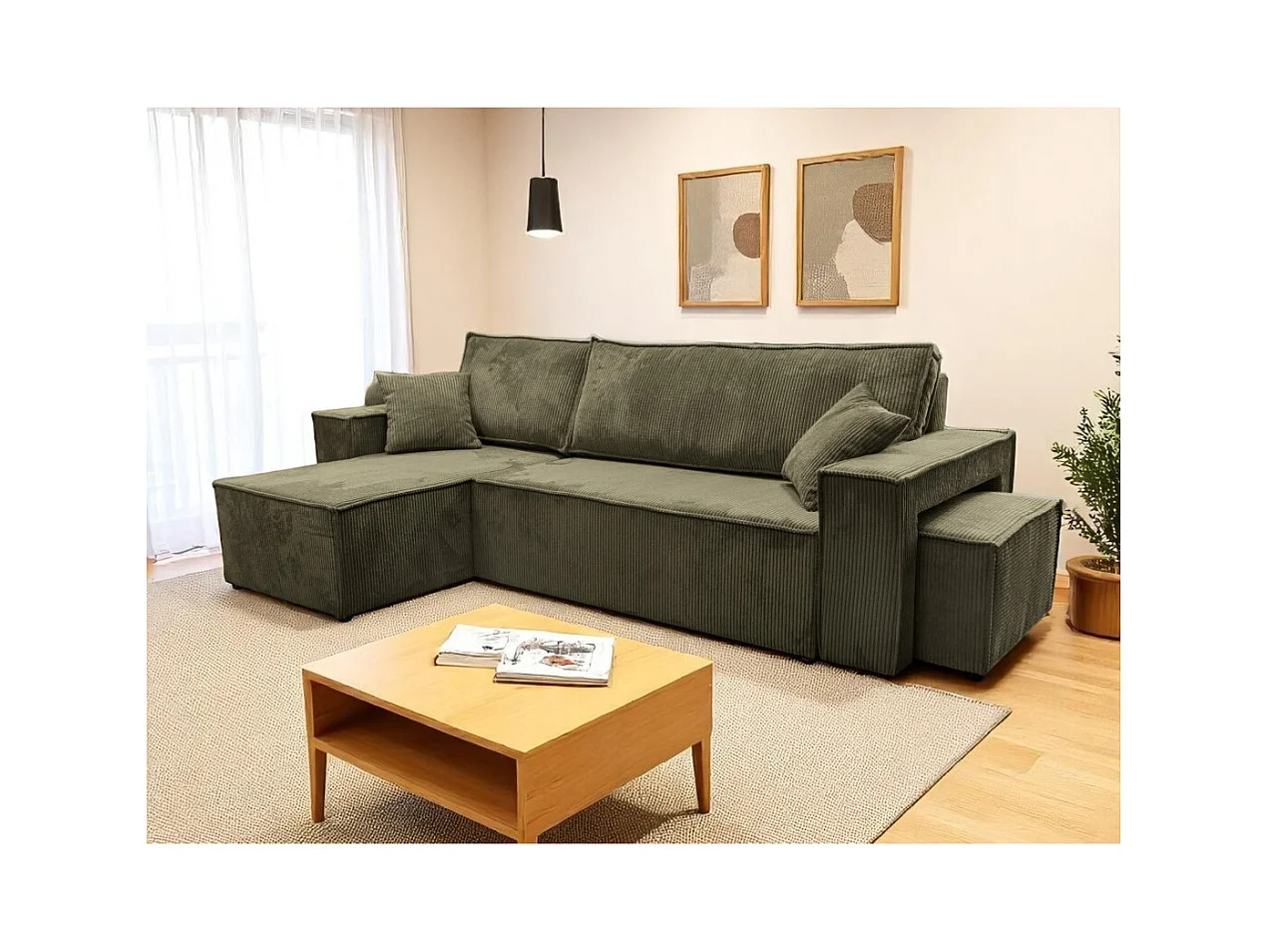 Canapé FARAH d'angle réversible et convertible 4 places avec un pouf en velours côtelé - Vert kaki