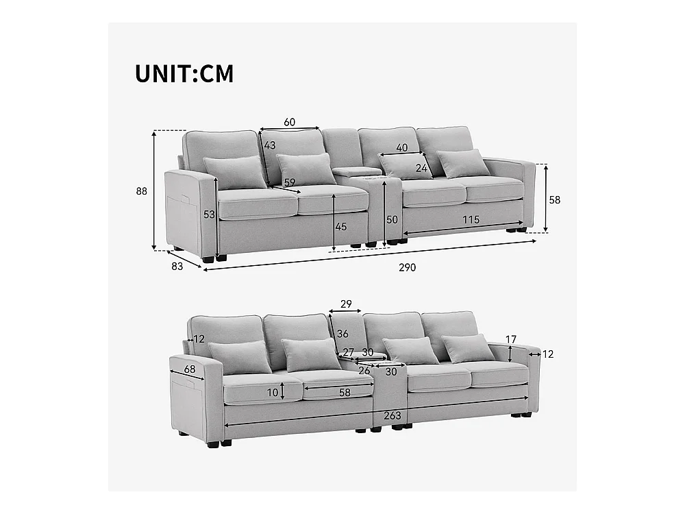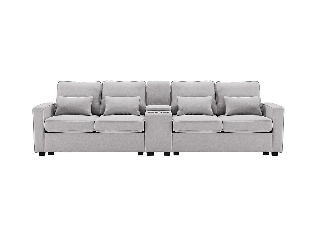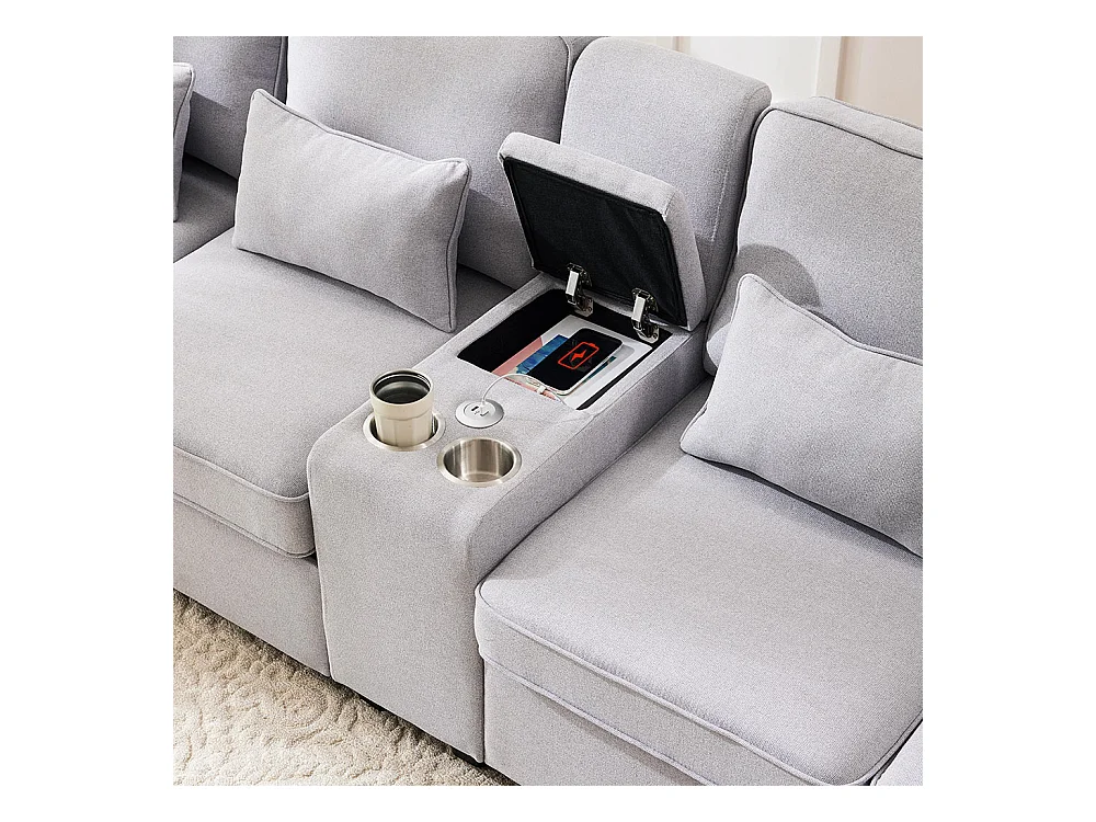 Canapé fixe 4 places avec console 2 porte-gobelets 2 ports USB pour recharger avec un câble avec poches d'accoudoirs lin Gris