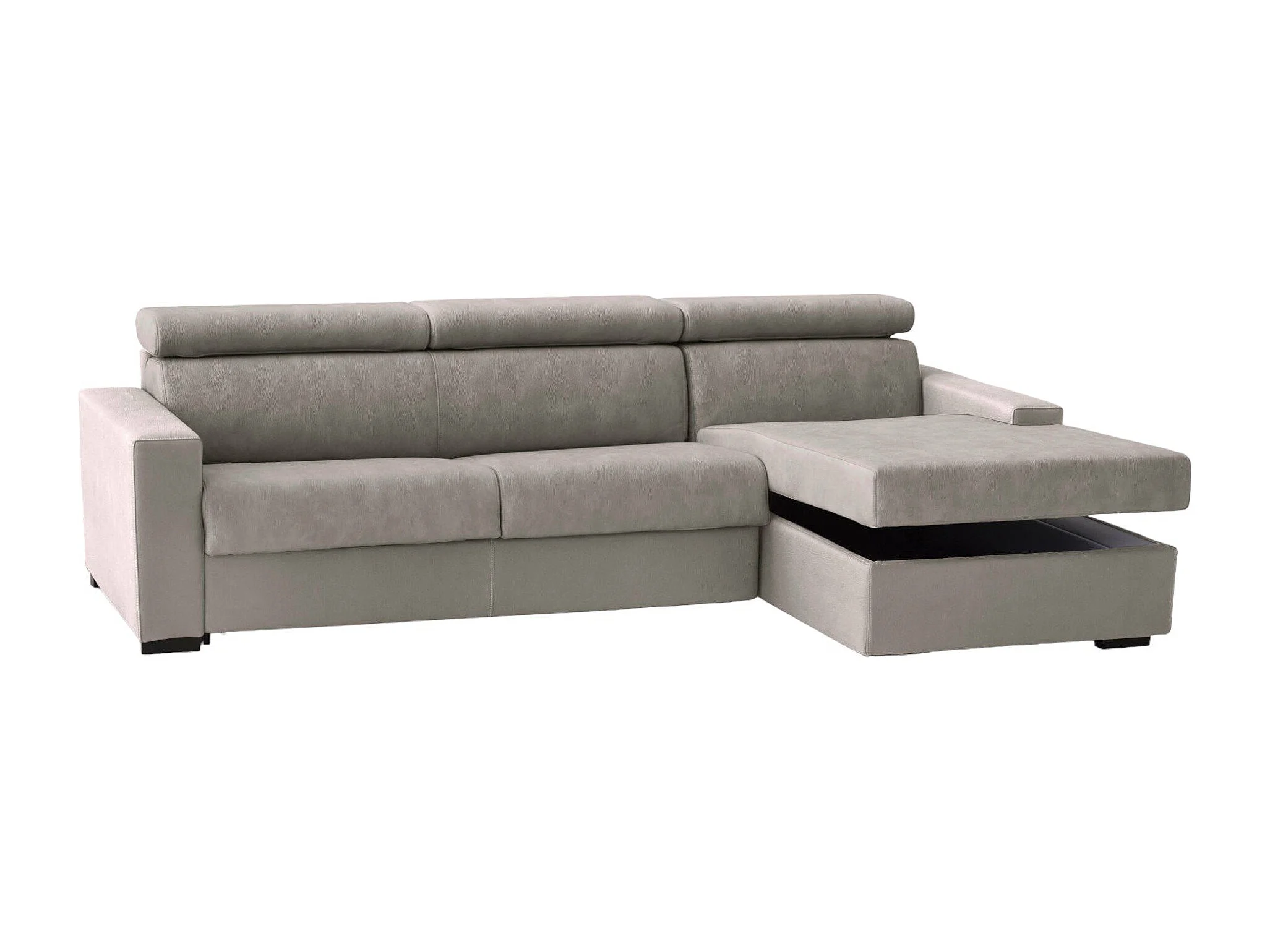 Divano fisso con penisola Mikaela, Sof ad angolo con chaise longue destra in tessuto, Braccioli slim, 100% Made in Italy, Cm 280x95h85, Tortora