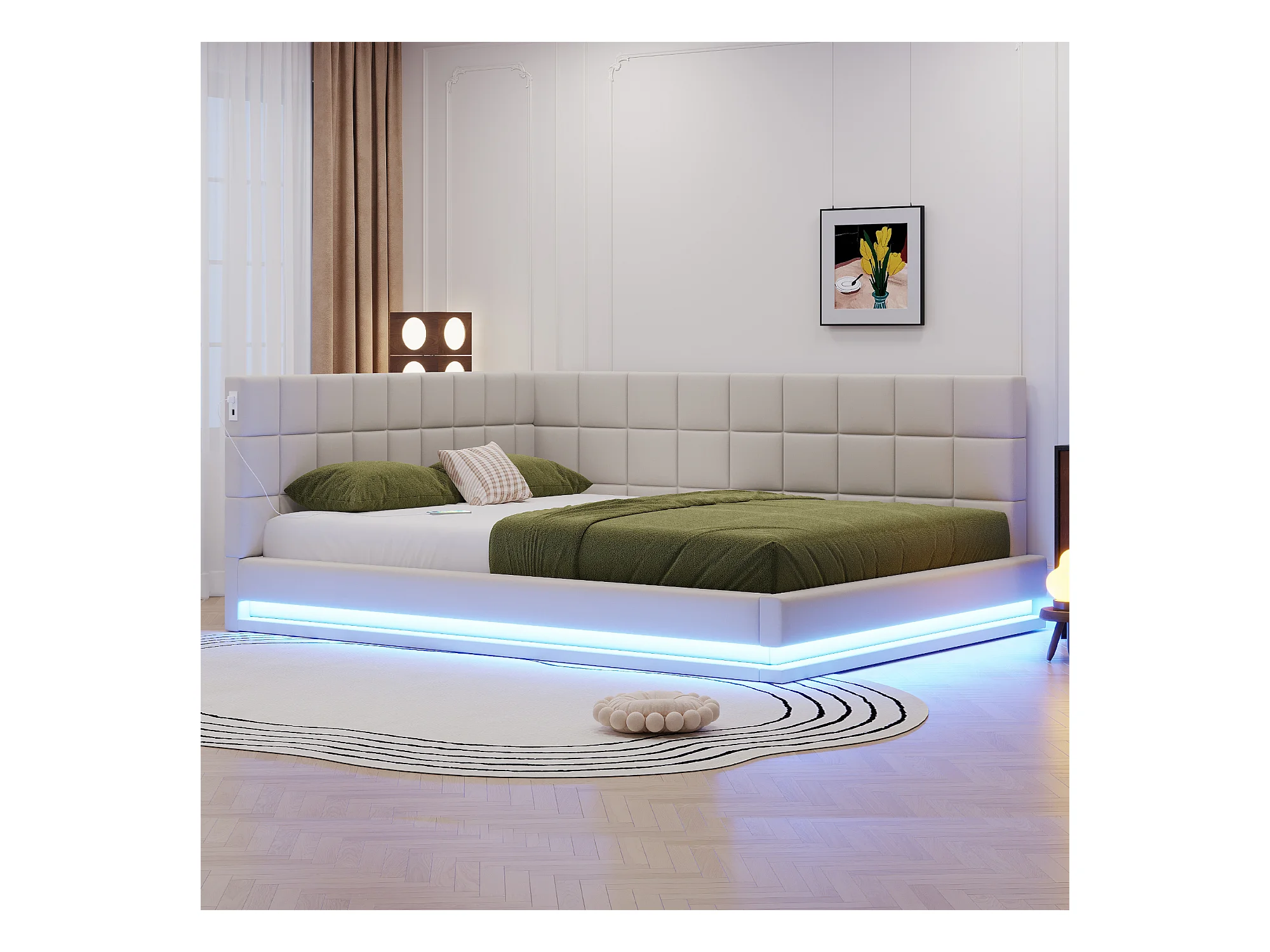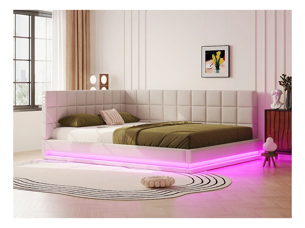 Canapé-lit 160×200 cm en lin beige avec éclairage LED, USB et sommier robuste